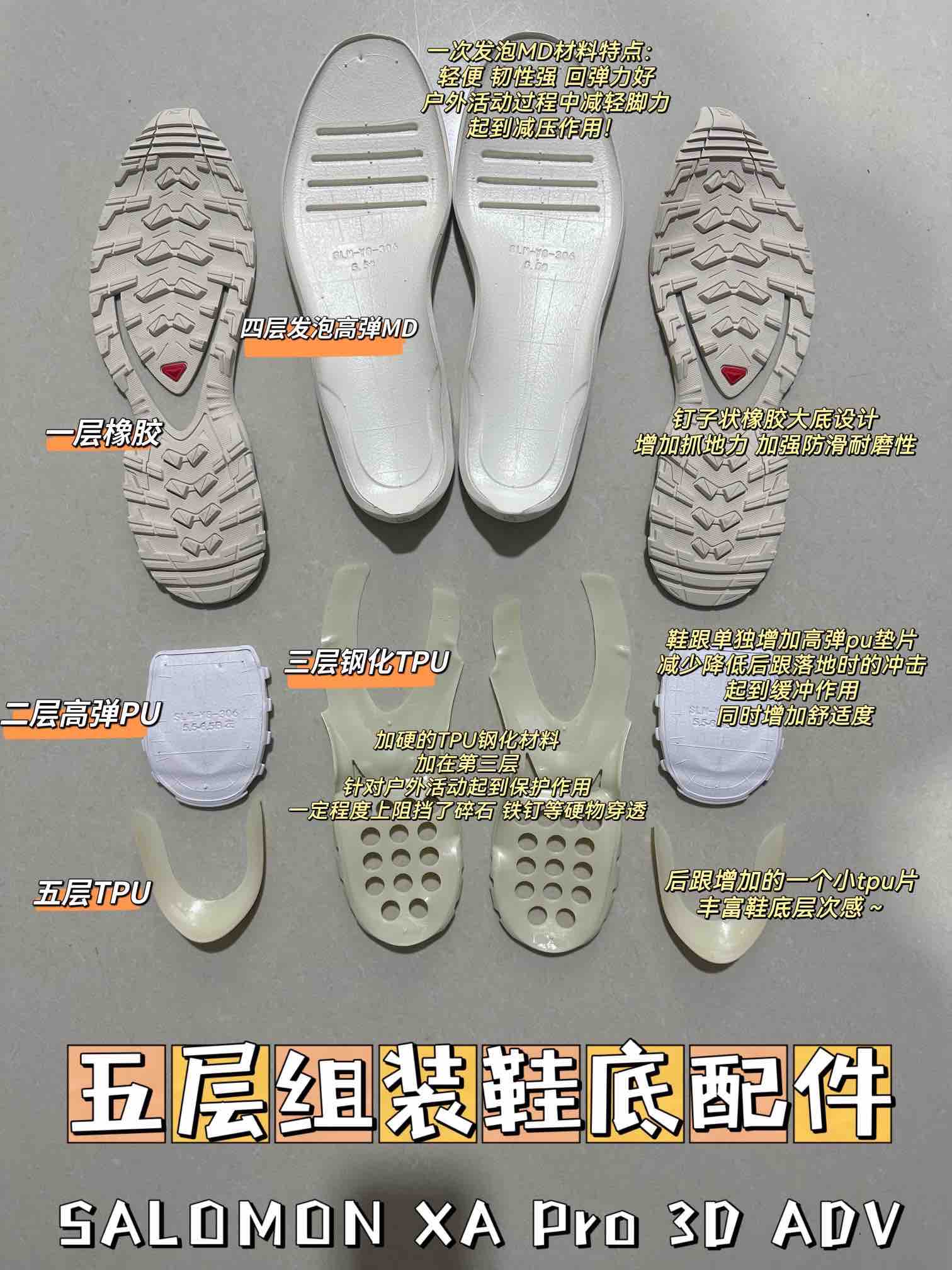 一层橡胶+二层二次发泡md+三层tpu+四层二次发泡+五层防护tpu!提供足部的减震跟稳定性!