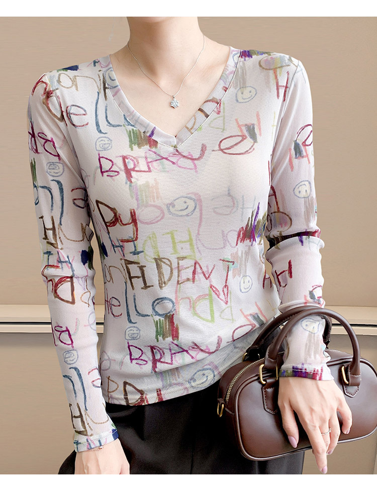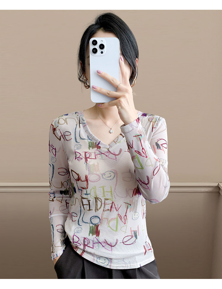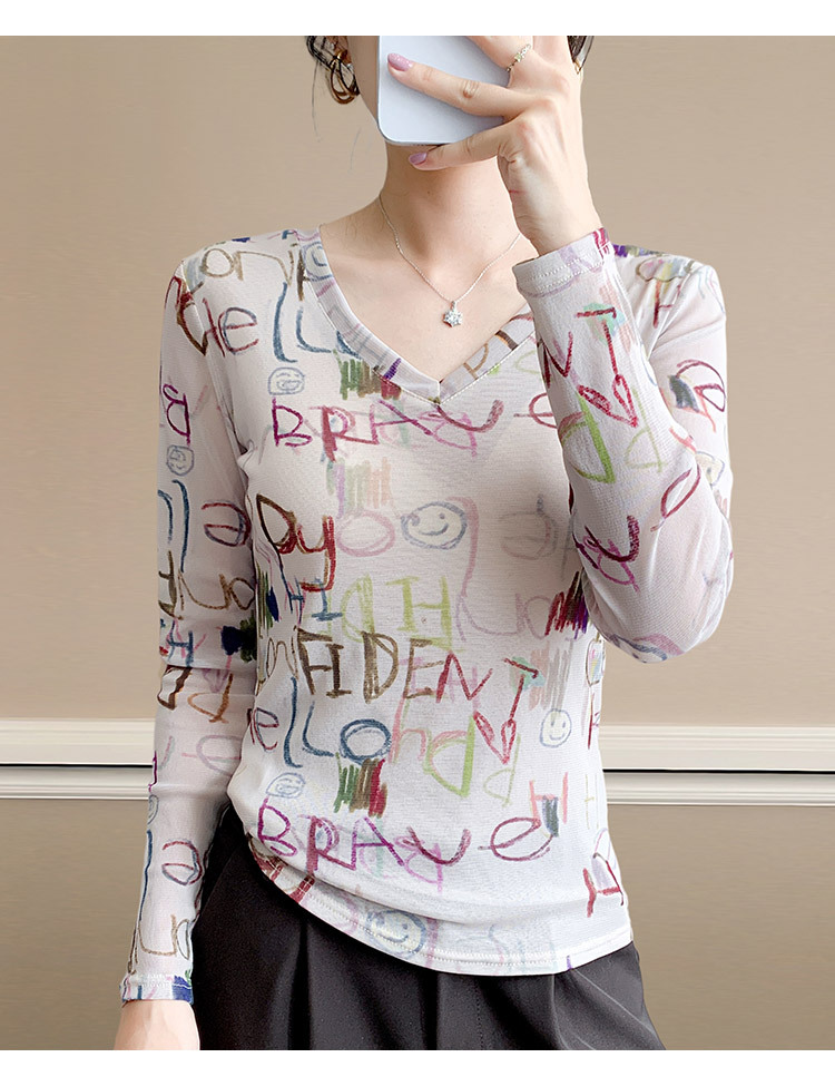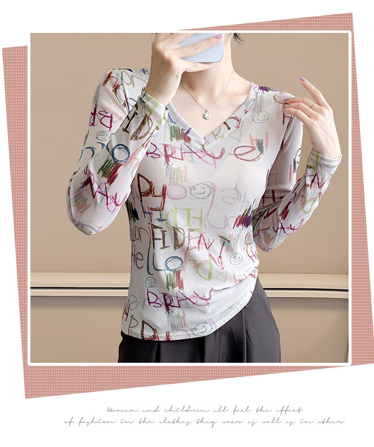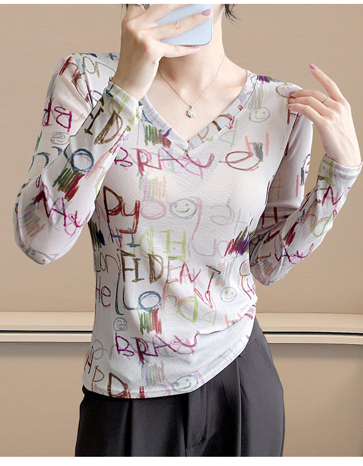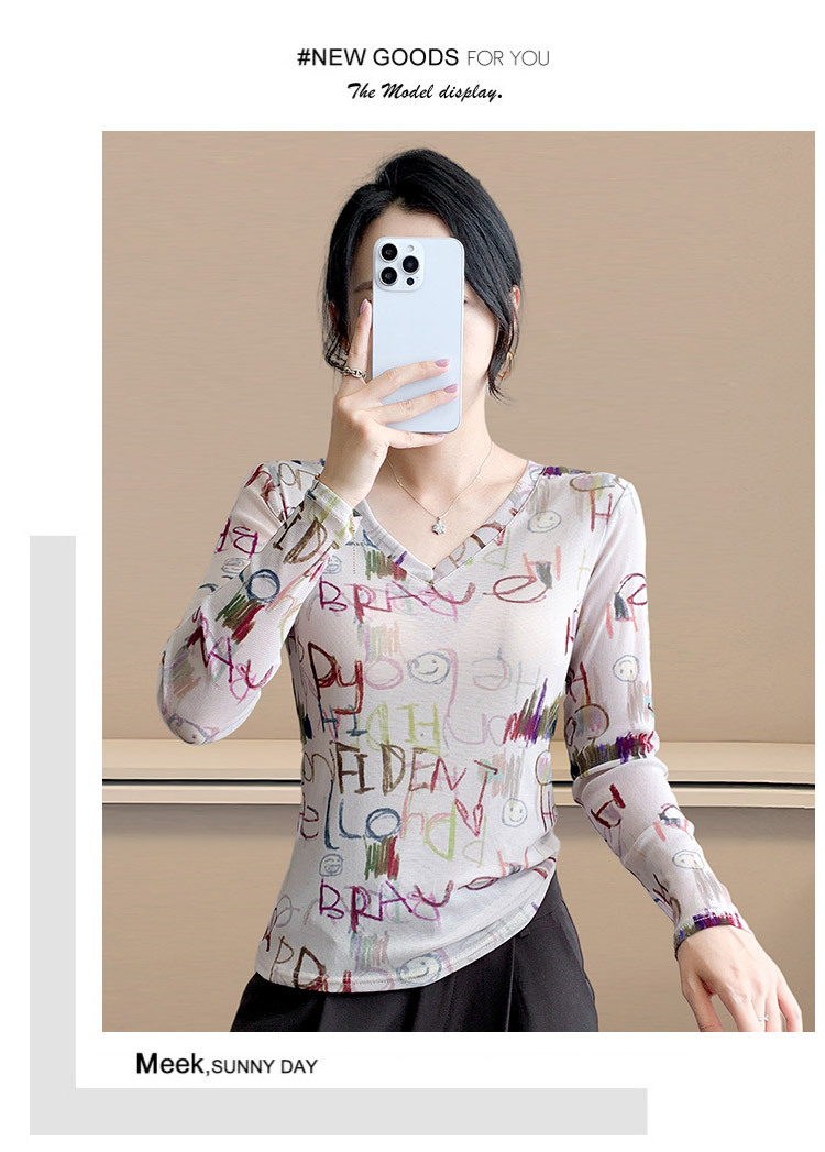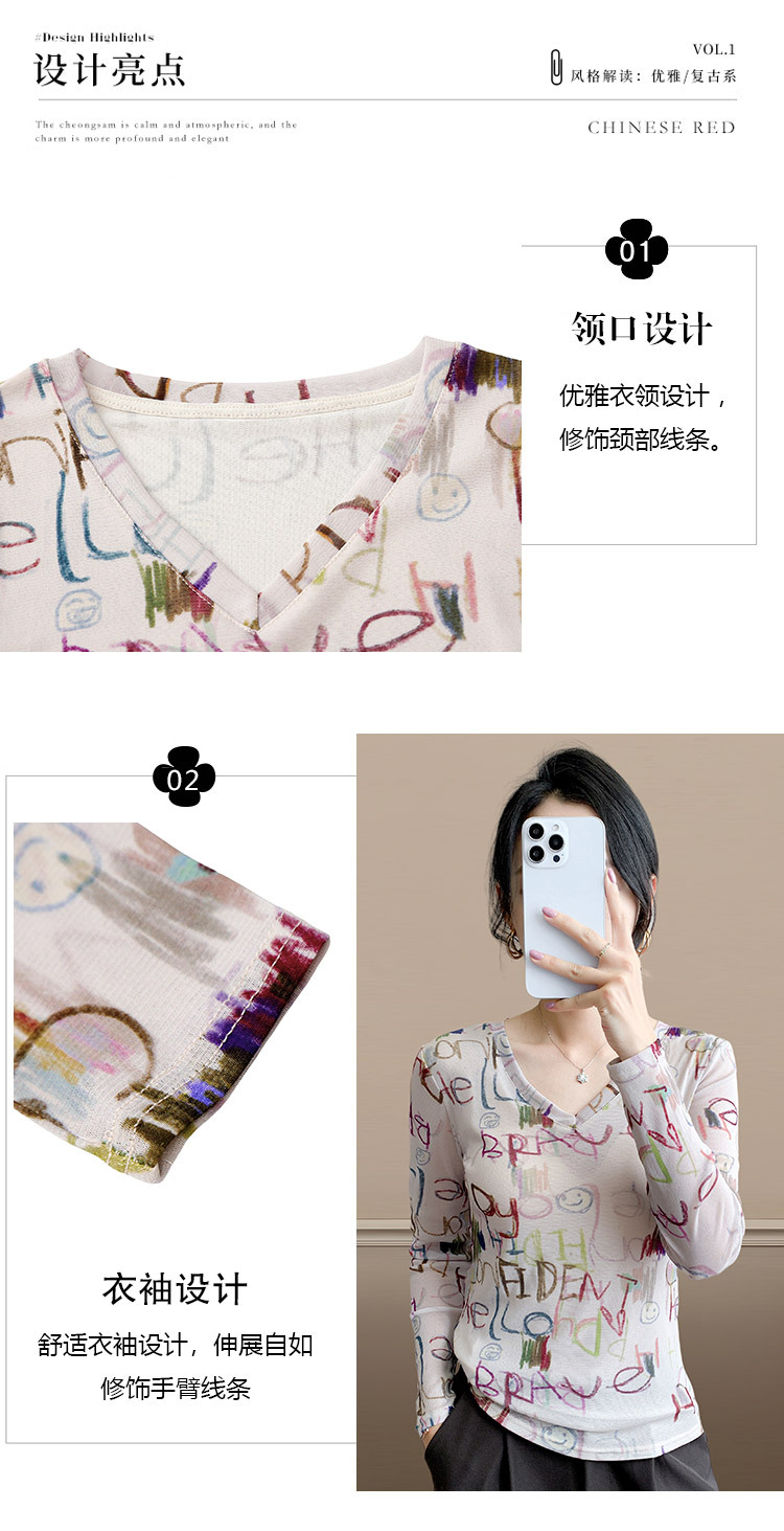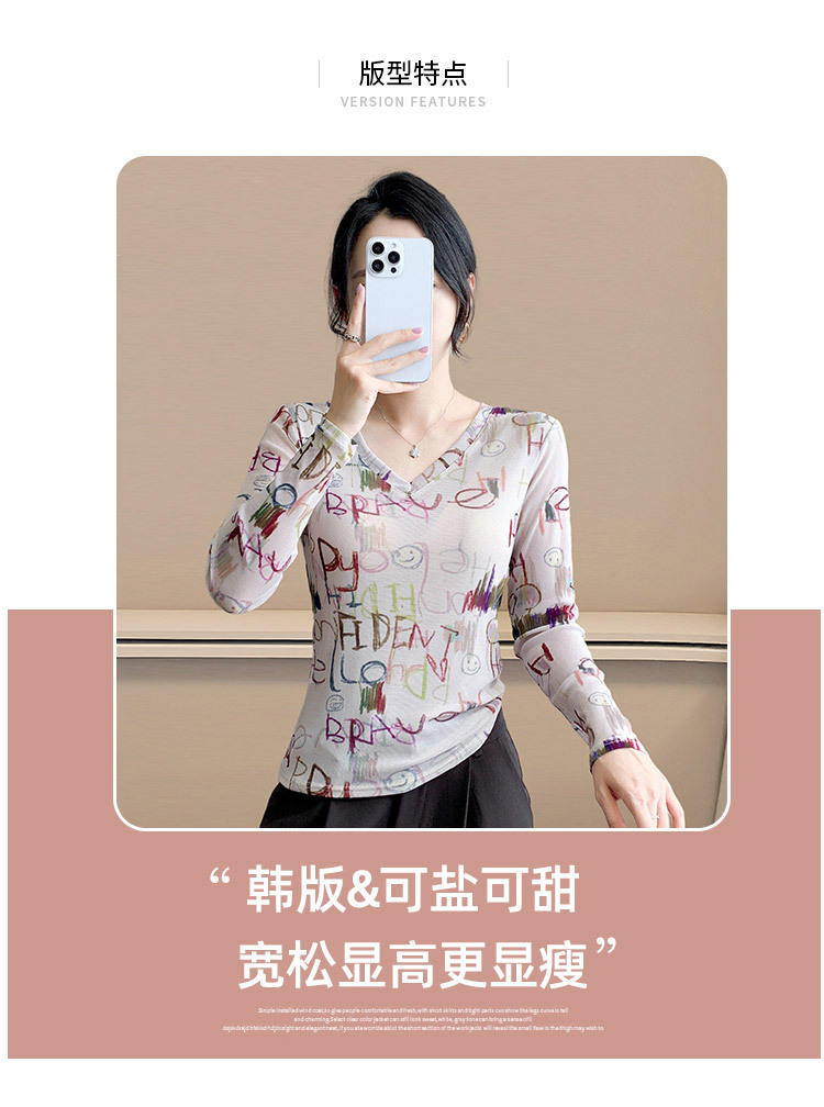 KQL欧货女装2025秋冬时尚洋气高弹网长袖印花V领T恤打底衫上衣批发