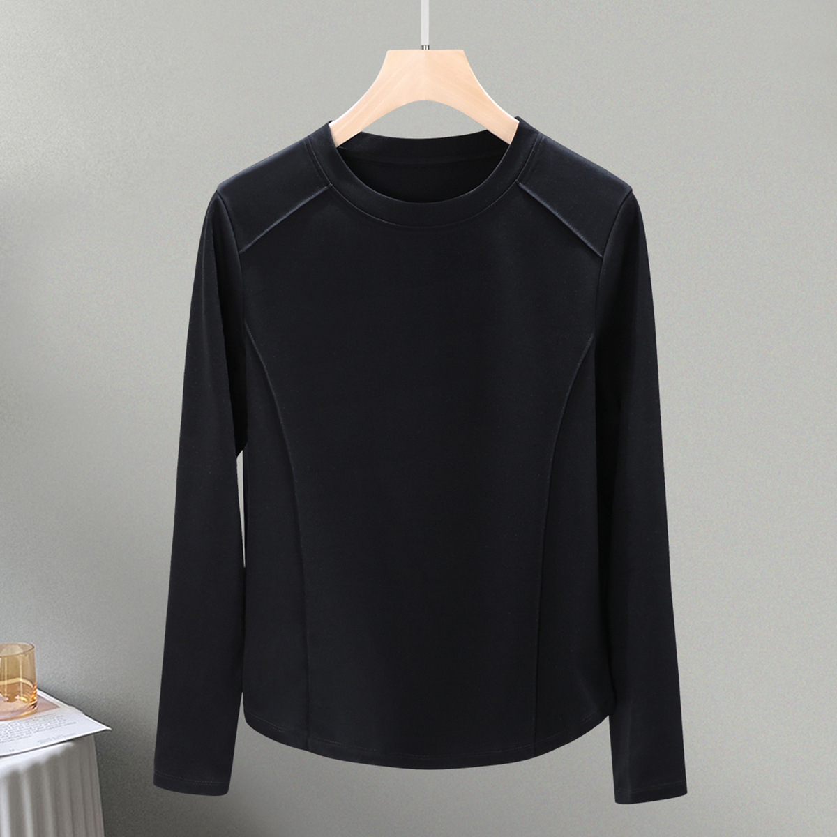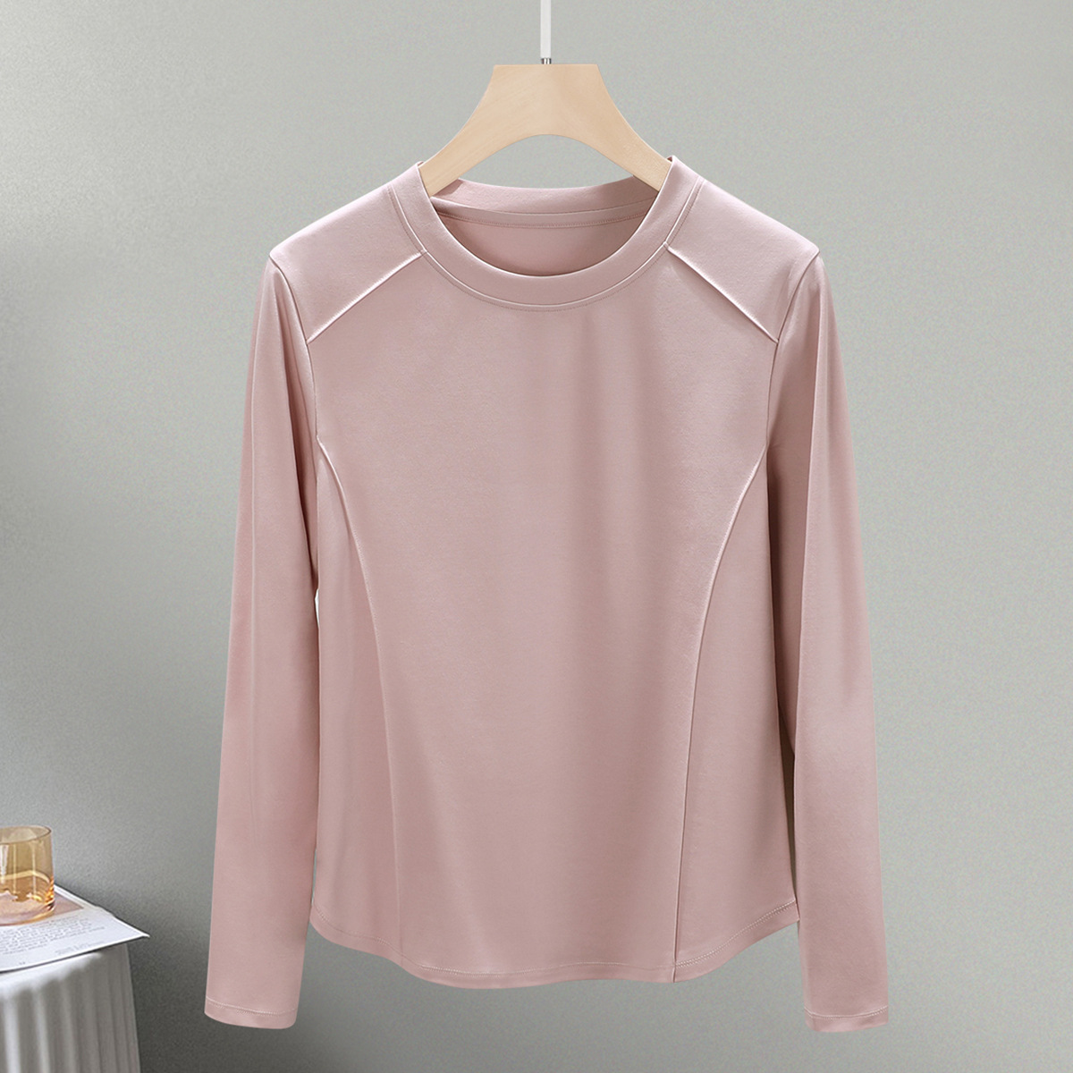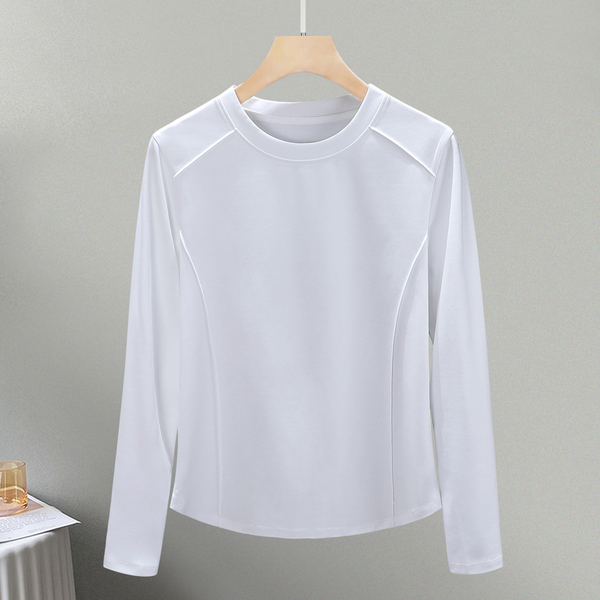 丁摩 圆领丝光棉长袖T恤女春秋季新款圆弧下摆内搭打底收腰修身上衣5ZF-6811