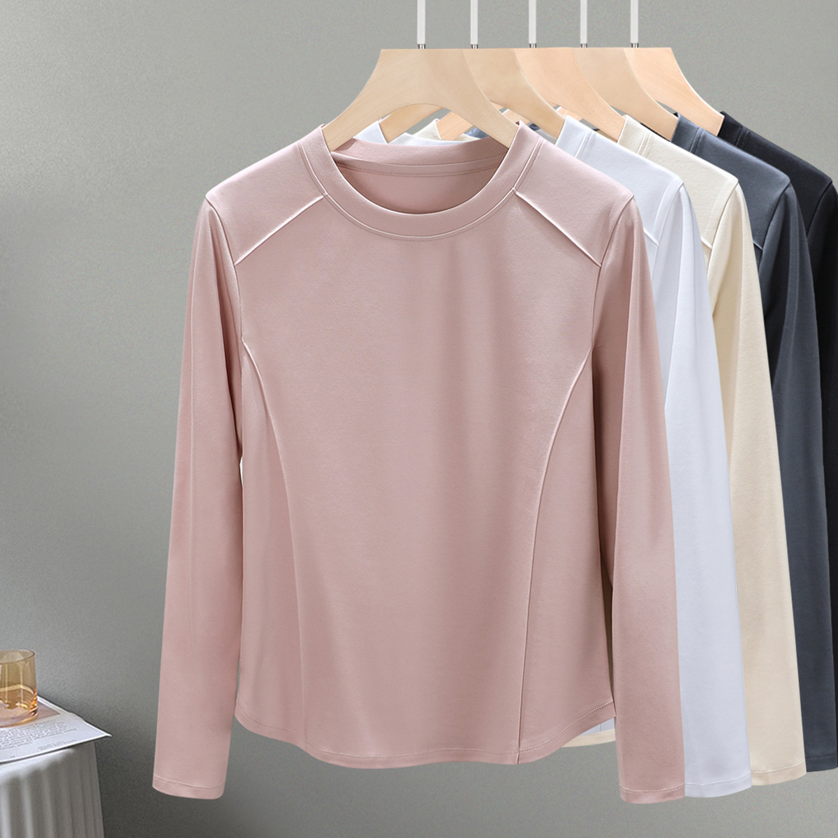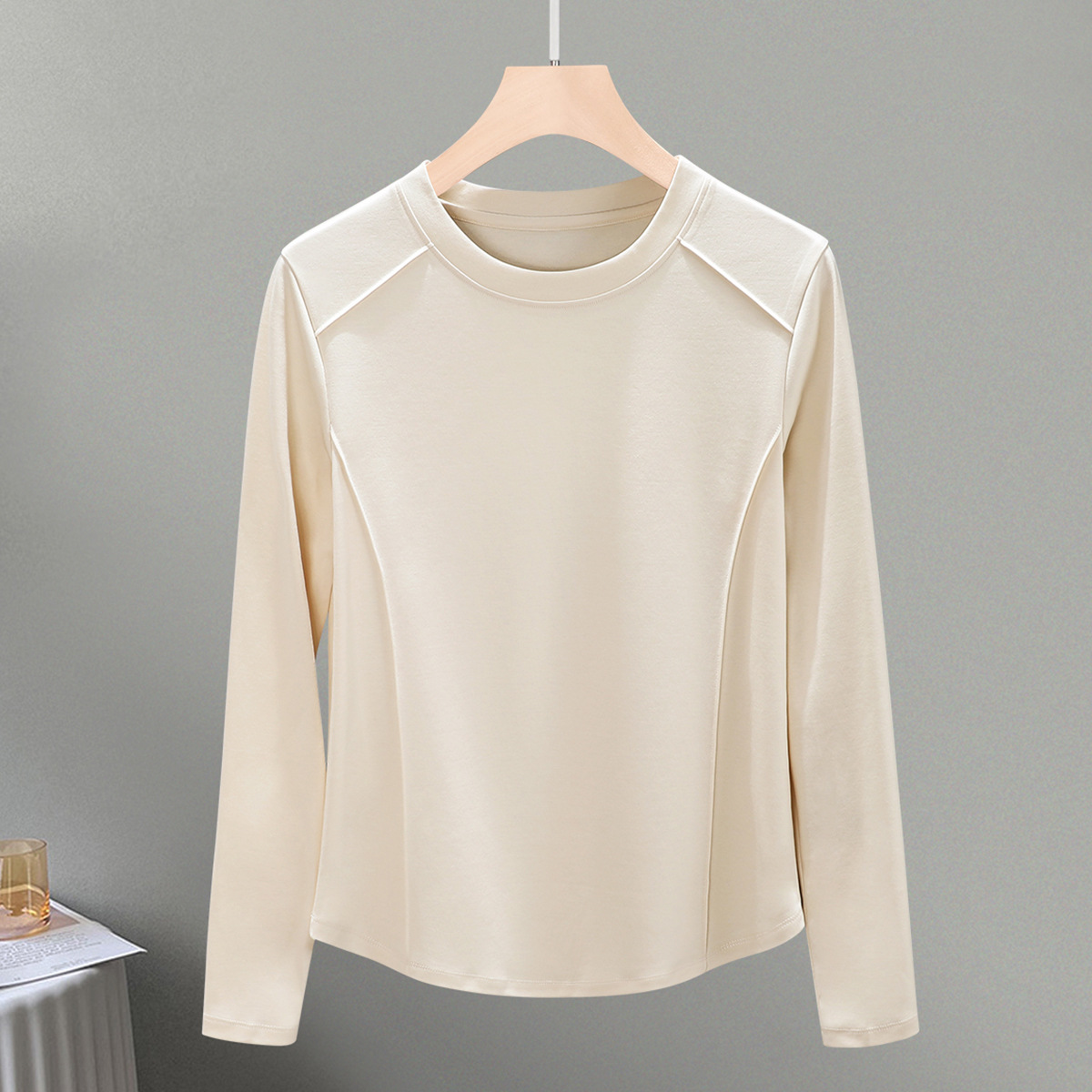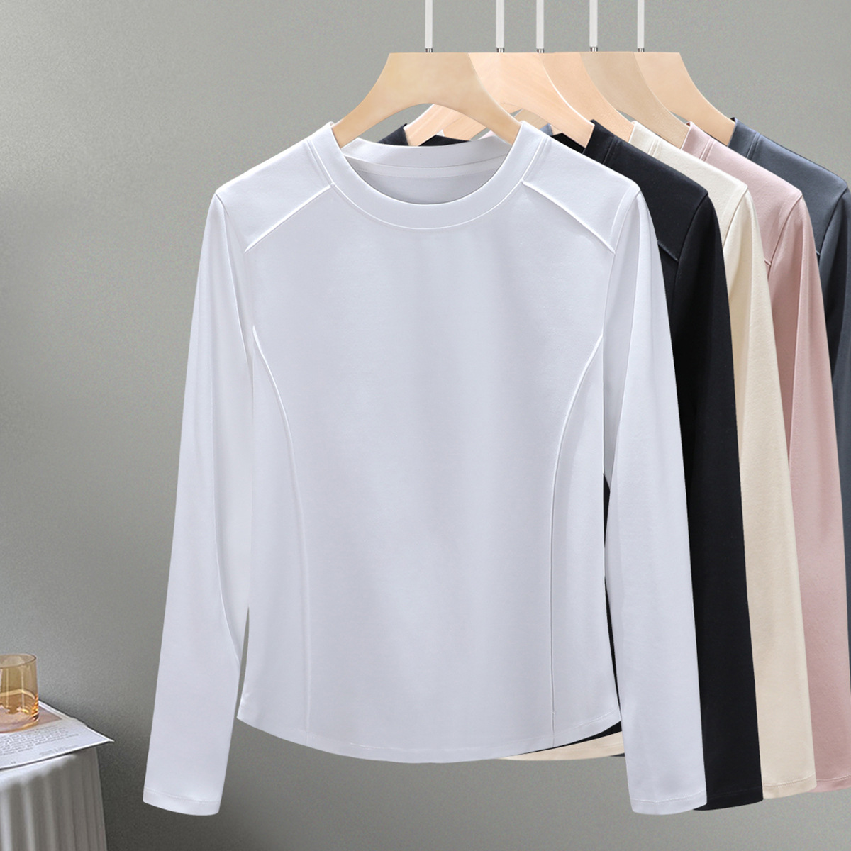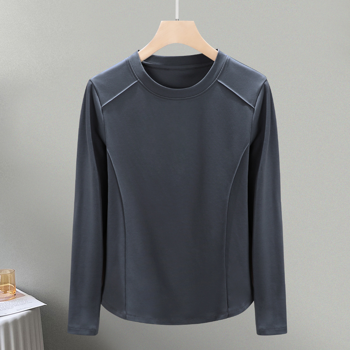 丁摩 圆领丝光棉长袖T恤女春秋季新款圆弧下摆内搭打底收腰修身上衣5ZF-6811