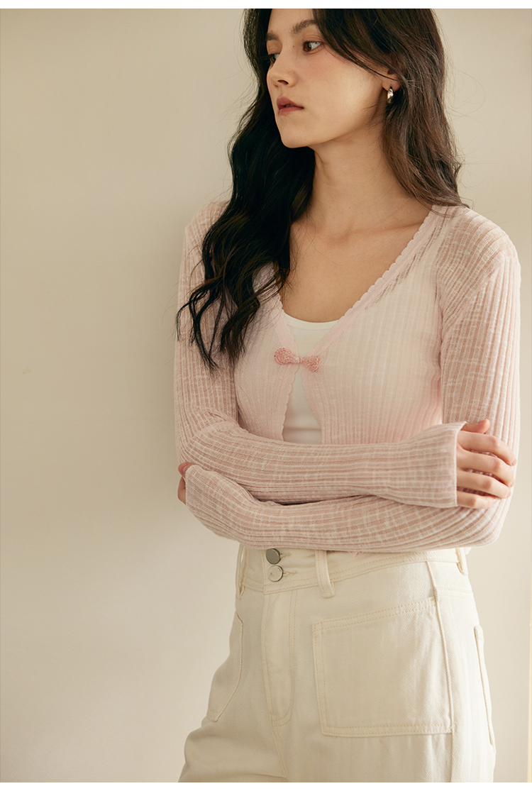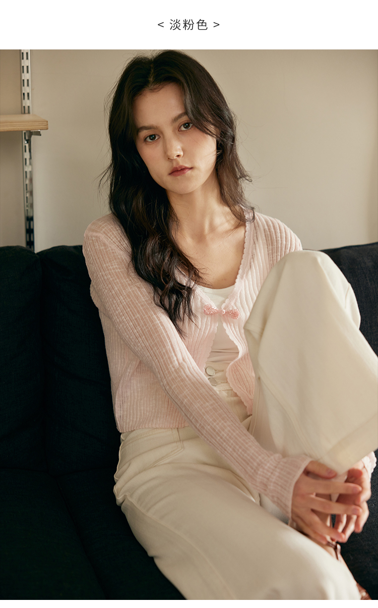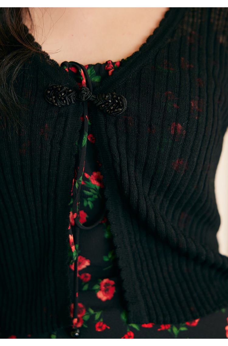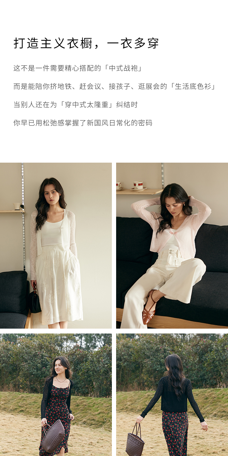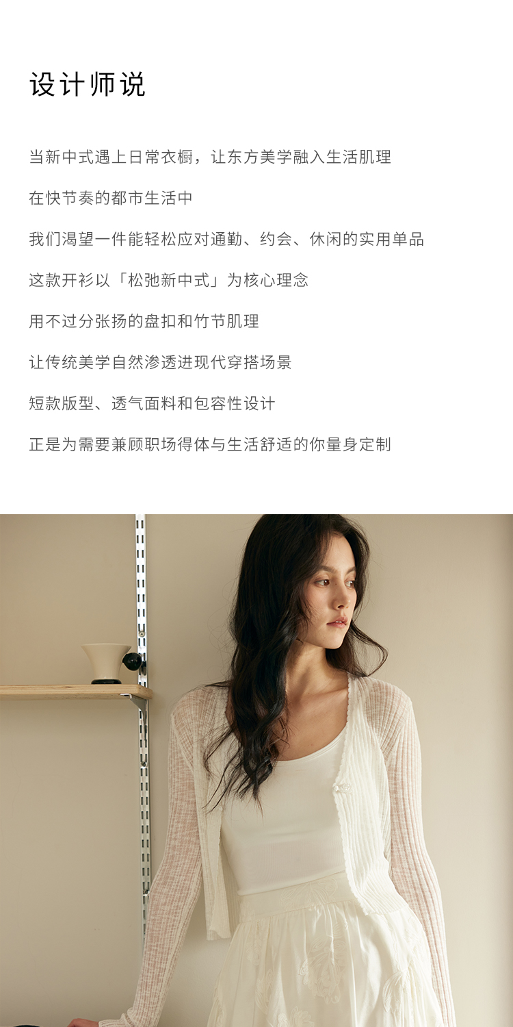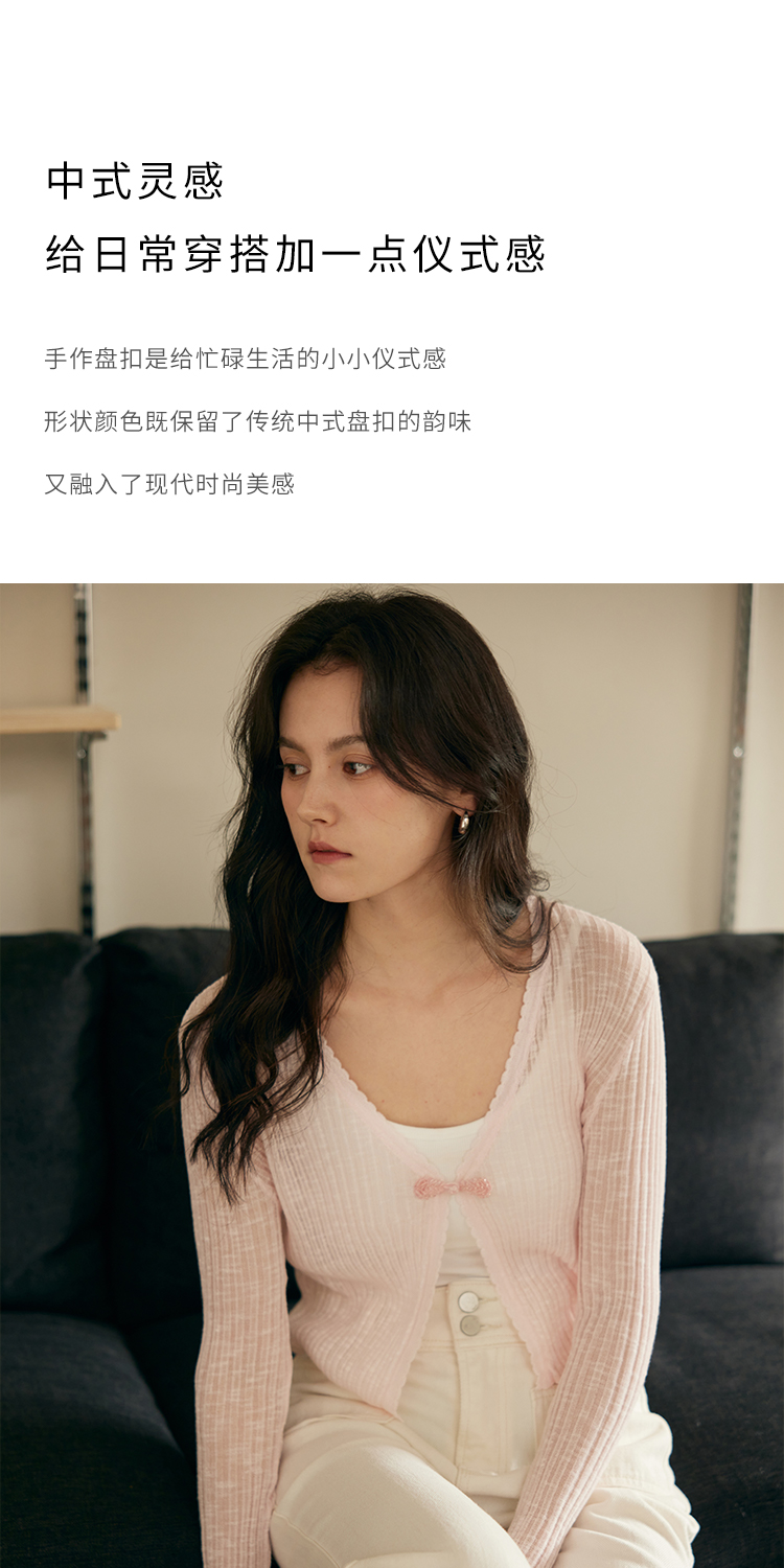 HeyDress新中式盘扣针织开衫女夏季复古V领坑条肌理防晒衫短上衣