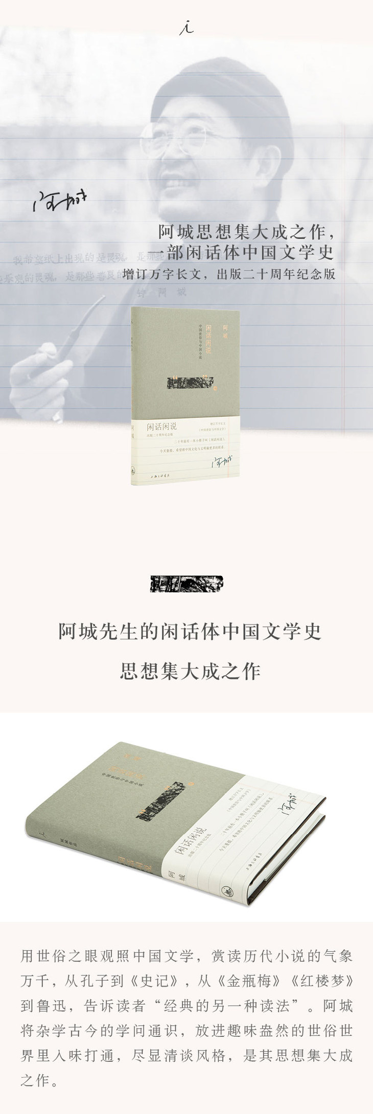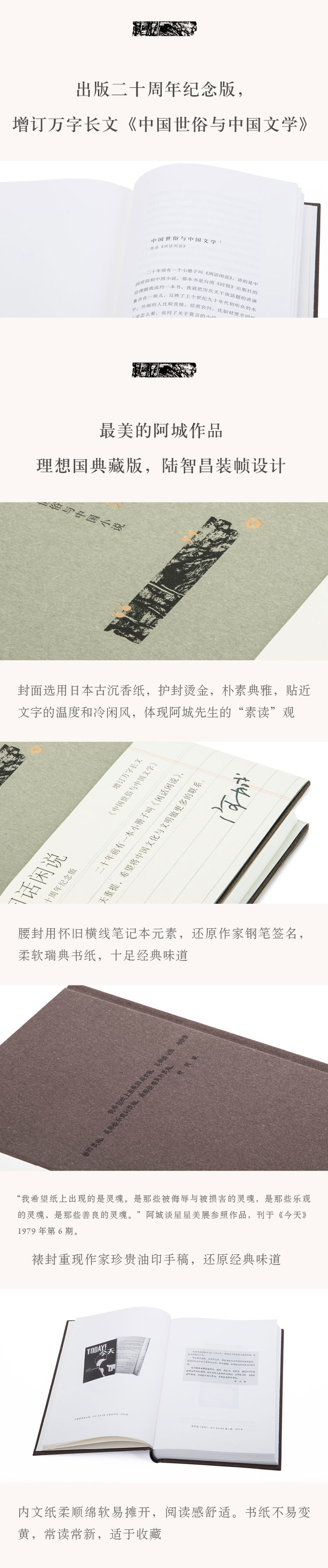 “二十年前有一个小册子叫《闲话闲说》,今天重提,希望将中国文化与文明做更多的联系。‘中国世俗与中国小说’是许多次讲谈的集成,对听众演讲和与朋友闲谈,我们共通的知识财富是世俗经验。世俗经验*容易转为人文的视角。如此来讲,*宜将理论化为闲话,将专业术语藏入闲说,通篇不去定义“世俗”,使听者容易听。”——阿城