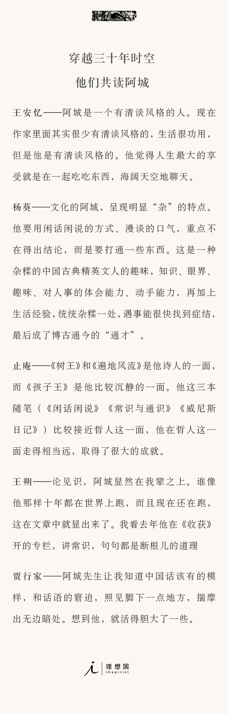 阿城,本名钟阿城,一九四九年生于北京。杂家,文字手艺人。