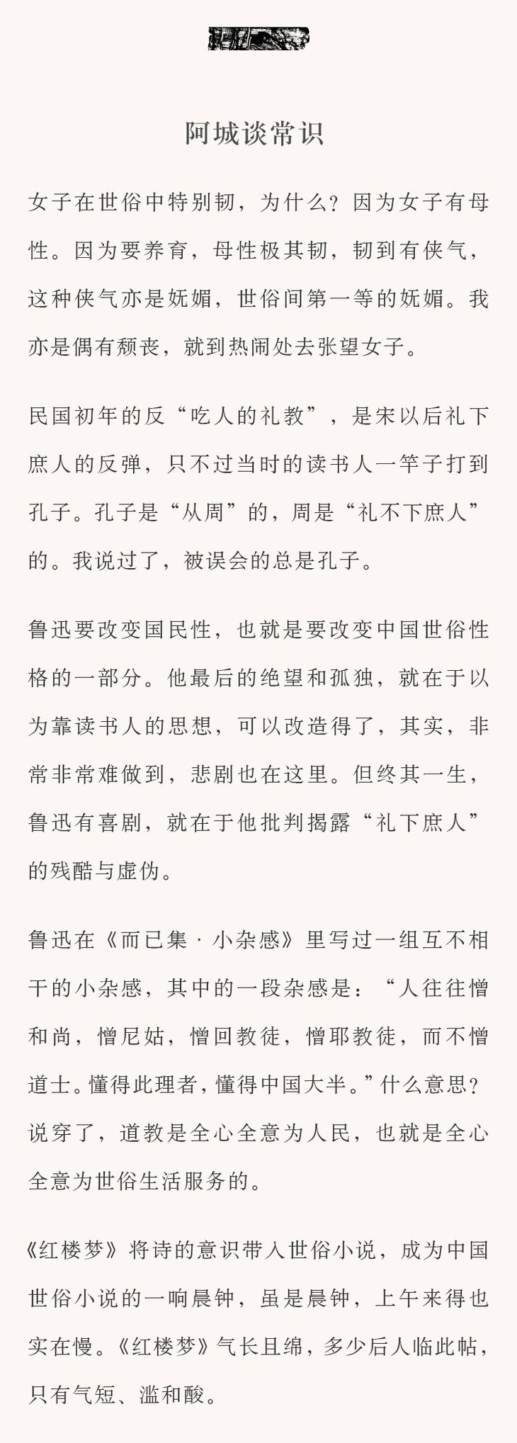 《红楼梦》,说平实了,就是世俗小说。小的时候,我家住的大杂院里的妇女们无事时会聚到一起听《红楼梦》,我家阿姨叫做周玉洁的,识字,她念,大家插嘴,所以常常停下来,我还记得有人说林姑娘就是命苦,可是这样的人也是娶不得,老是话里藏针,一年三百六十五天可怎么过?我长大后却发现读书人都欣赏林黛玉。《红楼梦》将诗的意识带入世俗小说,成为中国世俗小说的一响晨钟,虽是晨钟,上午来得也实在慢。《红楼梦》气长且绵,多少后人临此帖,只有气短、滥和酸。