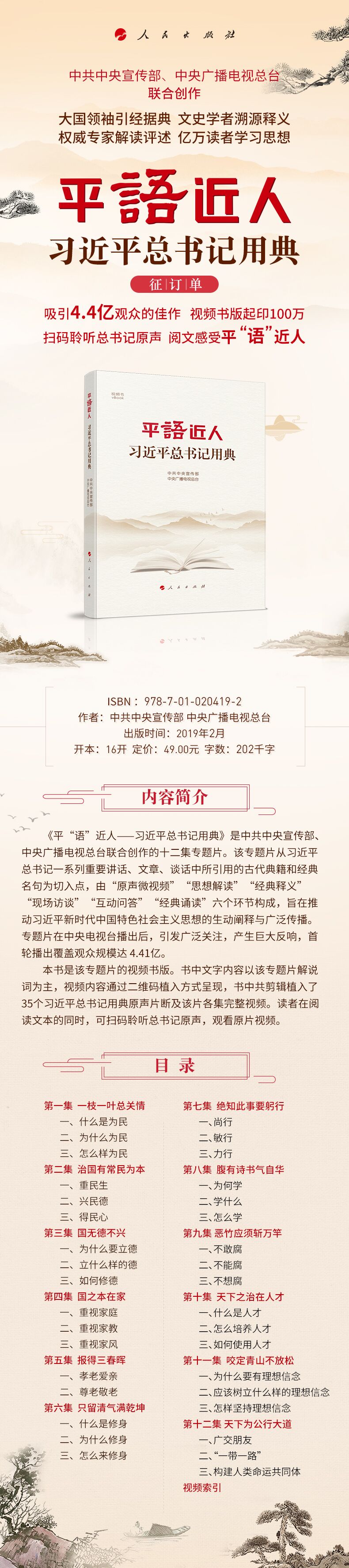 《平“语”近人——习近平总书记用典》是中宣部、中央广播电视总台联合创作的《百家讲坛》特别节目,该书为其文字版。节目从习近平总书记一系列重要讲话、文章、谈话中所引用的古代典籍和经典名句为切入点,旨在推动习近平新时代中国特色社会主义思想的生动阐释与广泛传播。节目于2018年10月8日至19日20:00在中央电视台综合频道档播出。全书分为《一枝一叶总关情》、《治国有常民为本》、《国无德不兴》、《国之本在家》、《报得三春晖》、《只留清气满乾坤》、《绝知此事要躬行》、《腹有诗书气自华》、《恶竹应须斩万竿》、《天下之治在人才》、《咬定青山不放松》、《天下为公行大道》12集,由“原声微视频”“思想解读”“经典释义”“现场访谈”“互动问答”“经典诵读”六个环节构成。