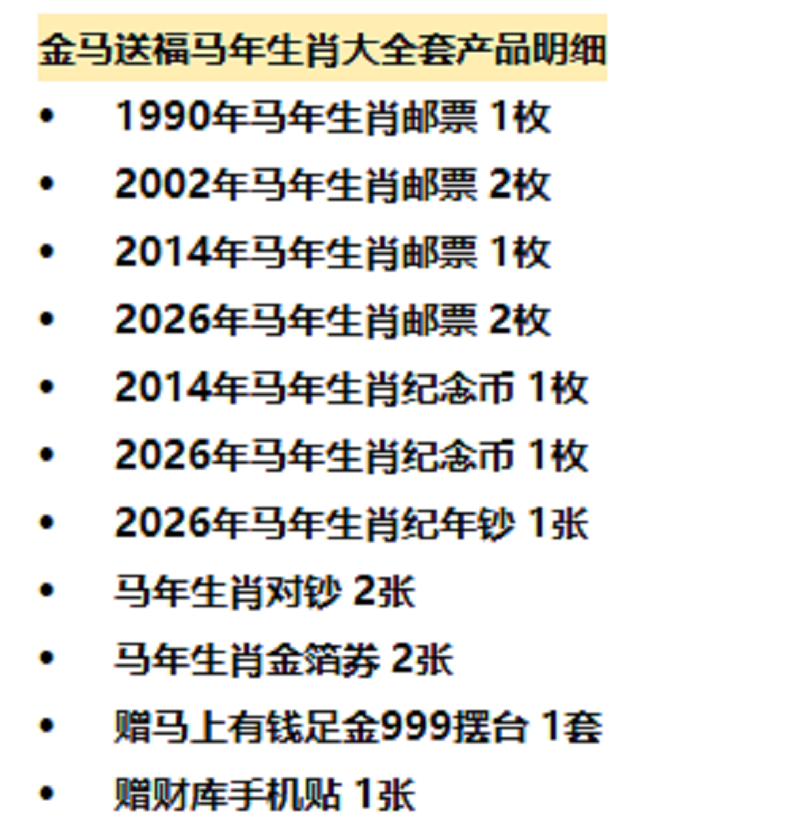 【金马送福·马年生肖大全套】,马年王炸,马钞,马币,邮票一起抢,还赠送您足金999马上有钱摆台! 一次把2026“邮币钞”硬通货打包到家,