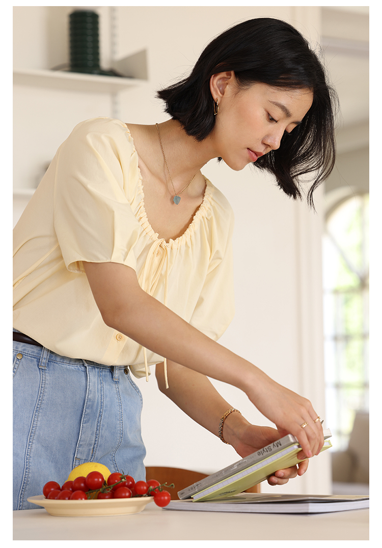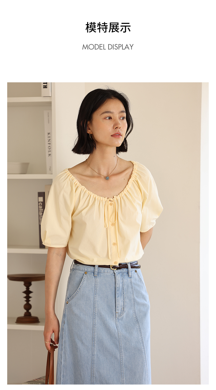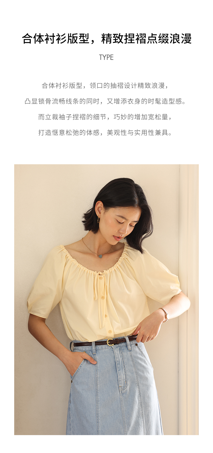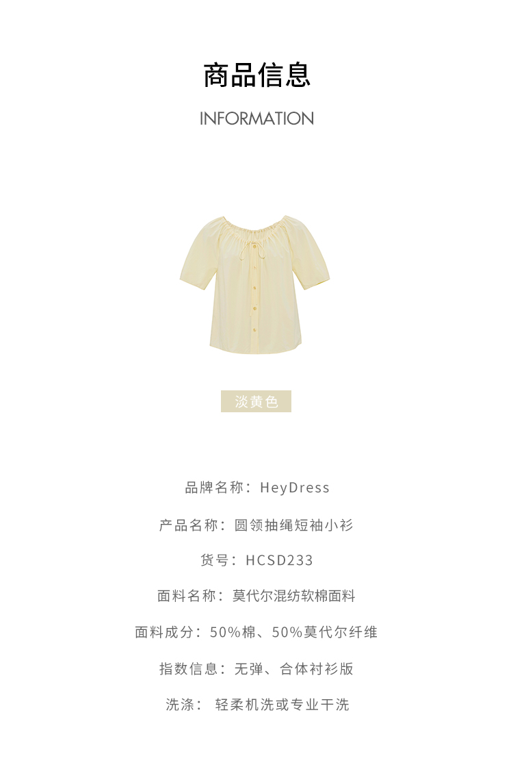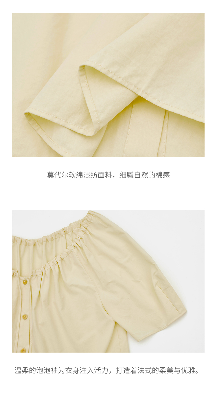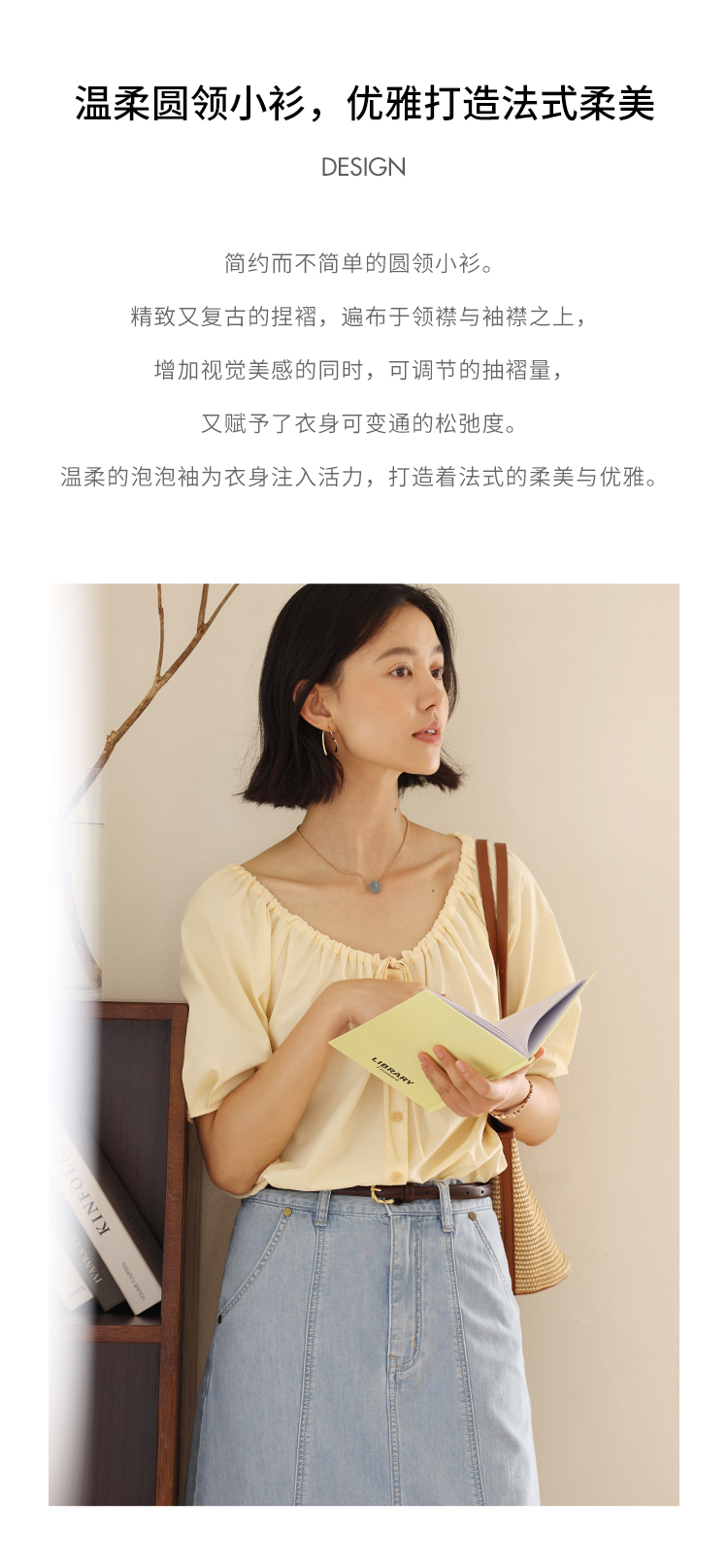 HeyDress法式圆领黄色衬衫女夏季复古宽松慵懒感小衫浪漫短袖上衣