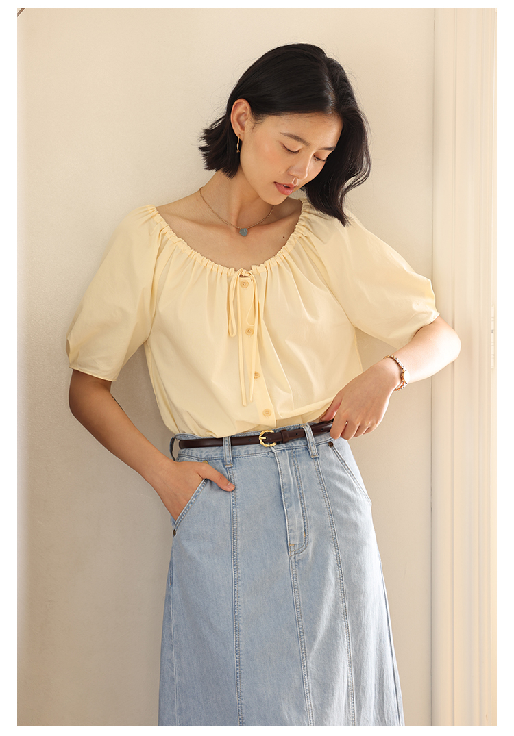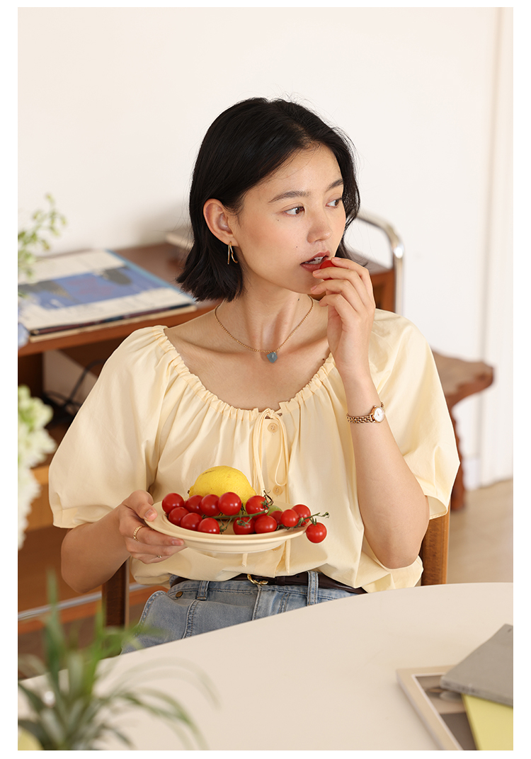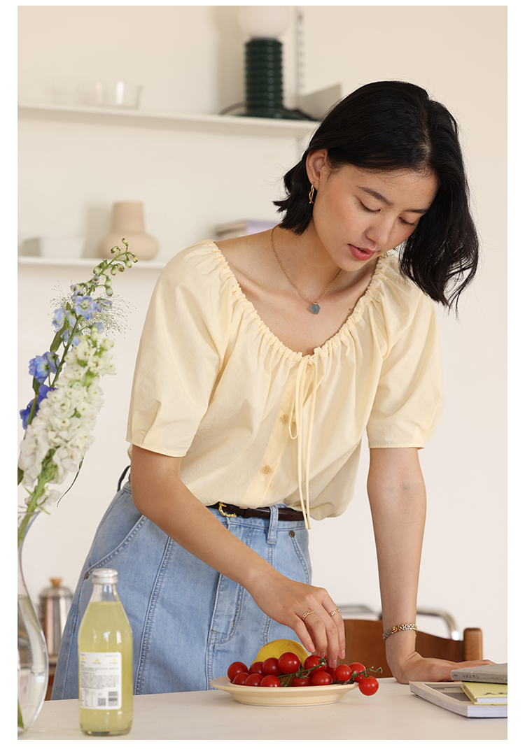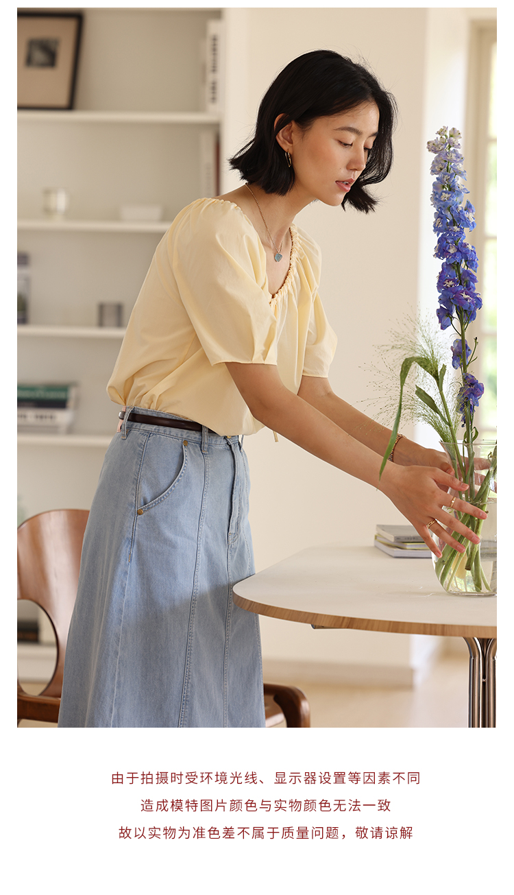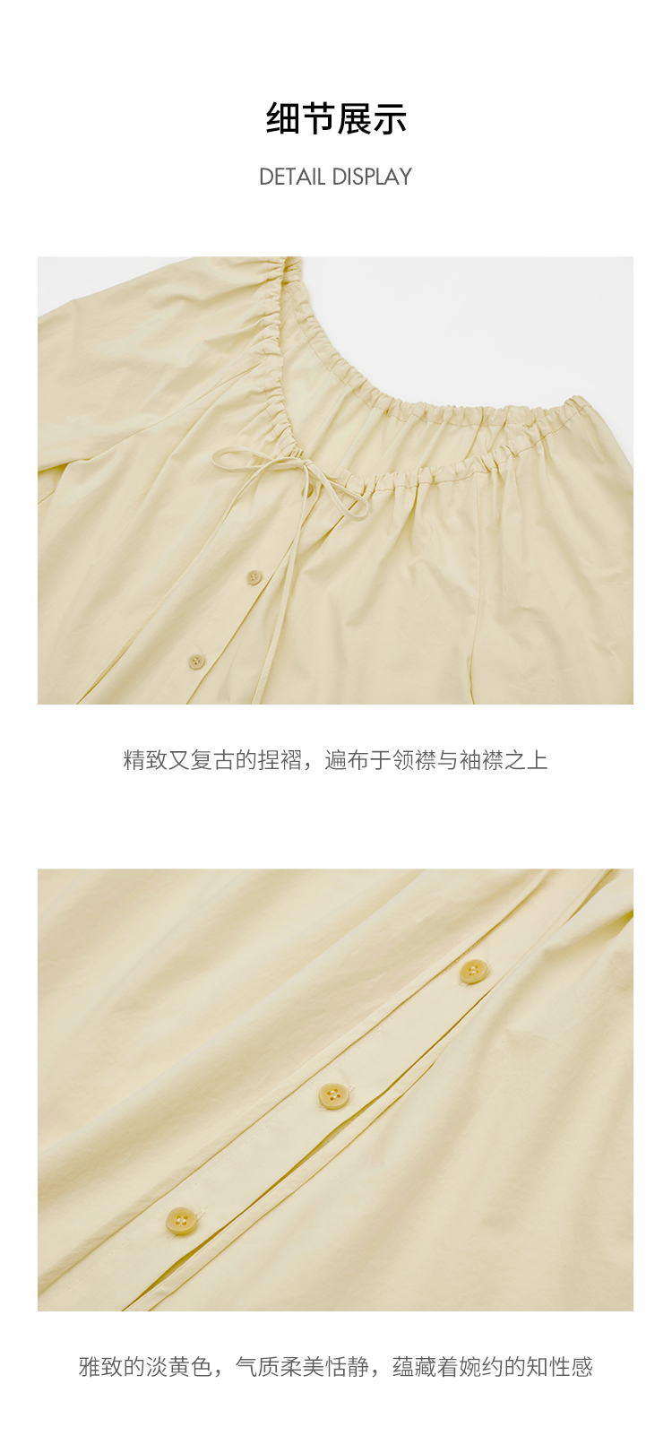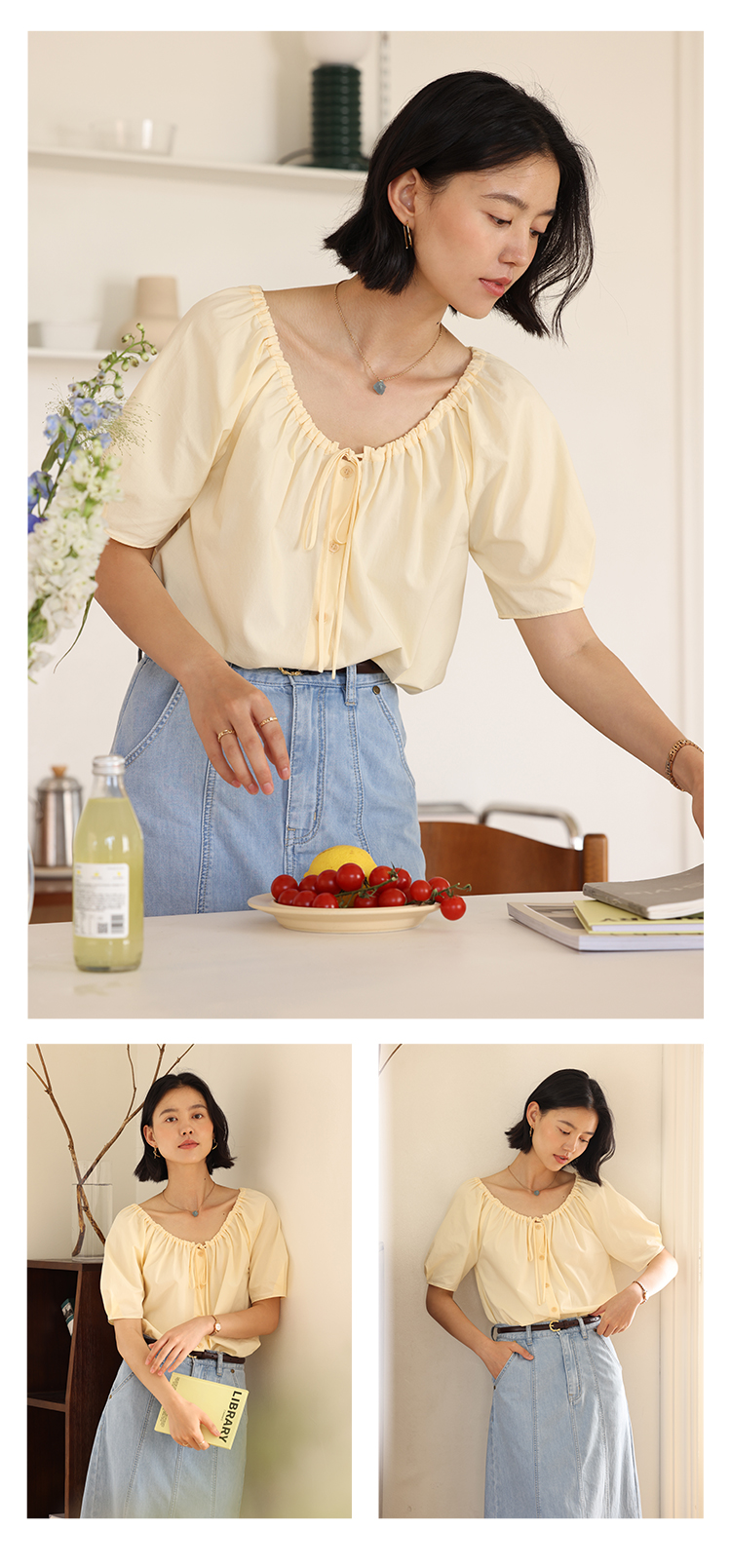 HeyDress法式圆领黄色衬衫女夏季复古宽松慵懒感小衫浪漫短袖上衣