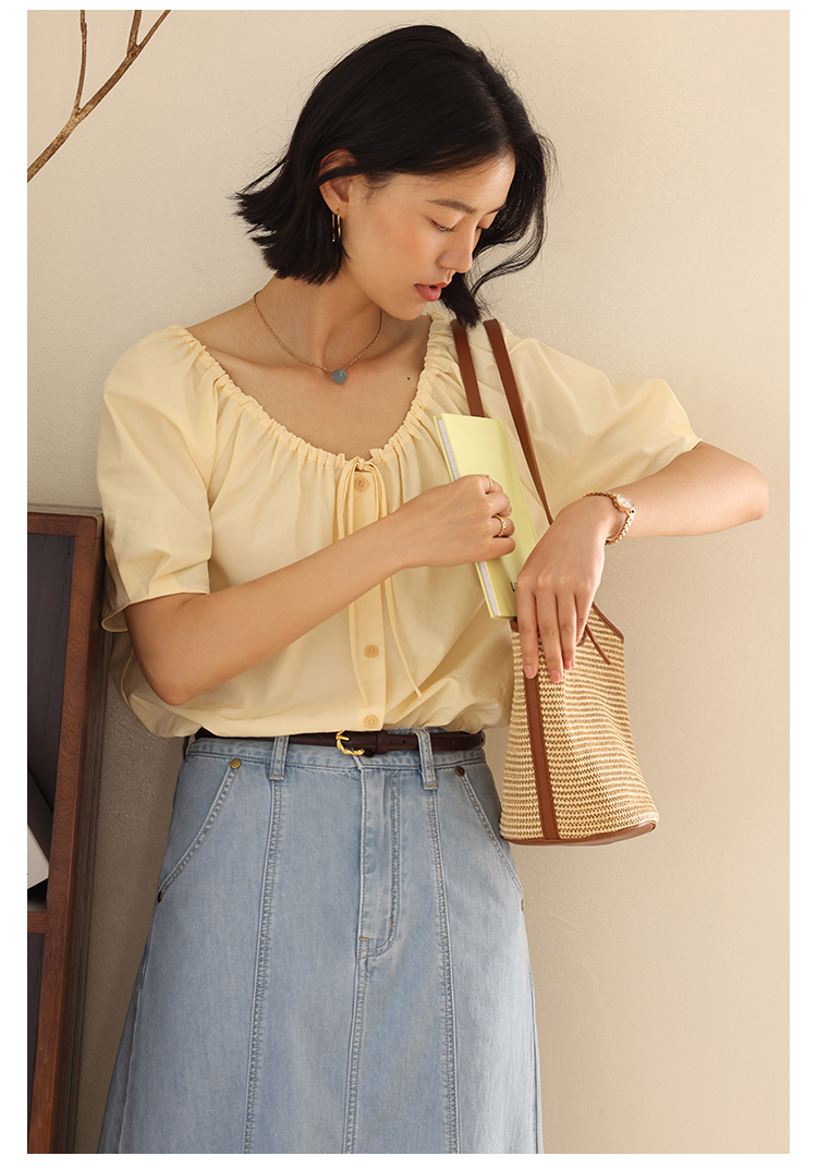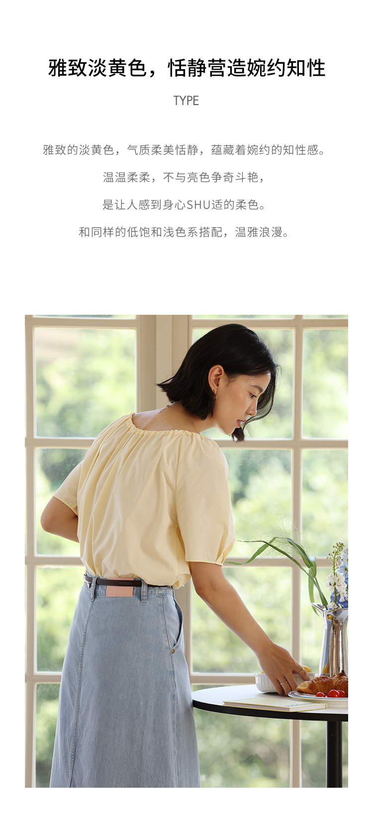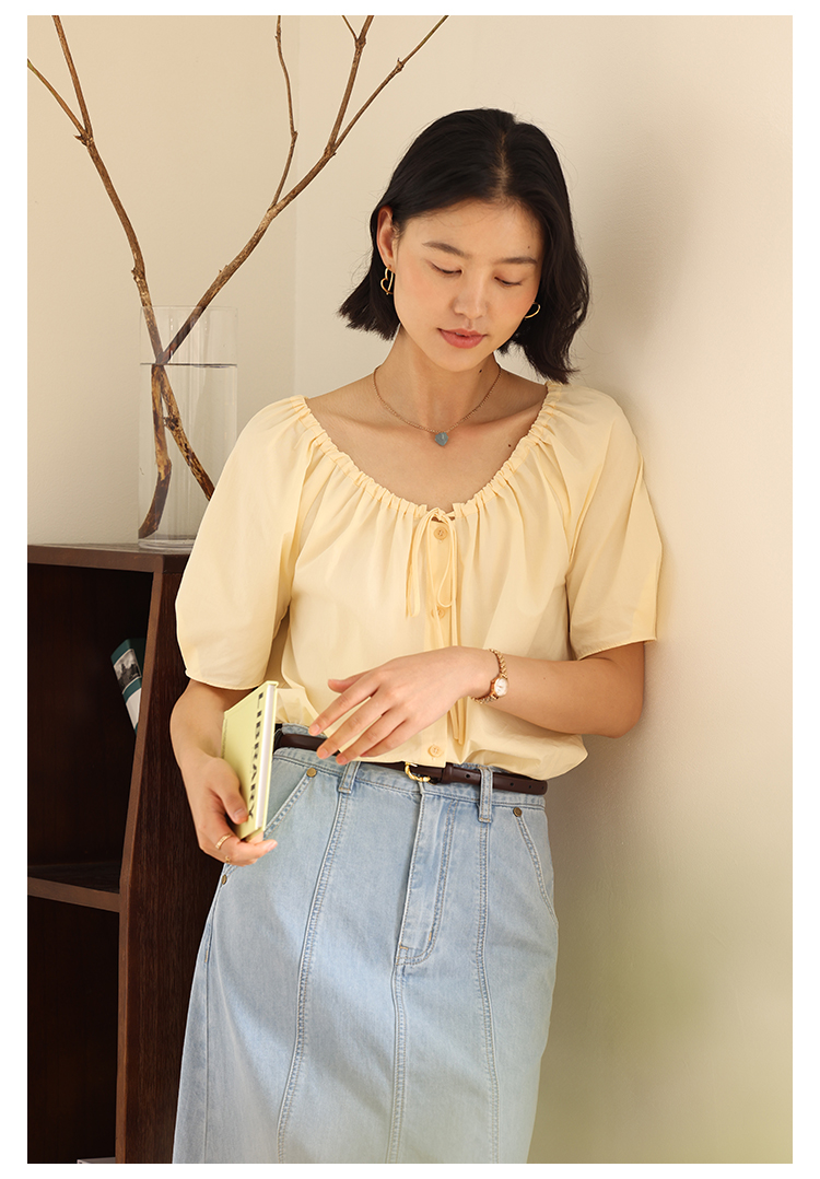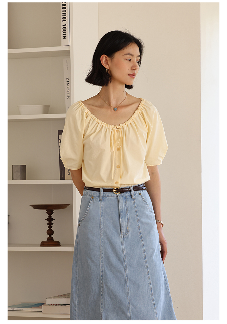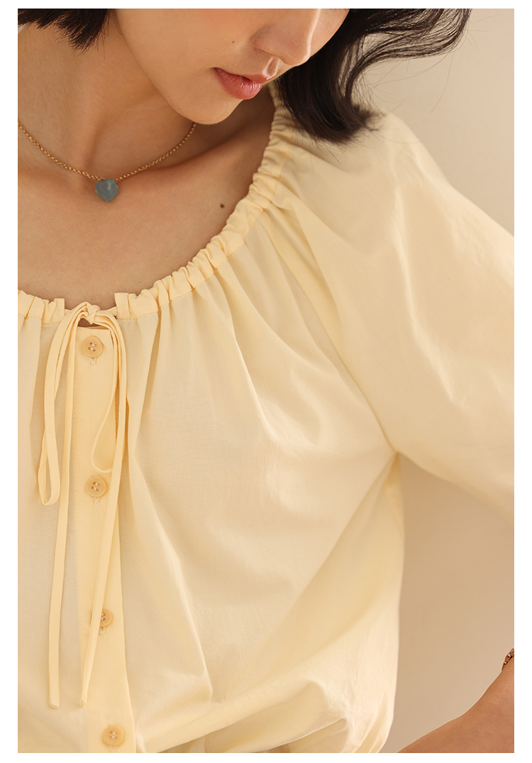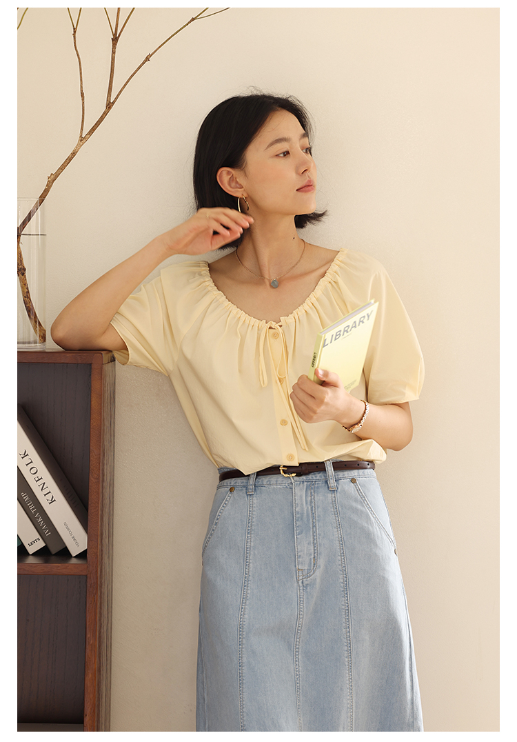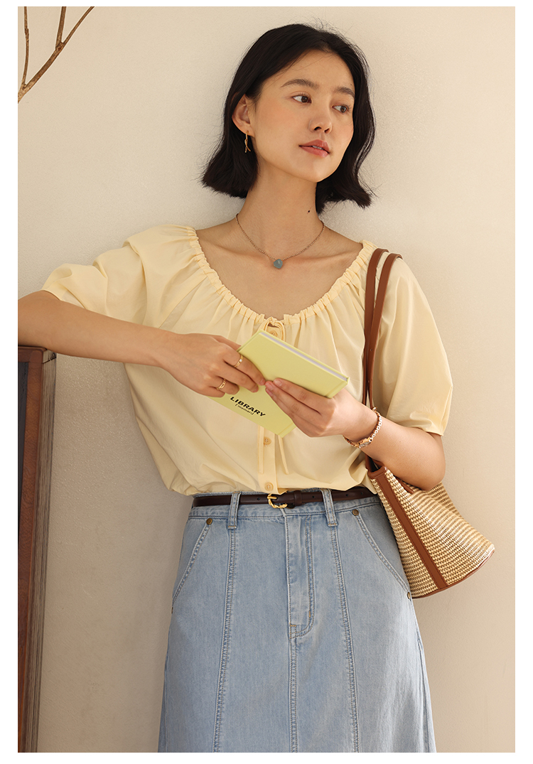 HeyDress法式圆领黄色衬衫女夏季复古宽松慵懒感小衫浪漫短袖上衣