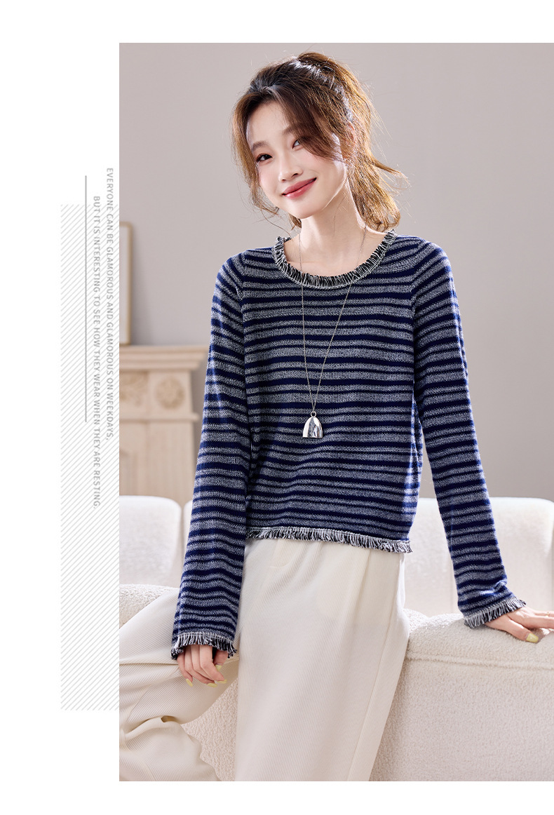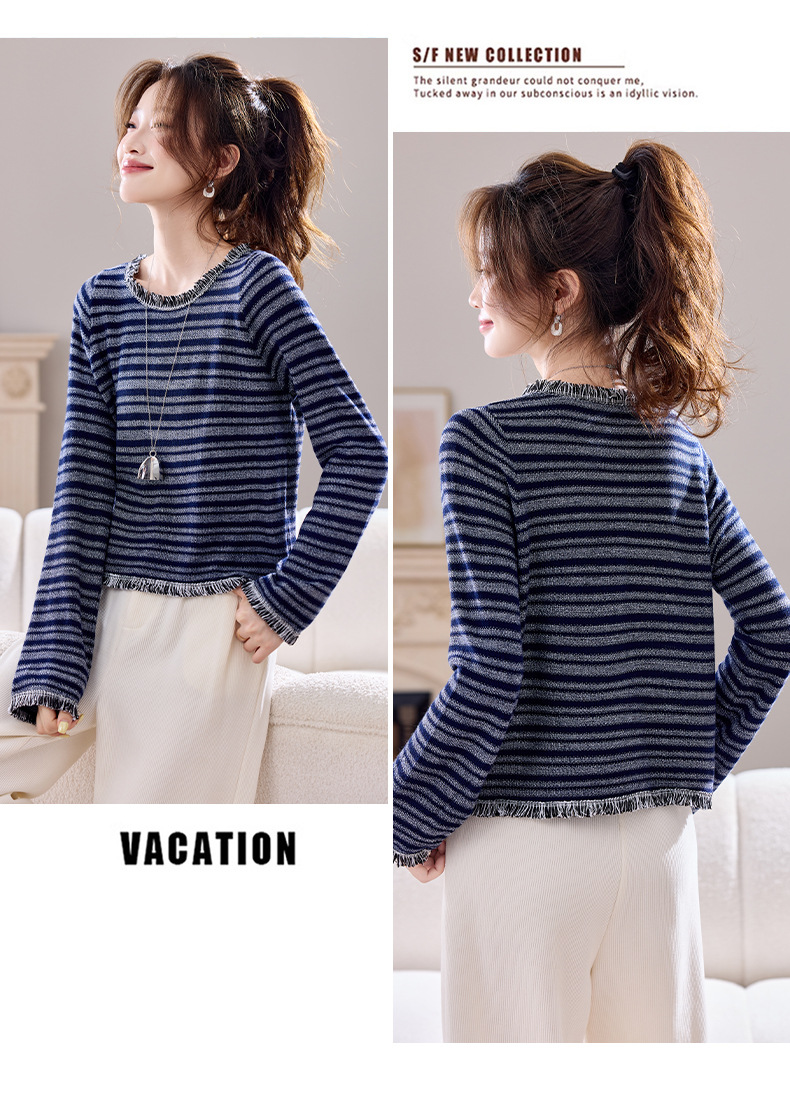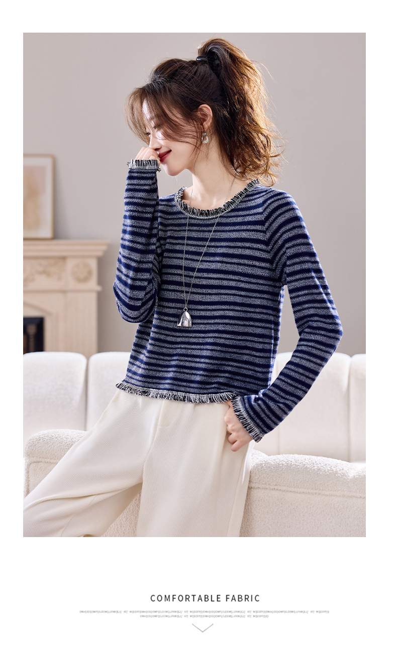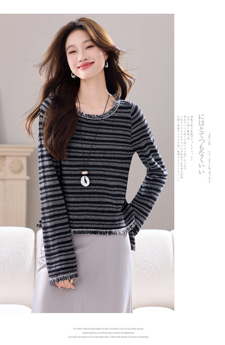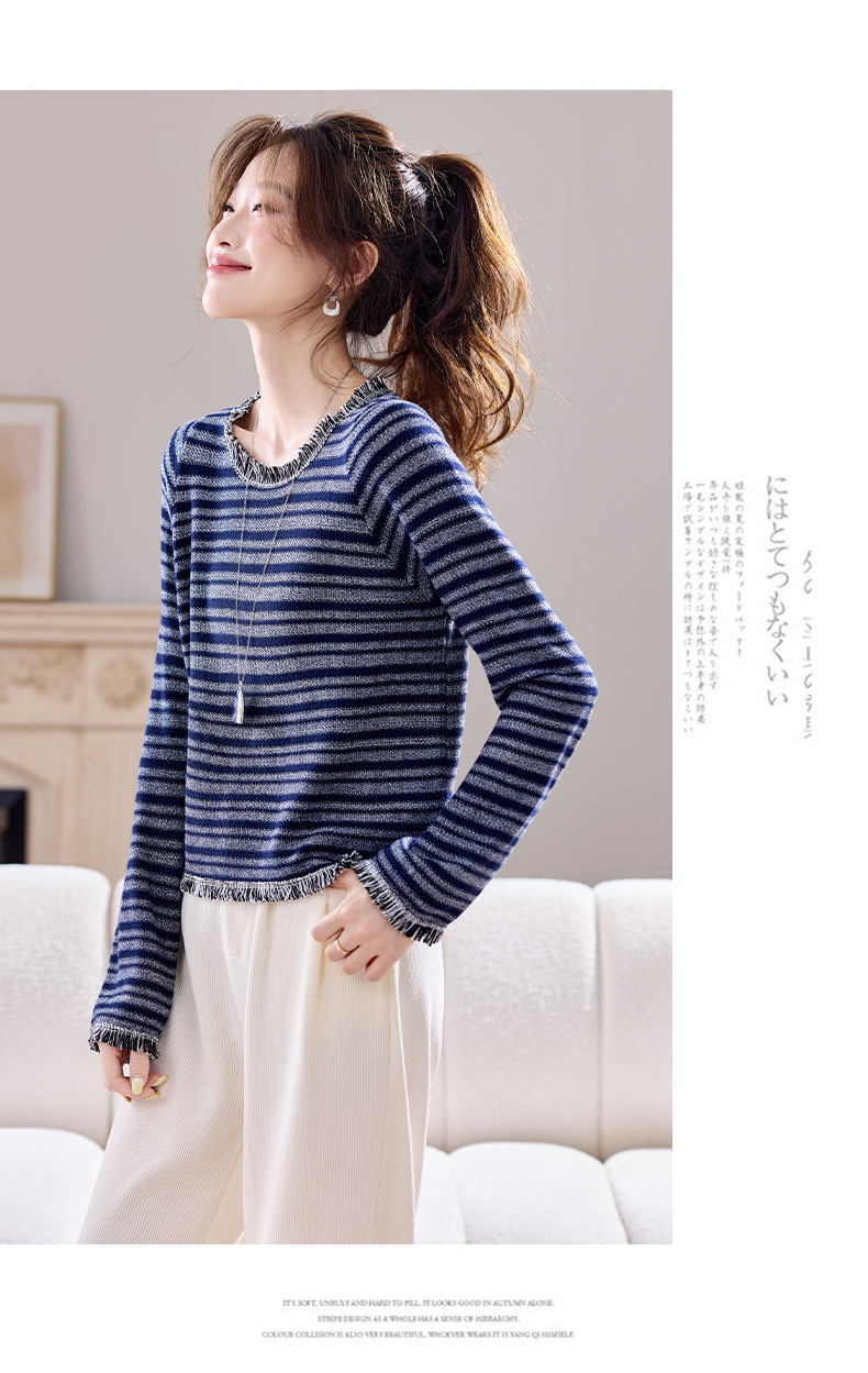 CC圆领流苏条纹打底衫女内搭2025春秋新款宽松针织衫薄款外穿毛衣
