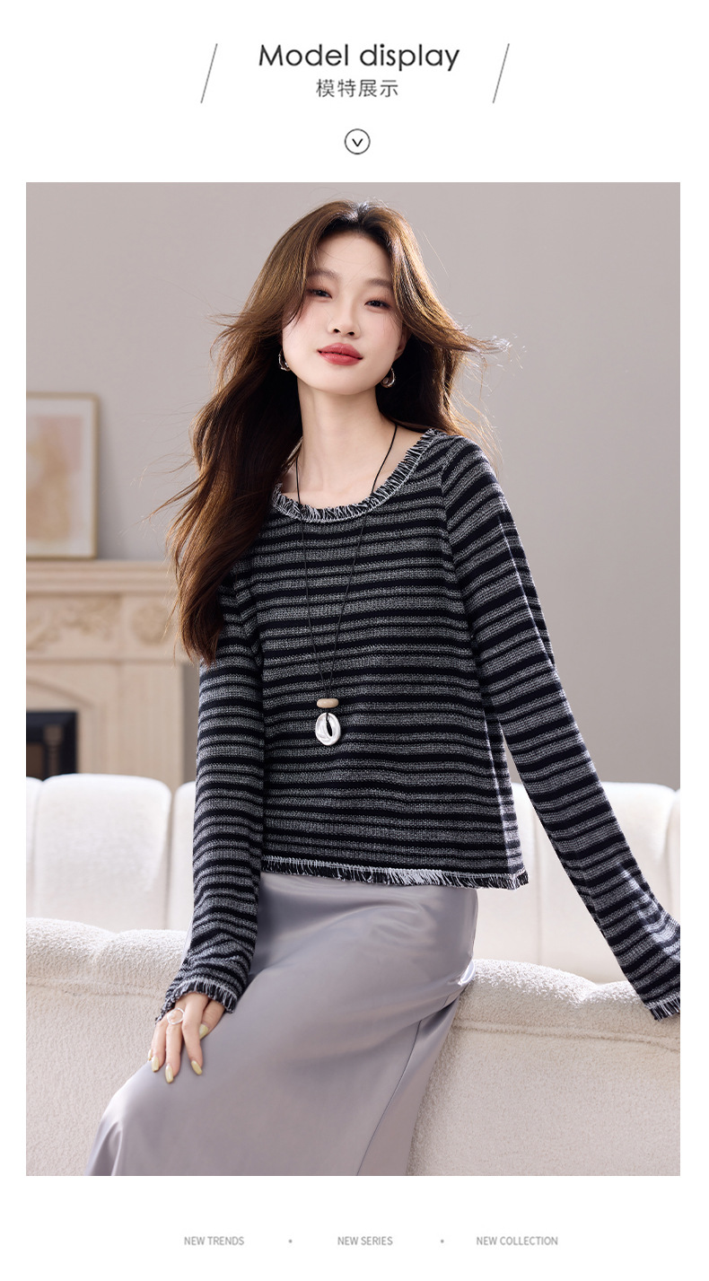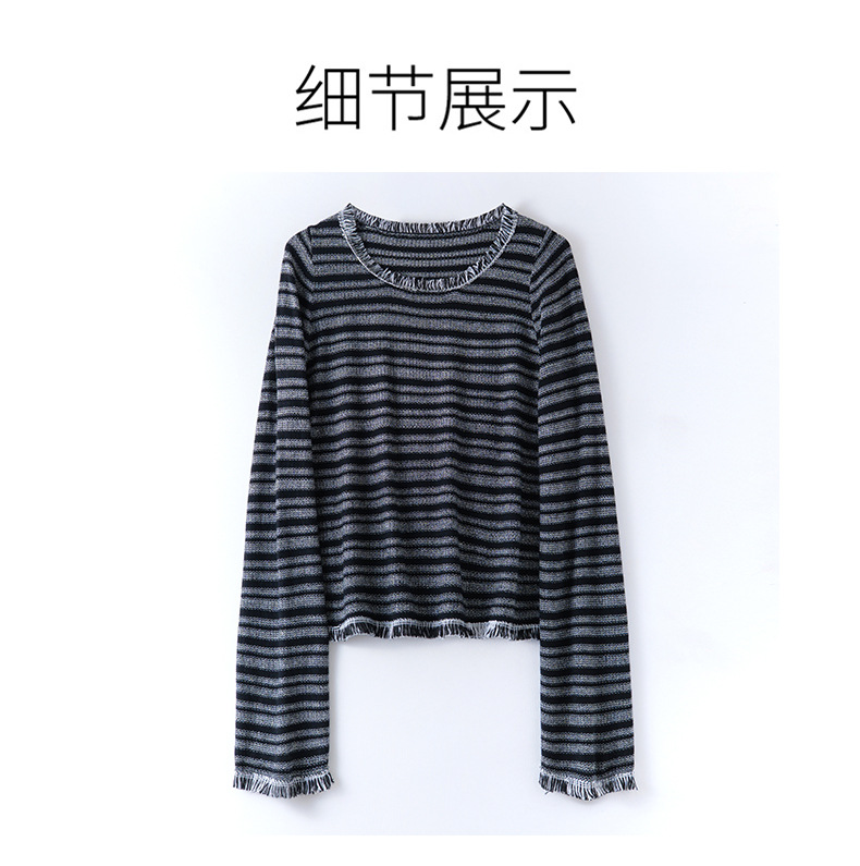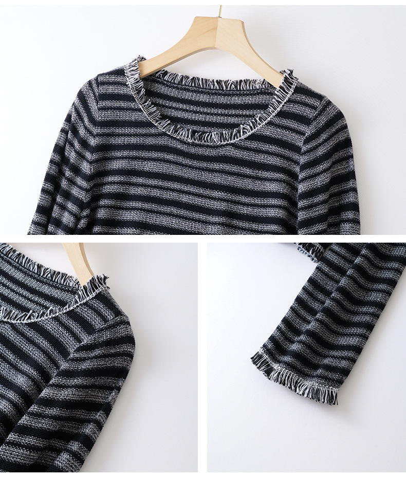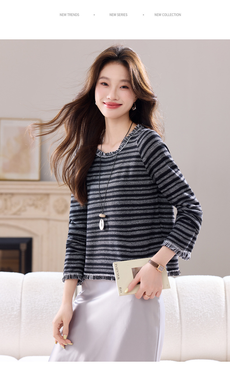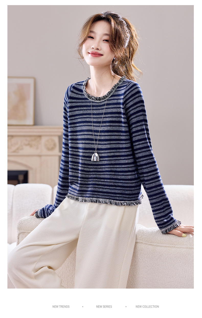 CC圆领流苏条纹打底衫女内搭2025春秋新款宽松针织衫薄款外穿毛衣