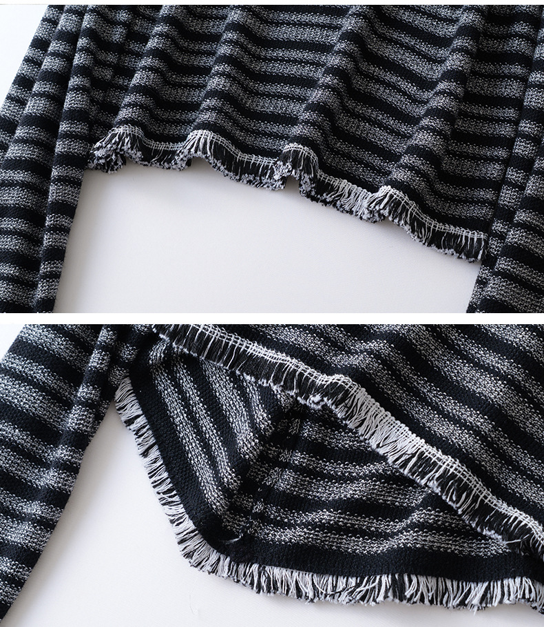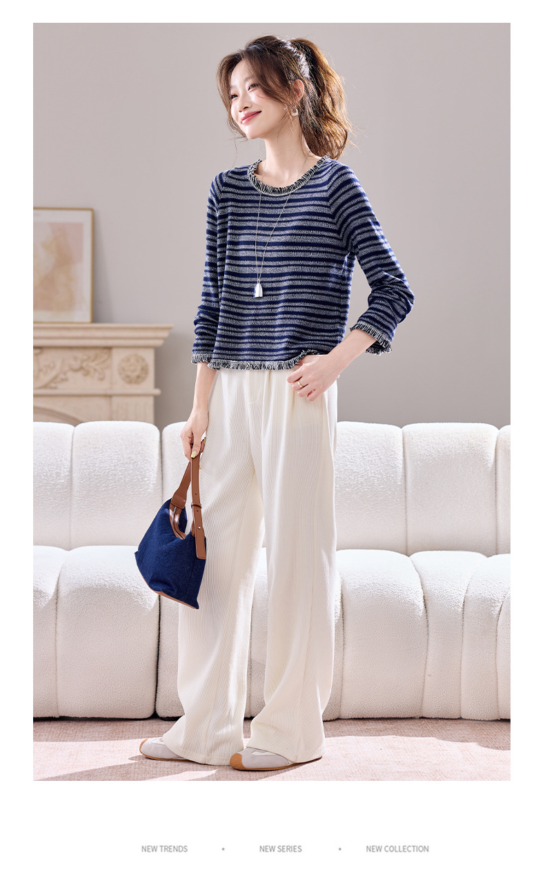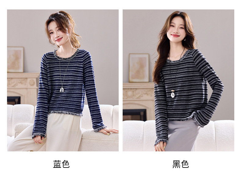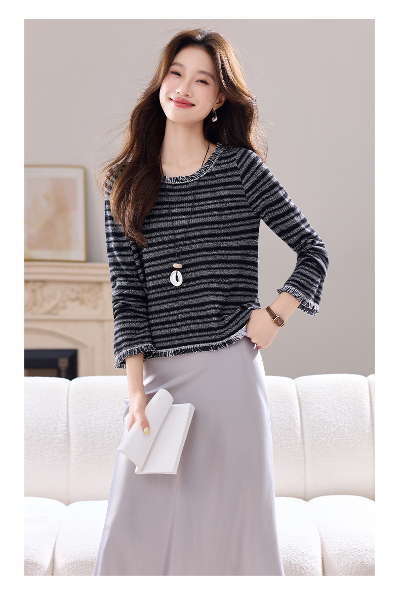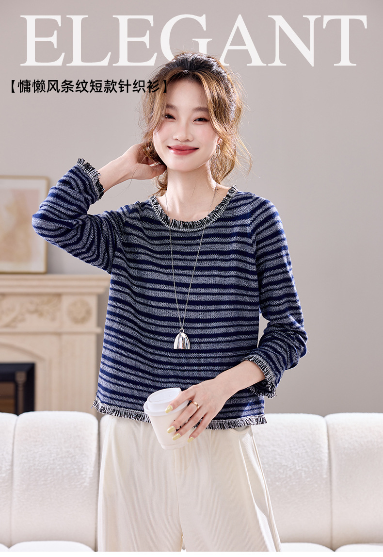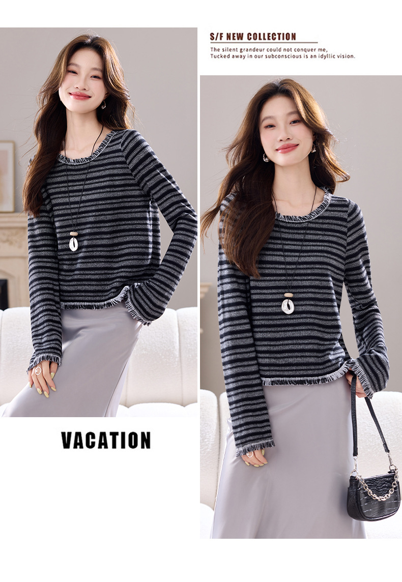 CC圆领流苏条纹打底衫女内搭2025春秋新款宽松针织衫薄款外穿毛衣