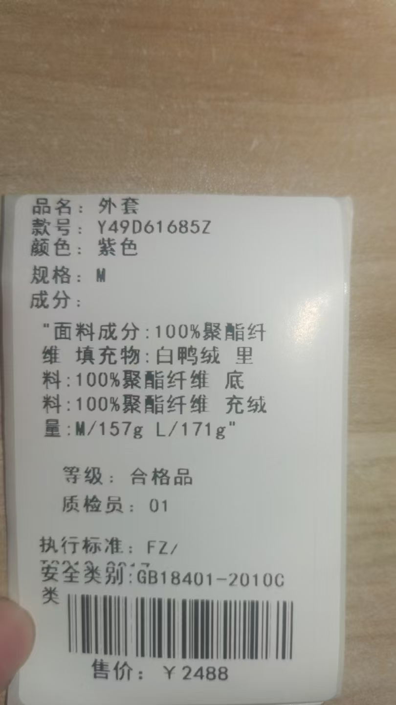 填充物:白鸭绒 里料:100%聚酯纤维