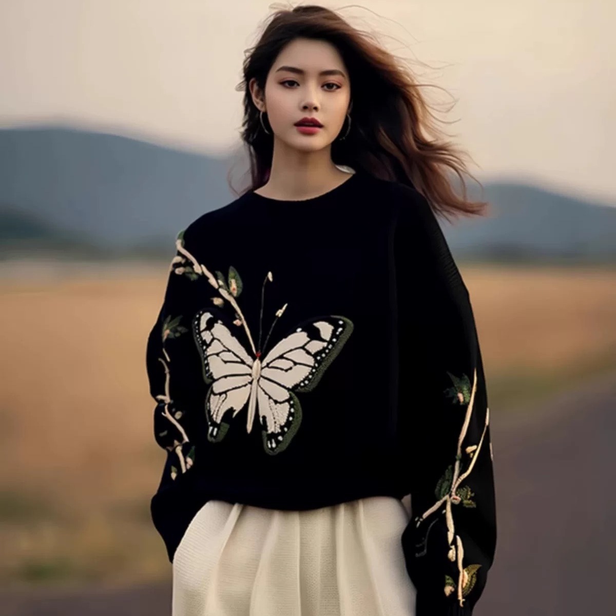 雀说黑色蝴蝶印花毛衣新款高级感圆领宽松慵懒风针织上衣AL5198