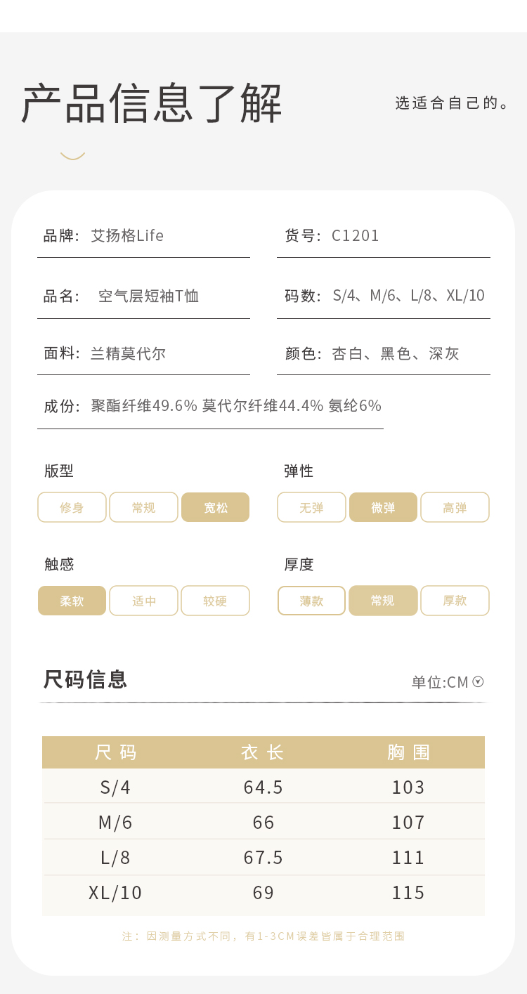 艾扬格 life C1201空气层短袖T恤 柔软垂顺 清爽透气 垂顺抗皱易打理着身更有型