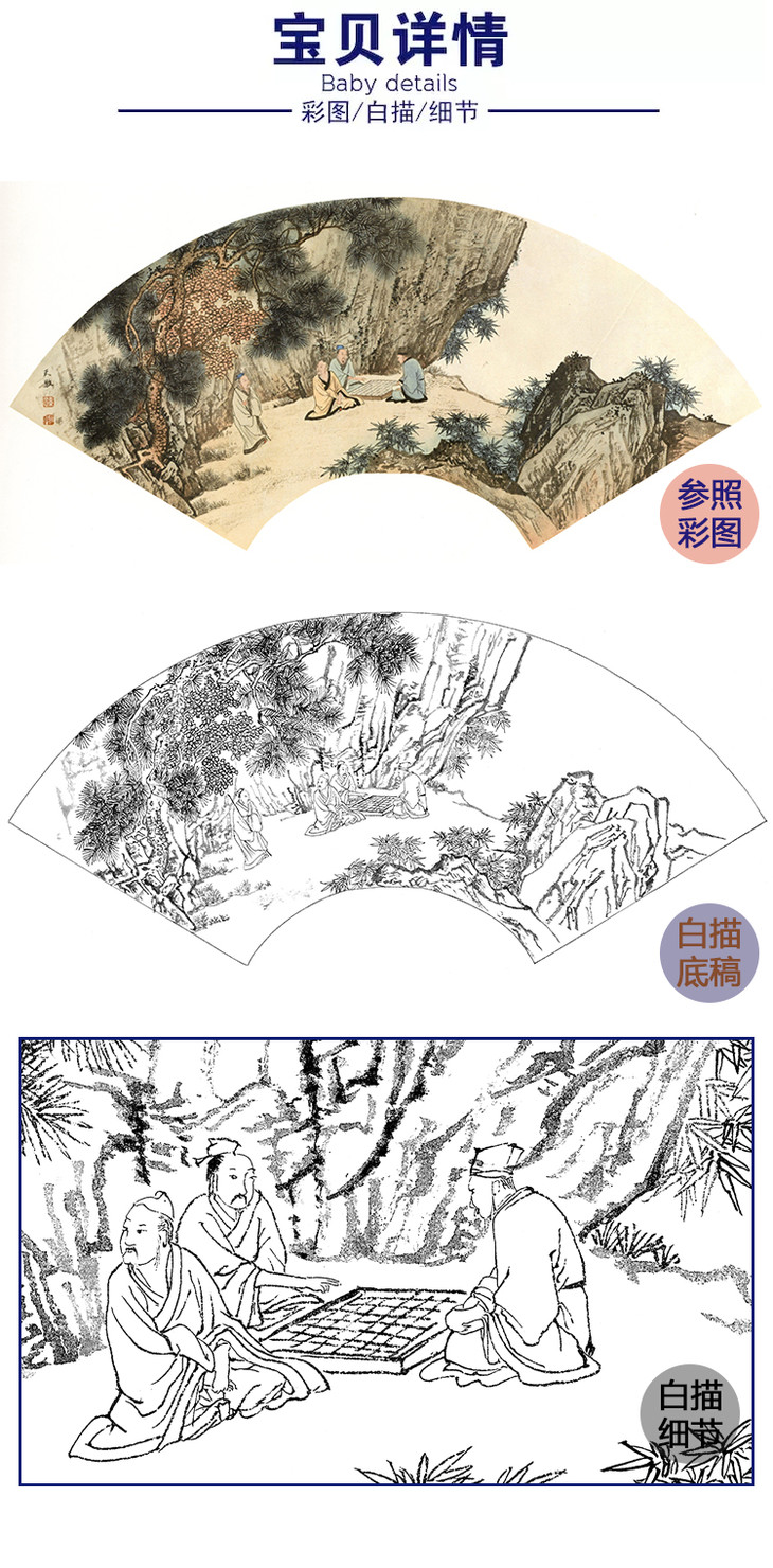 孙天牧工笔山水人物扇面小品白描底稿-《山下观奕》-多种白描尺寸可选-ST18