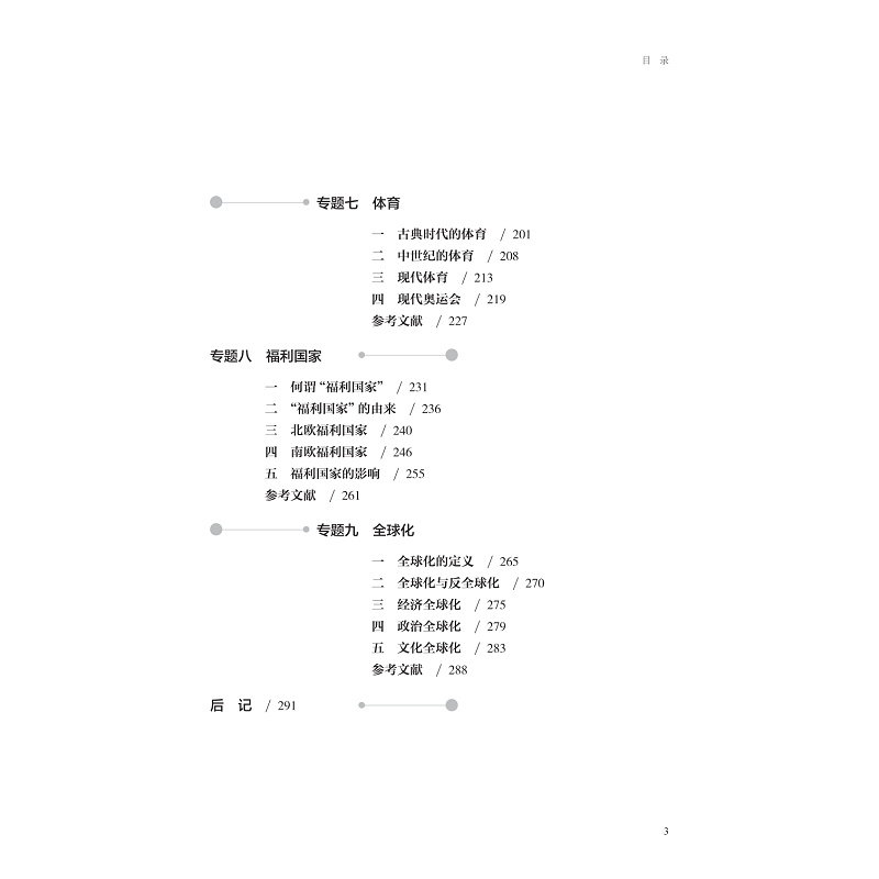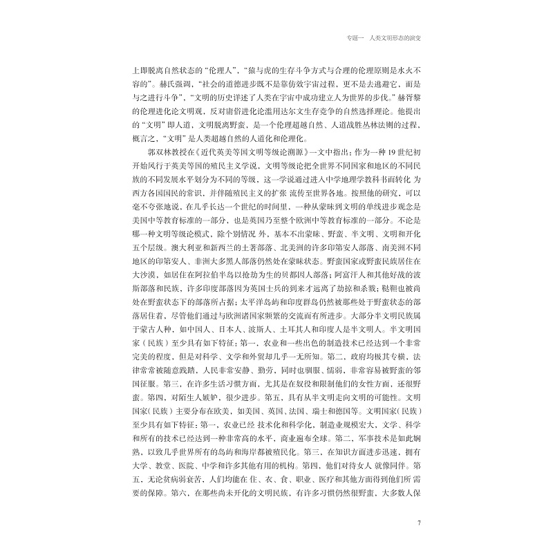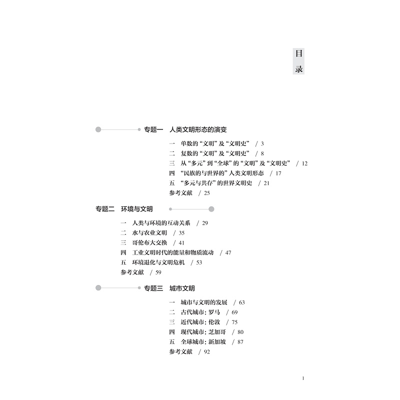 该教材为《世界文明史》省级线上一流课程的配套教材。从多元文明特质角度出发,精选文明及文明史书写的演变、城市文明、人类战争、商业与贸易、人类环境、福利国家、体育、社会组织、全球化九个研究专题,将宏观与微观相结合、通史与专题相结合,在系统梳理文明形态演变的基础上,探索不同文明共存的连结纽带,以微观视角展现宏观的文明演进,进而揭示人类文明的多元共生,人类社会的命运共存。以“专题”重构世界文明史,与以往流行的“通史”类文明史作区分。与中学历史教育相衔接,契合中学历史教育改革的需要。