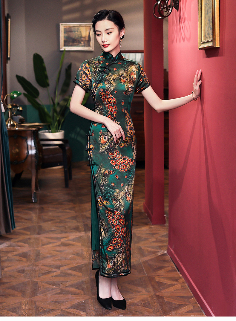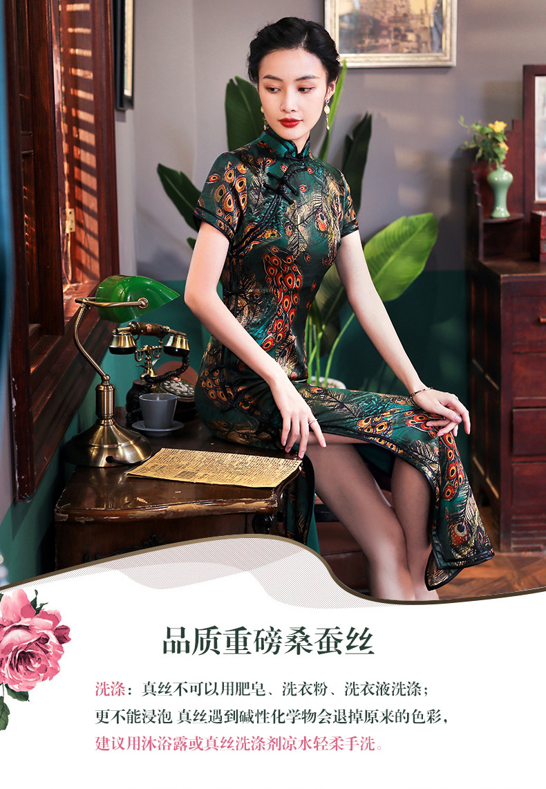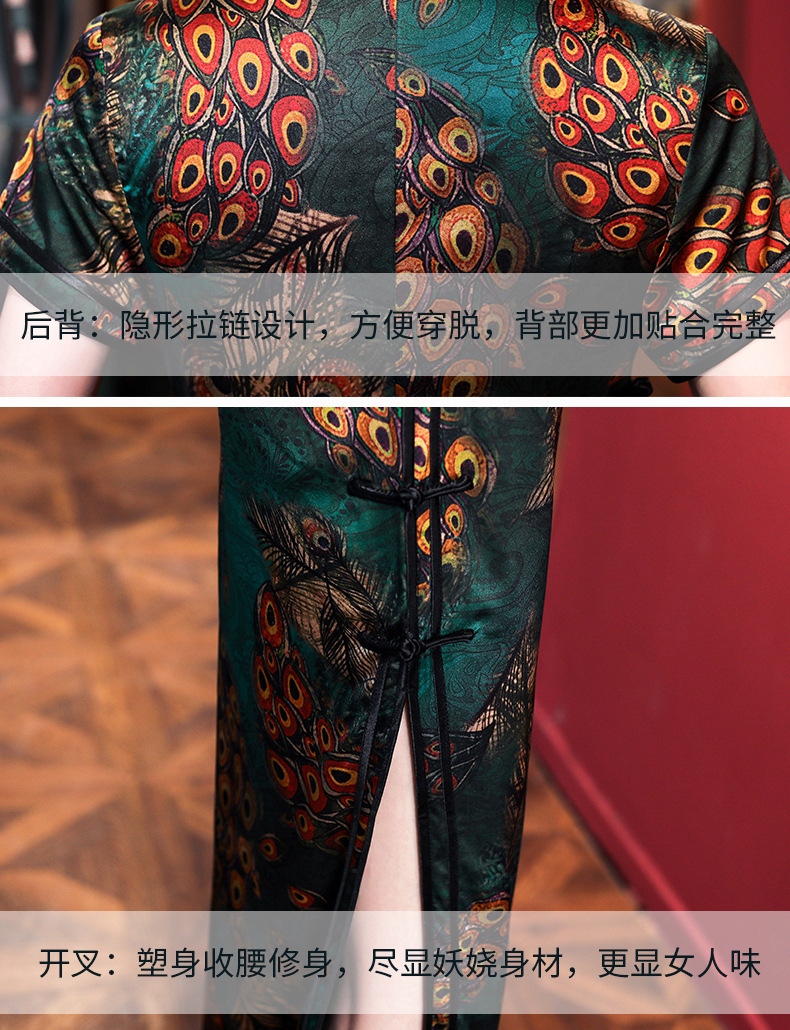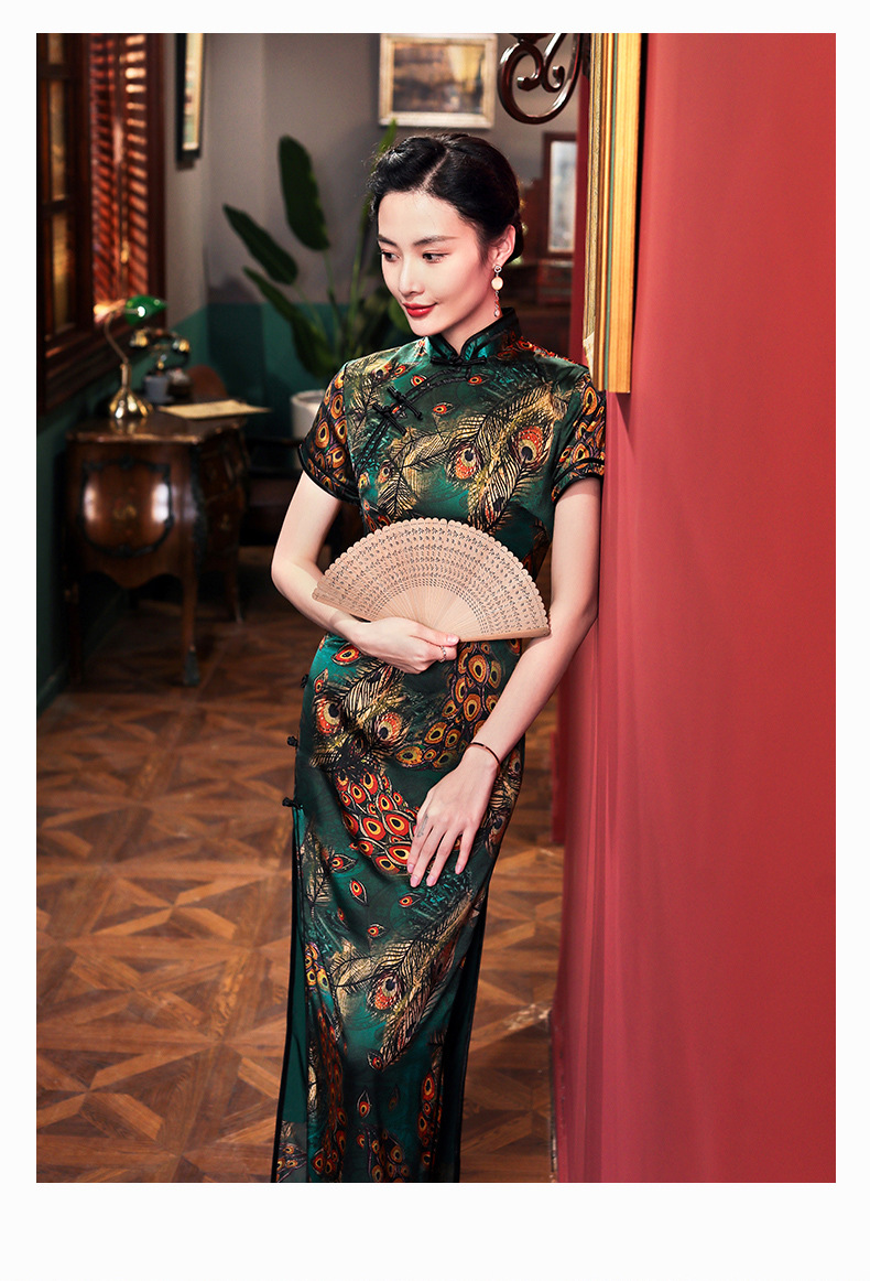 WXG新款优雅气质改良立领短袖桑蚕丝印花长款旗袍