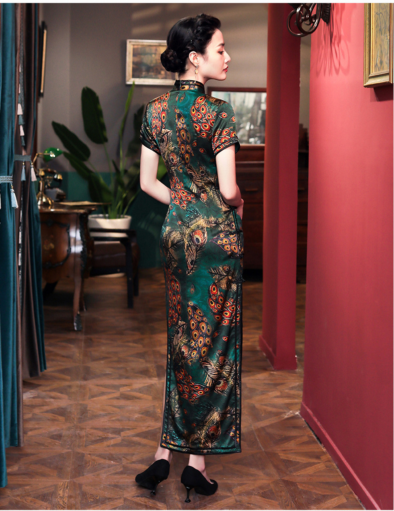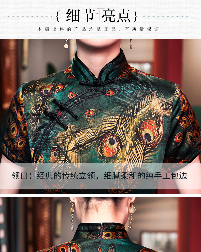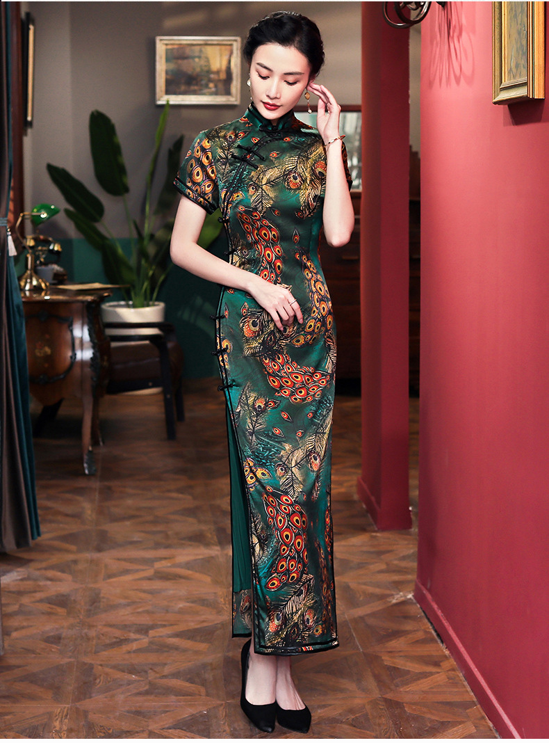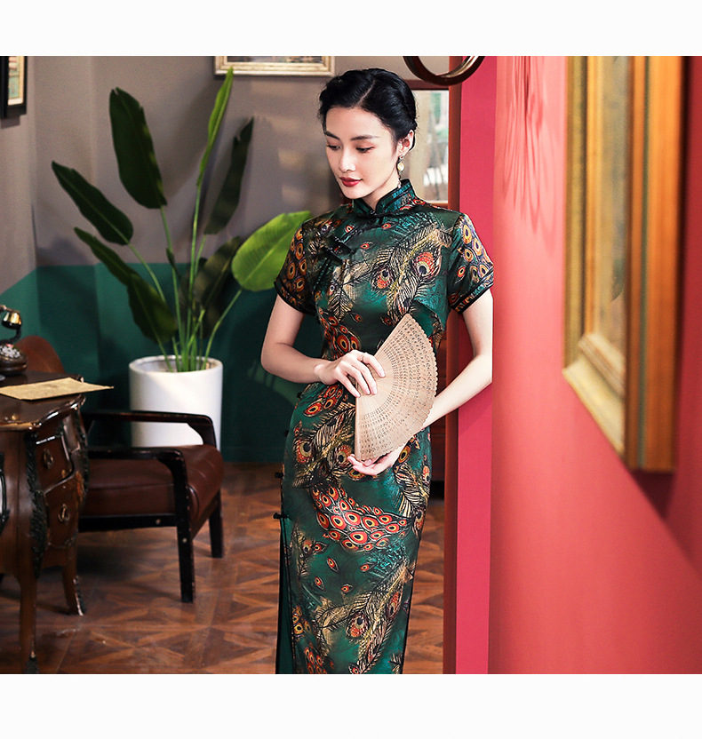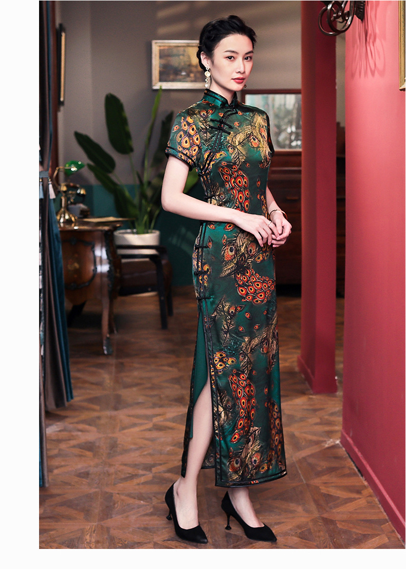 WXG新款优雅气质改良立领短袖桑蚕丝印花长款旗袍
