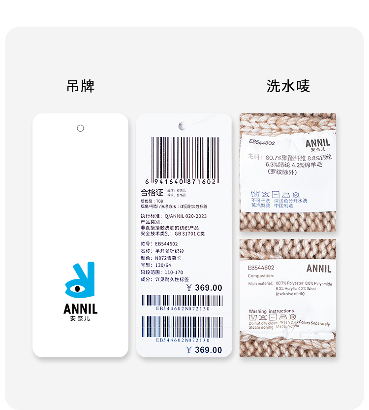 【含羊毛/半开领毛衣】男童半开领针织衫冬季新款安奈儿童装EB544602