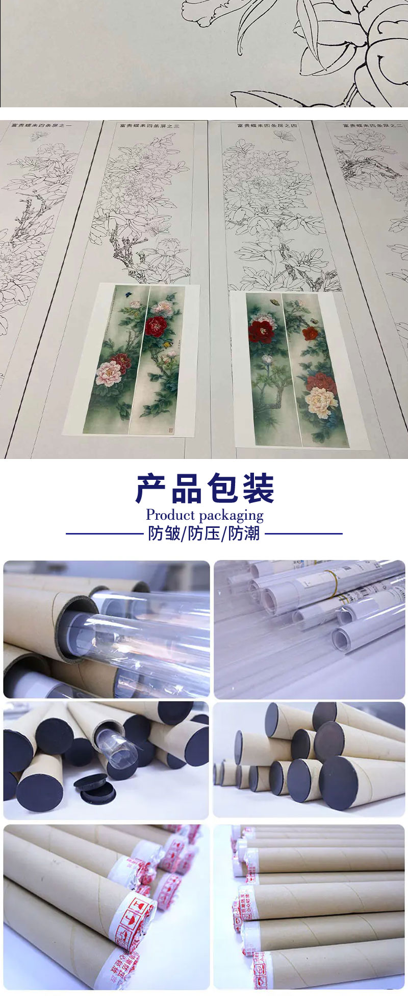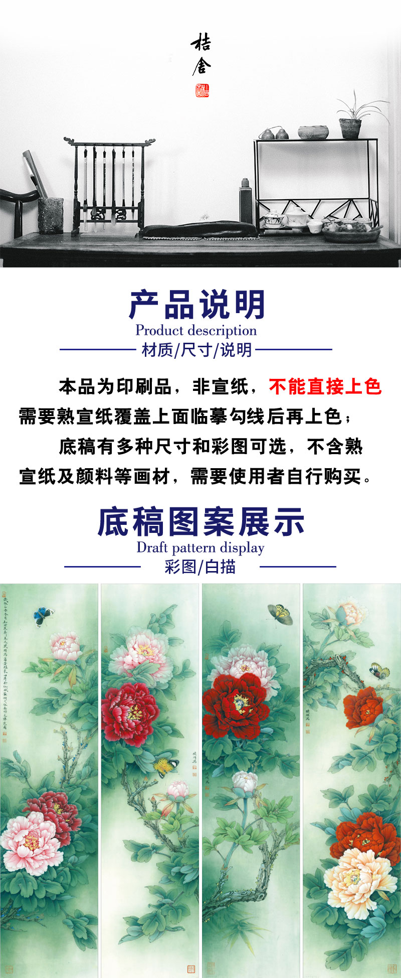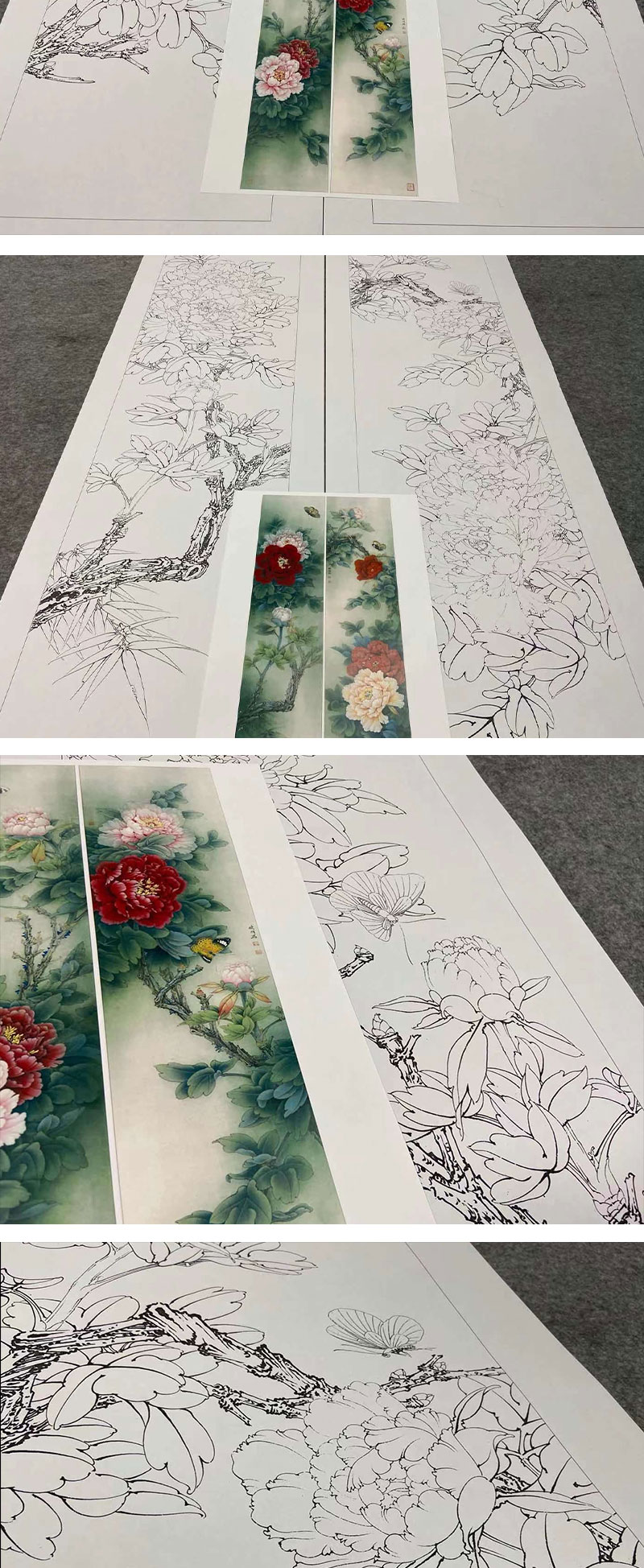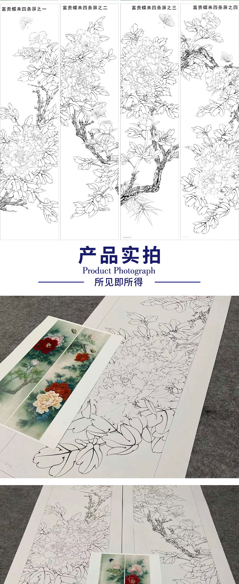 【四条屏】李晓明工笔花鸟画白描稿牡丹《富贵蝶来》临摹勾线花鸟线稿KA29