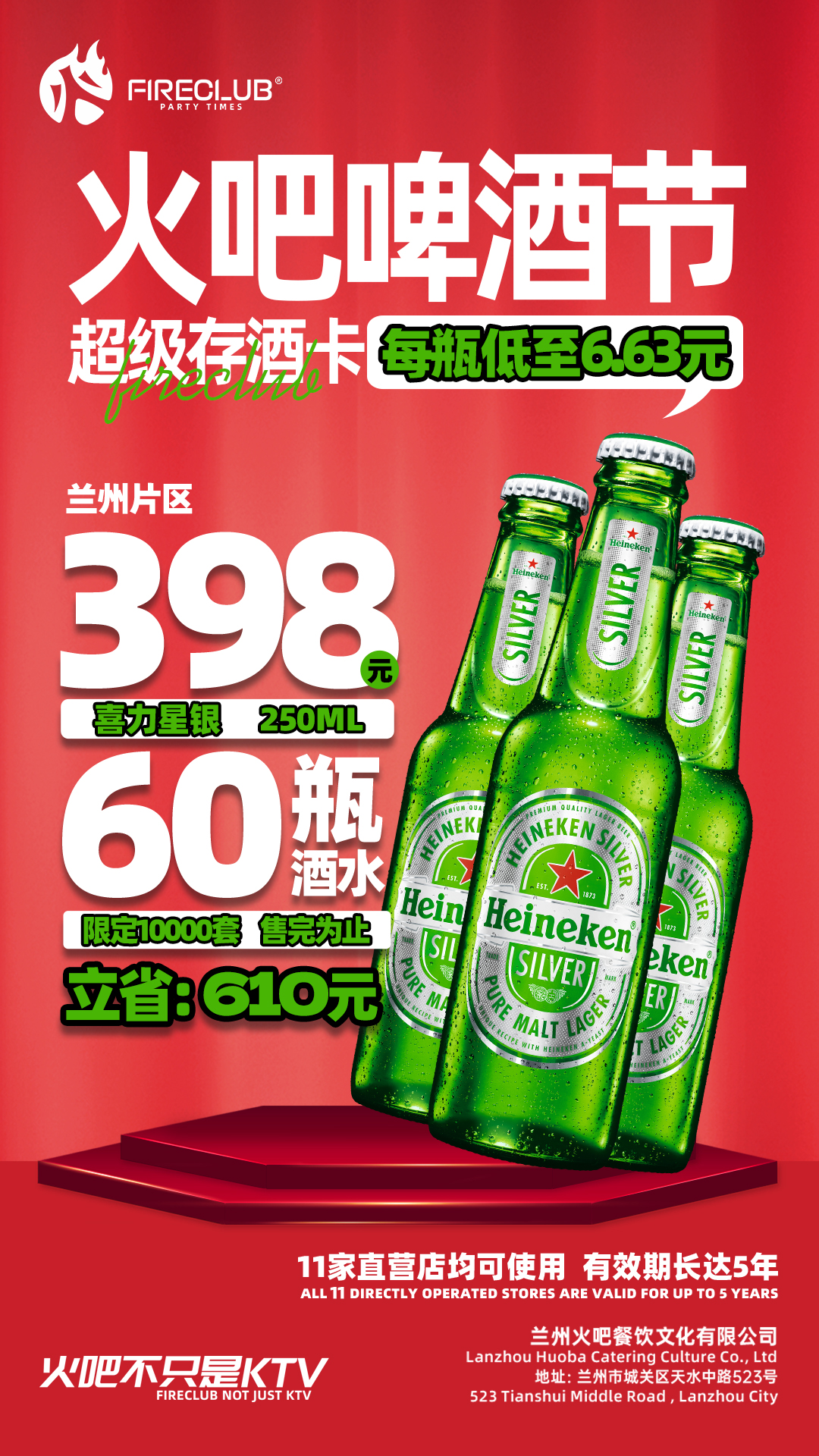 【兰州通用】118火吧啤酒节—超值存酒卡—398元60瓶喜力星银250ml