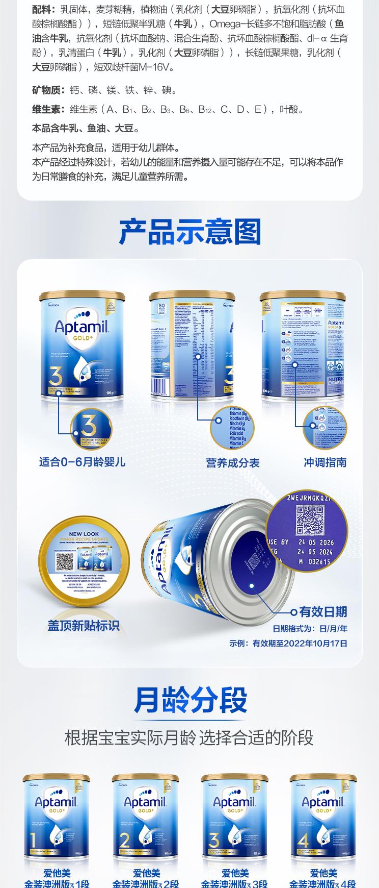 澳洲Aptamil爱他美婴幼儿配方奶粉金装3段900g(新旧版本随机)