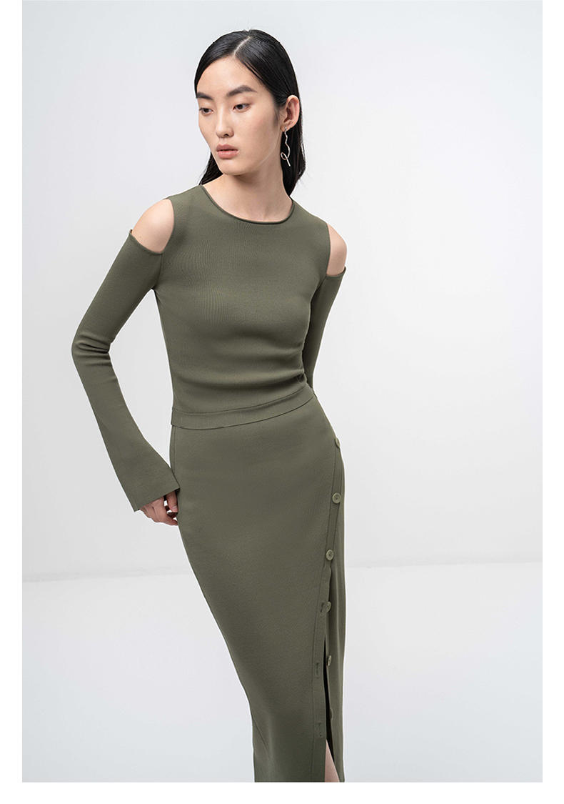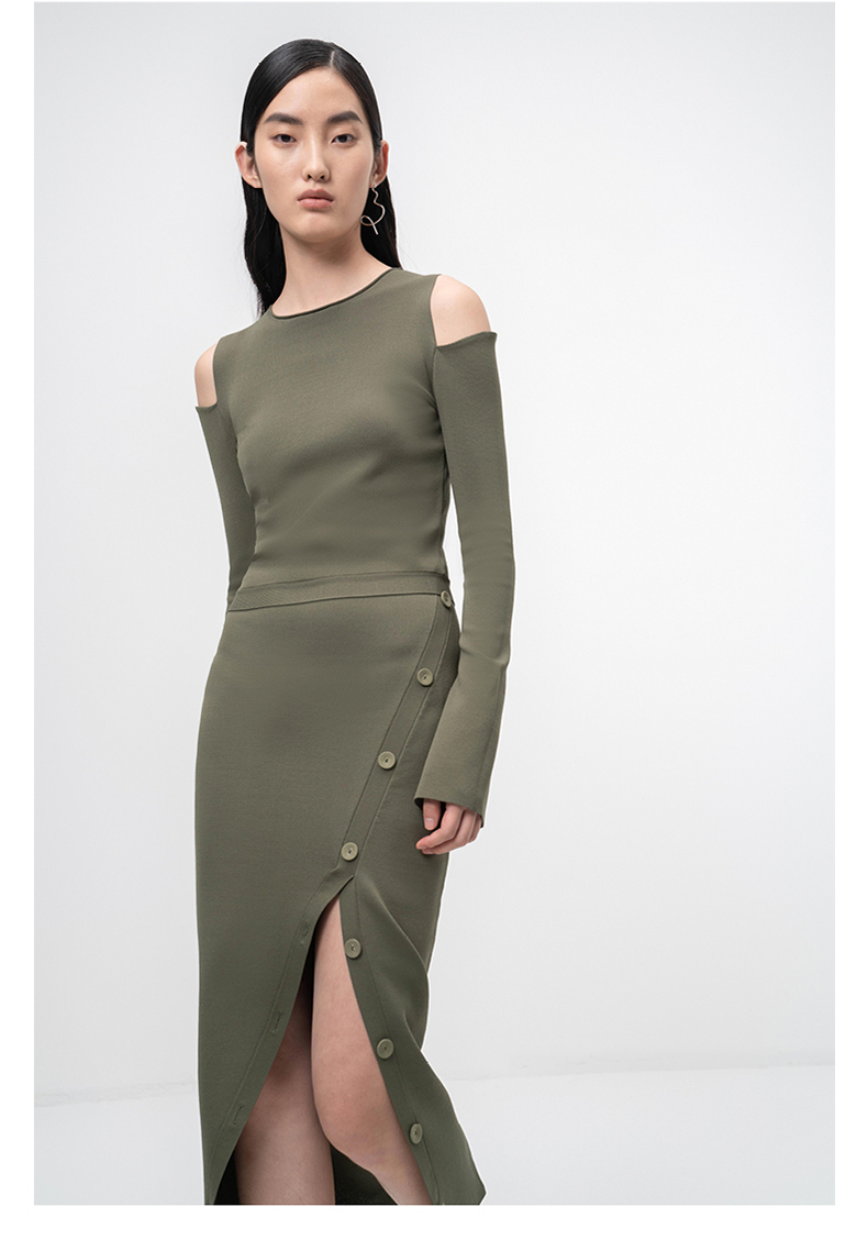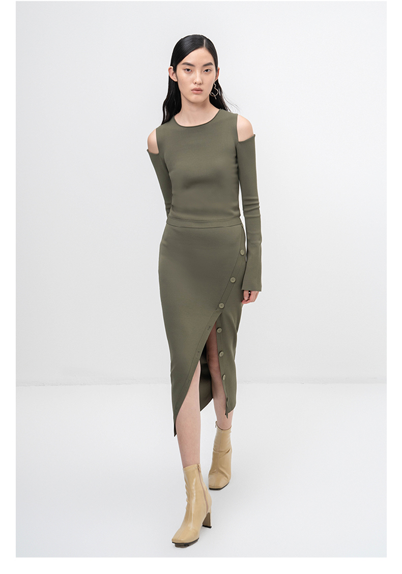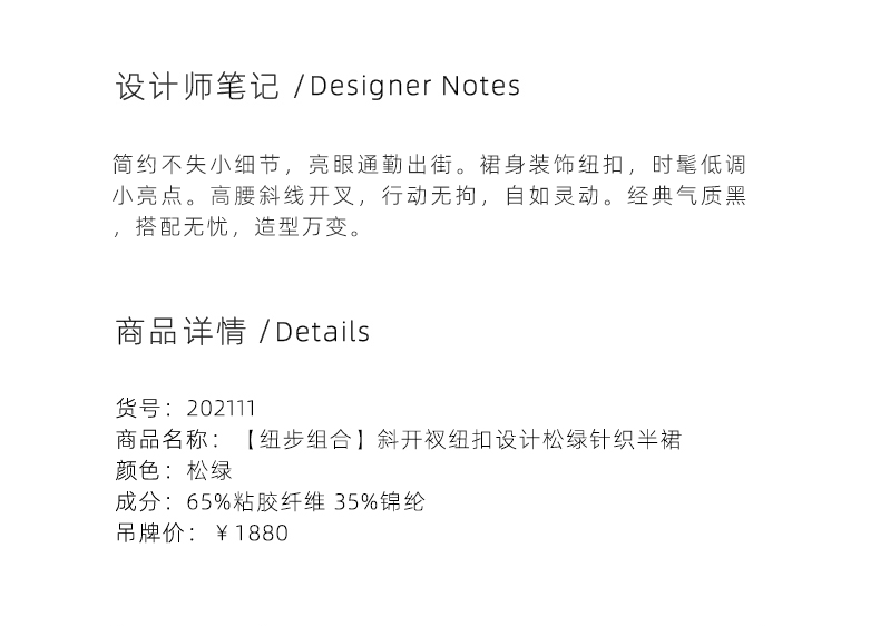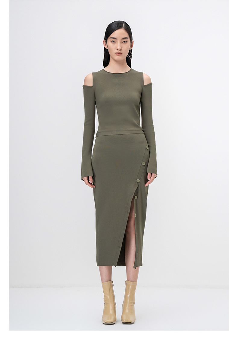 【纽步组合】斜开衩纽扣设计松绿针织半裙/202111