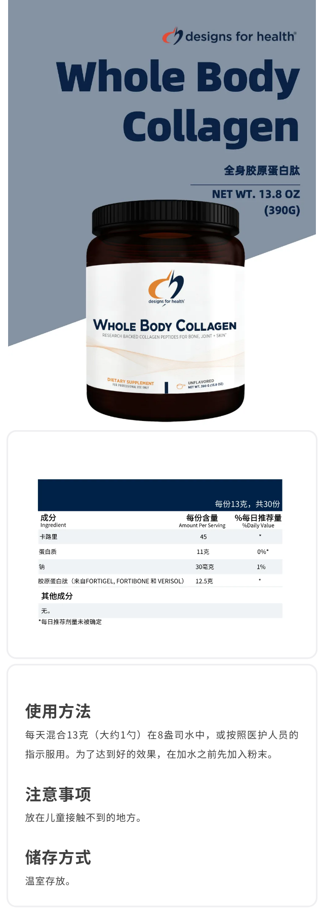 【香港直邮】海淘 健康设计 全身胶原蛋白肽 WHOLE BODY COLLAGEN 390克 27.08