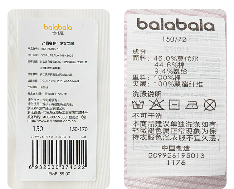 【balaOne】巴拉巴拉女内衣发育期防凸点儿童小背心少女文胸甜美