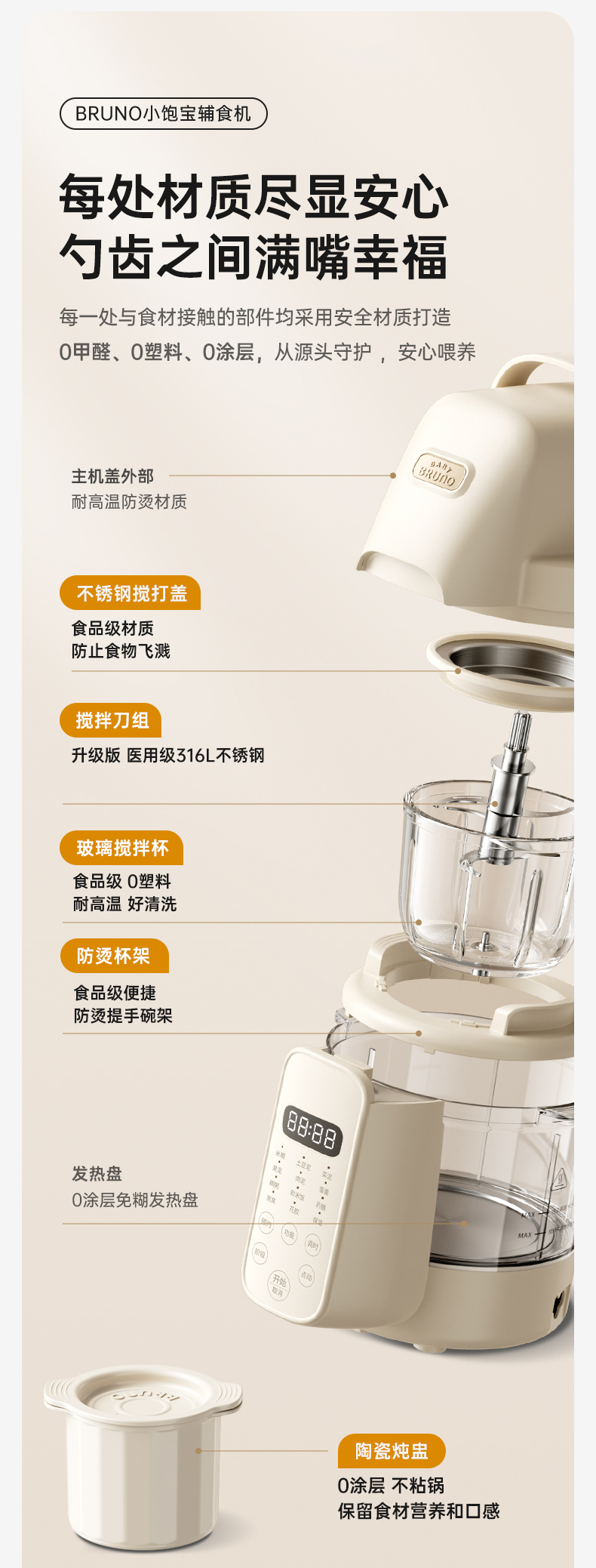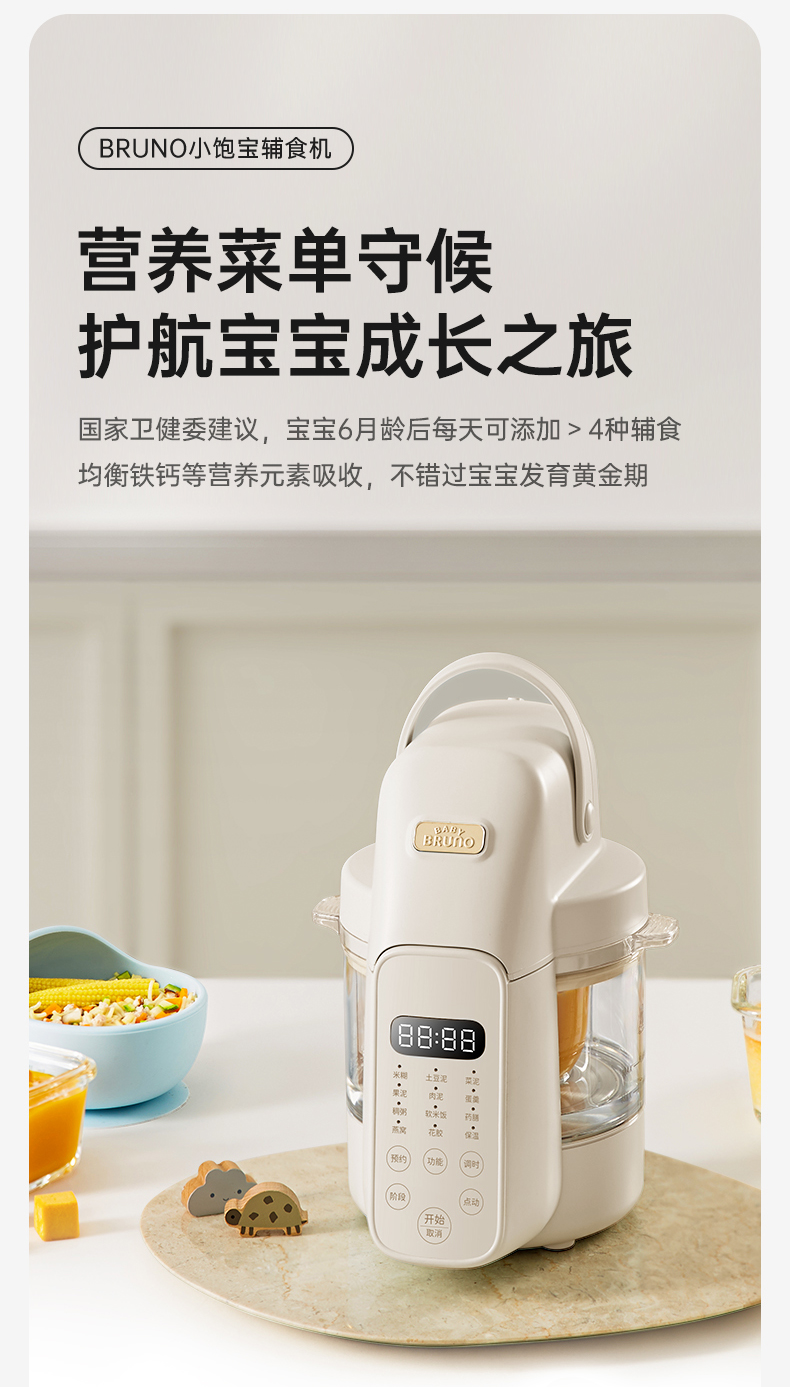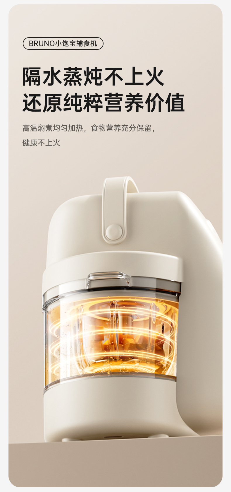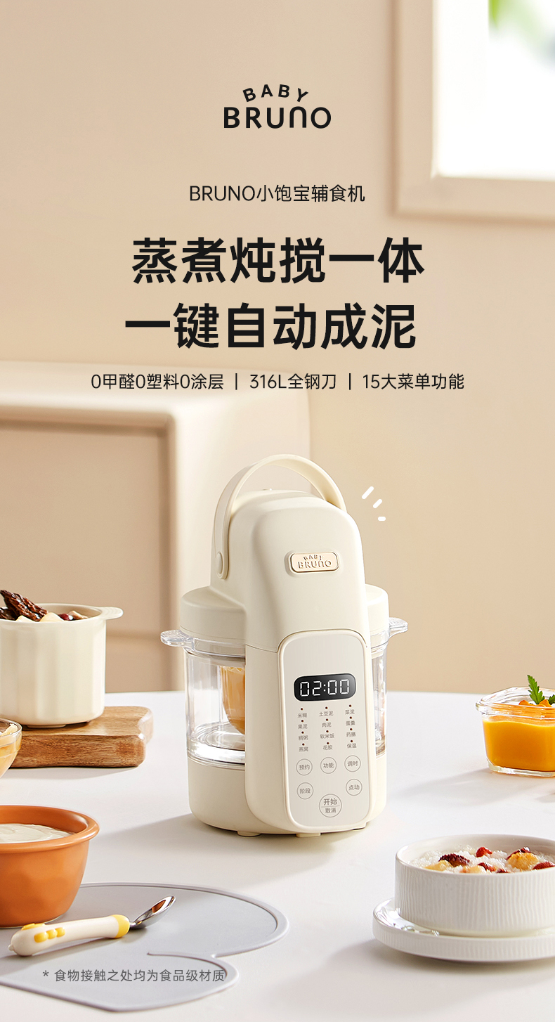 【宝宝辅食机】BRUNO小饱宝辅食机BZK-FSJ6LH01 全自动蒸煮炖搅一体 316L全钢刀 0甲醛0塑料0涂层 15大菜单 自动保温 24h定时预约