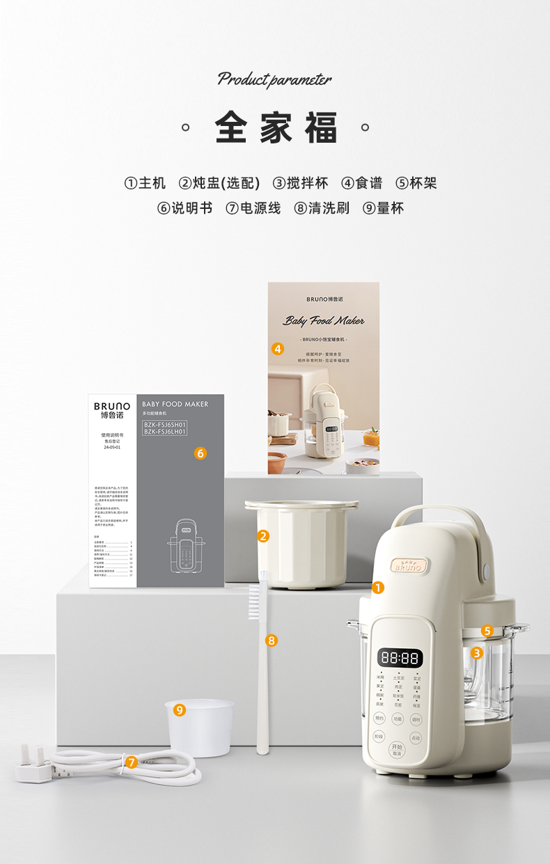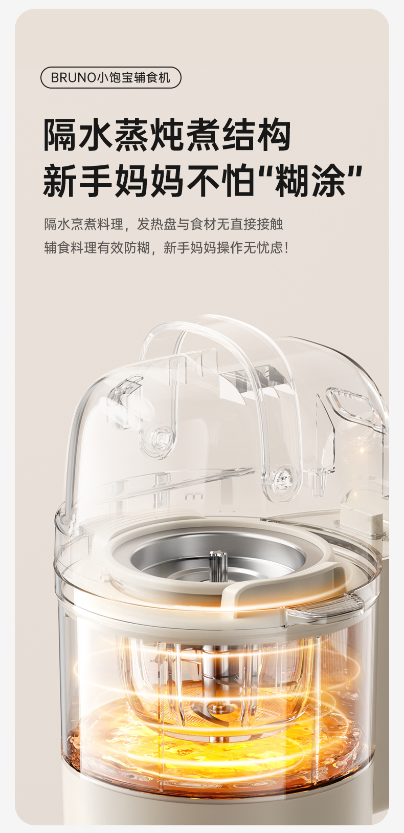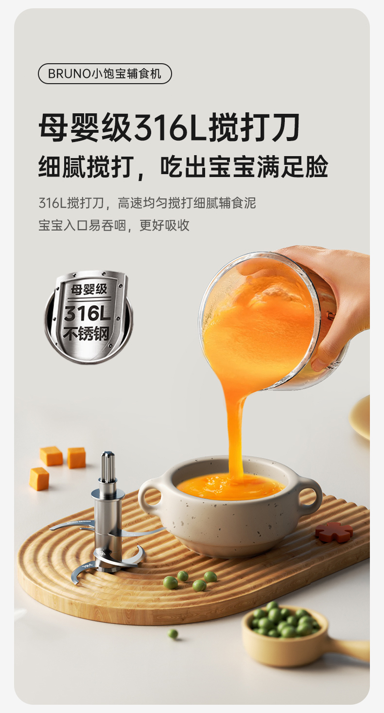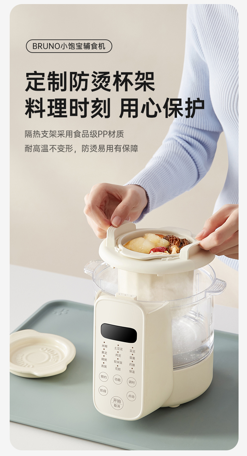 【宝宝辅食机】BRUNO小饱宝辅食机BZK-FSJ6LH01 全自动蒸煮炖搅一体 316L全钢刀 0甲醛0塑料0涂层 15大菜单 自动保温 24h定时预约