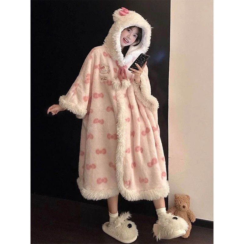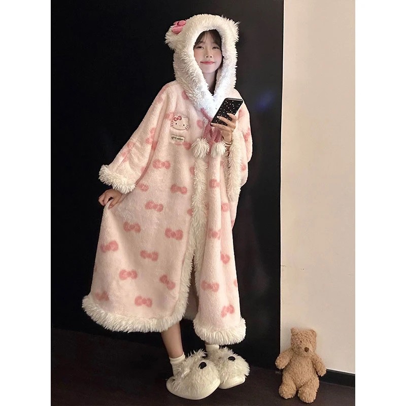 【YW】无忧购【甄选】凯蒂猫珊瑚绒睡袍套装女睡衣秋冬季加绒加厚可爱斗篷家居服(截单后3-5天发货)
