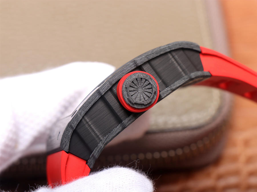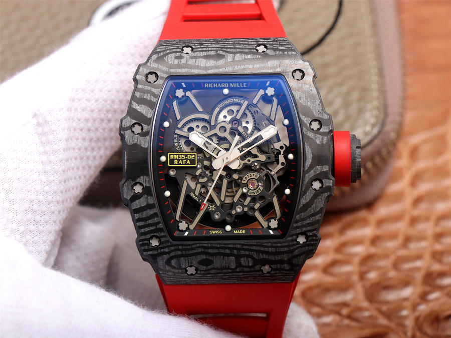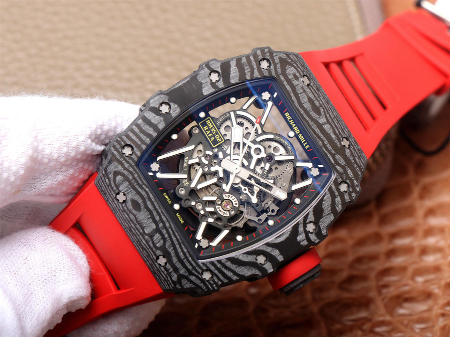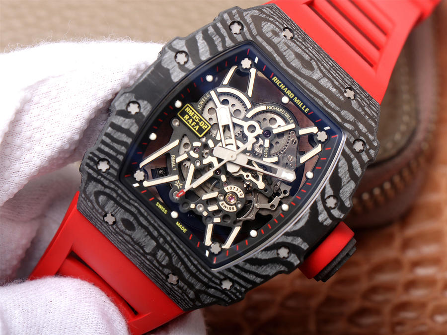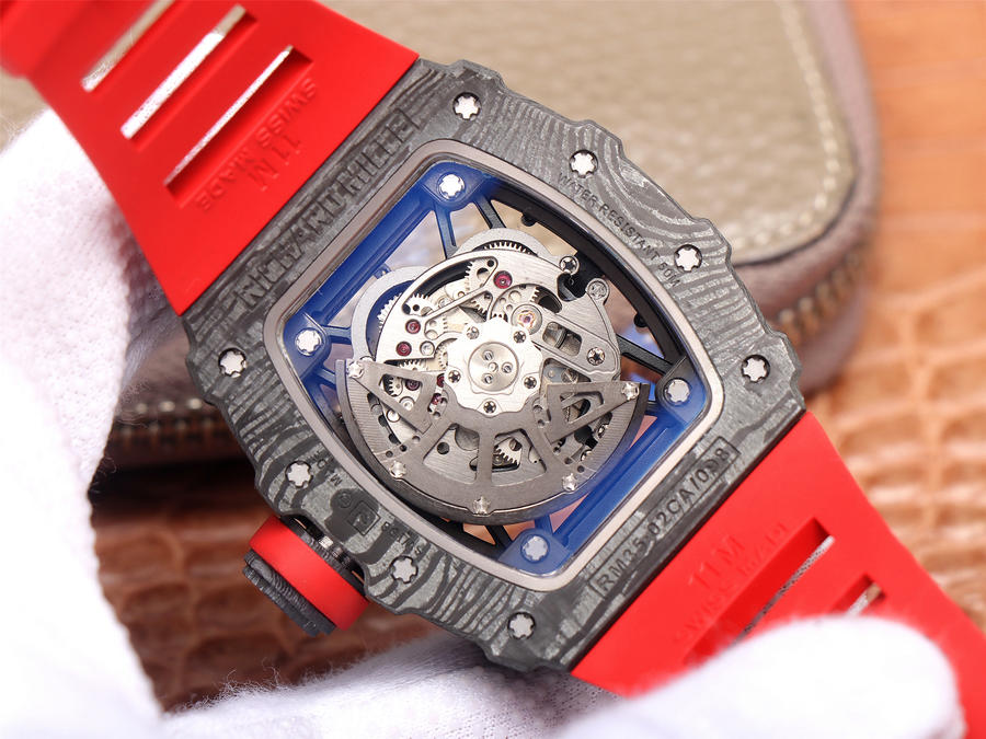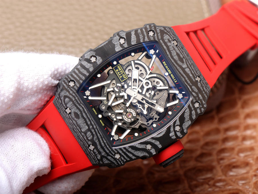 ZF理查德·米勒RM035,研发时间长达4年,把头、表壳、底盖均为碳纤维打造,男士腕表,橡胶表带,自动机械机芯,透底。