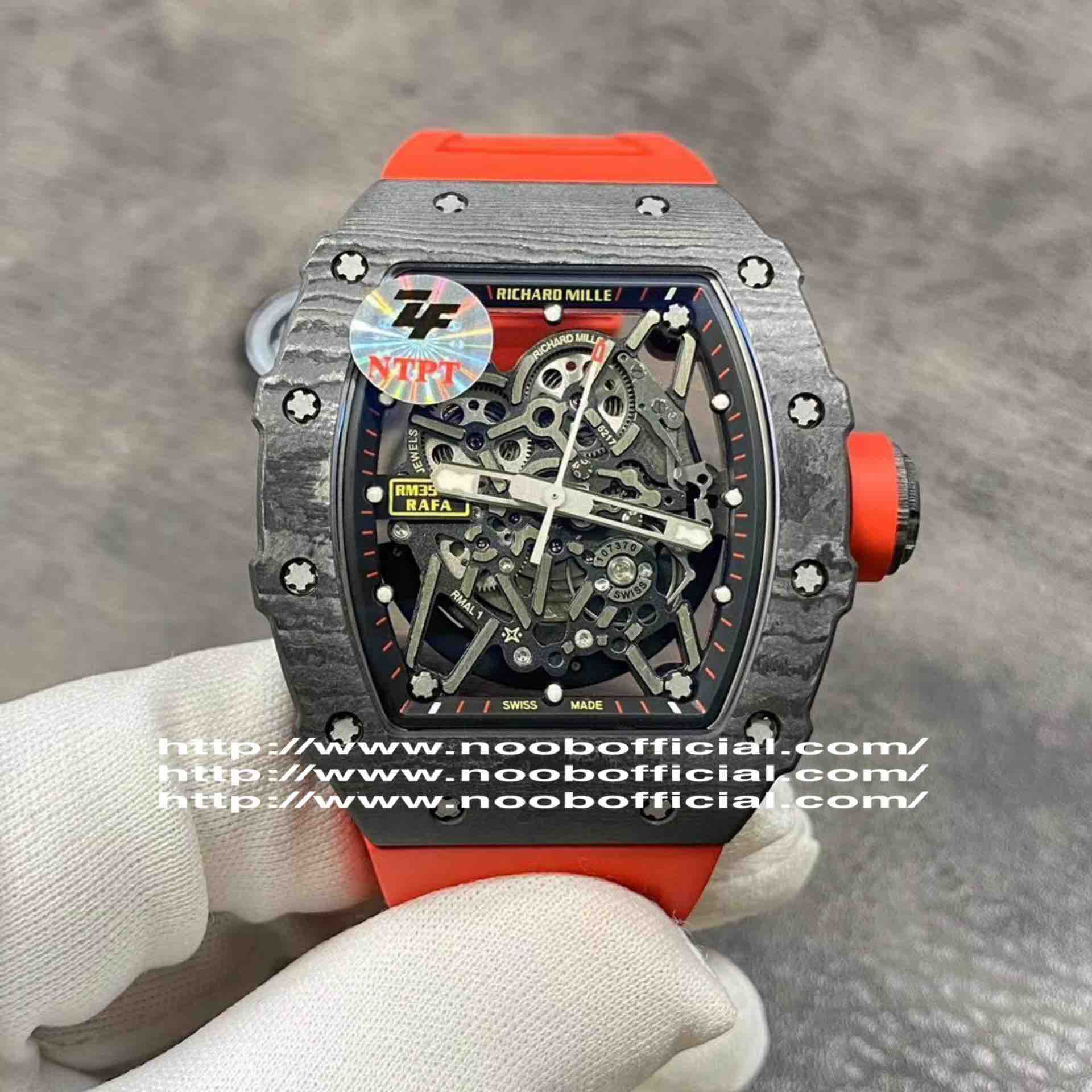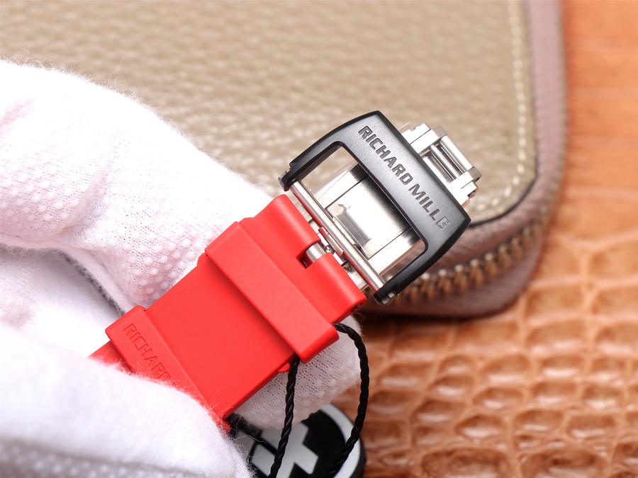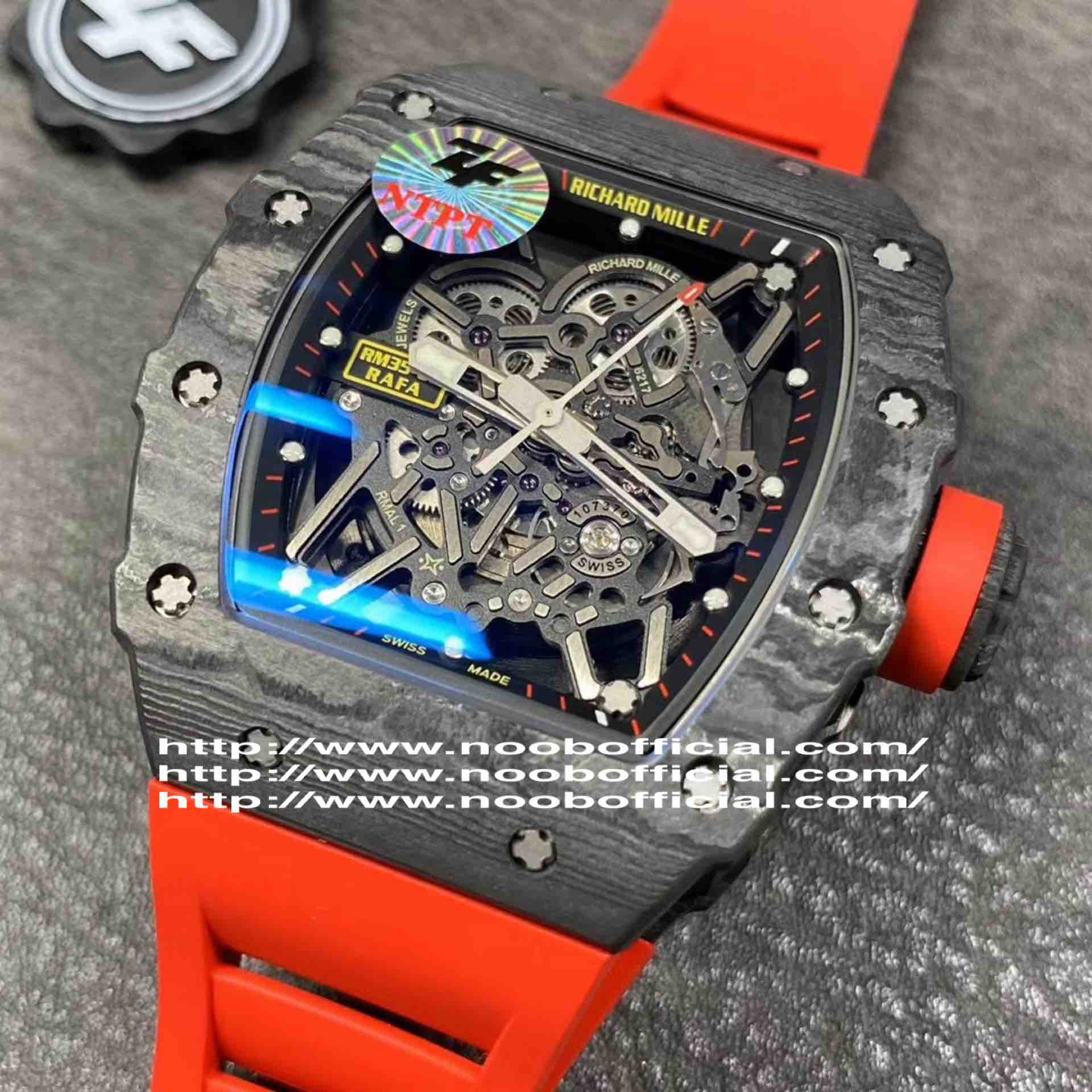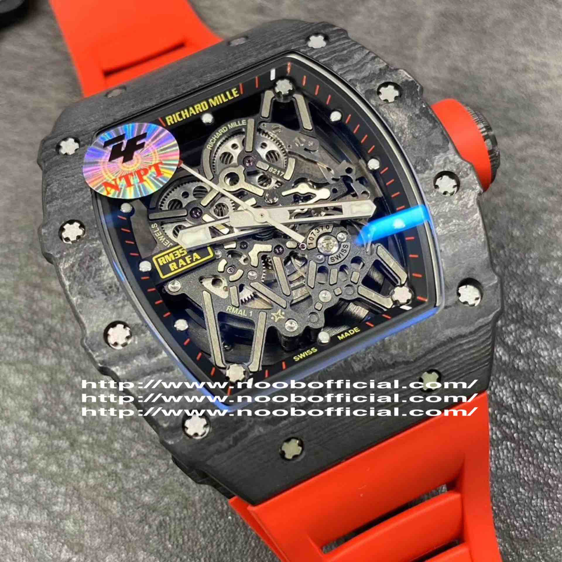 ZF理查德·米勒RM035,研发时间长达4年,把头、表壳、底盖均为碳纤维打造,男士腕表,橡胶表带,自动机械机芯,透底。