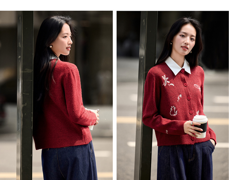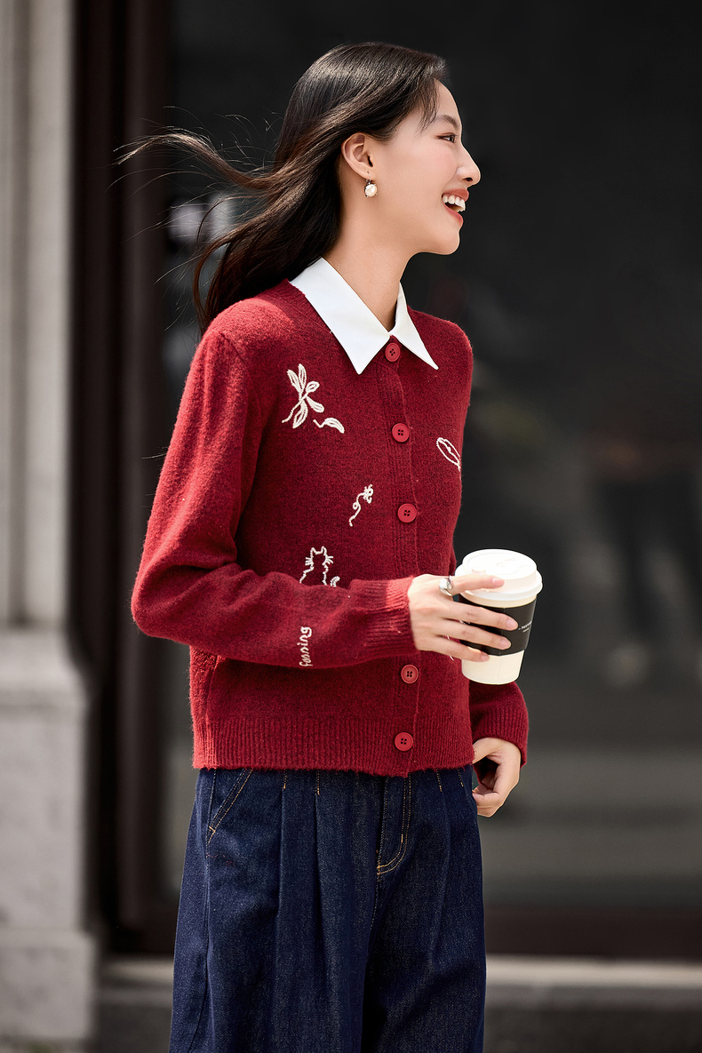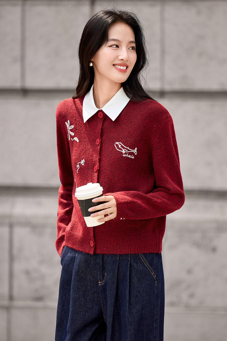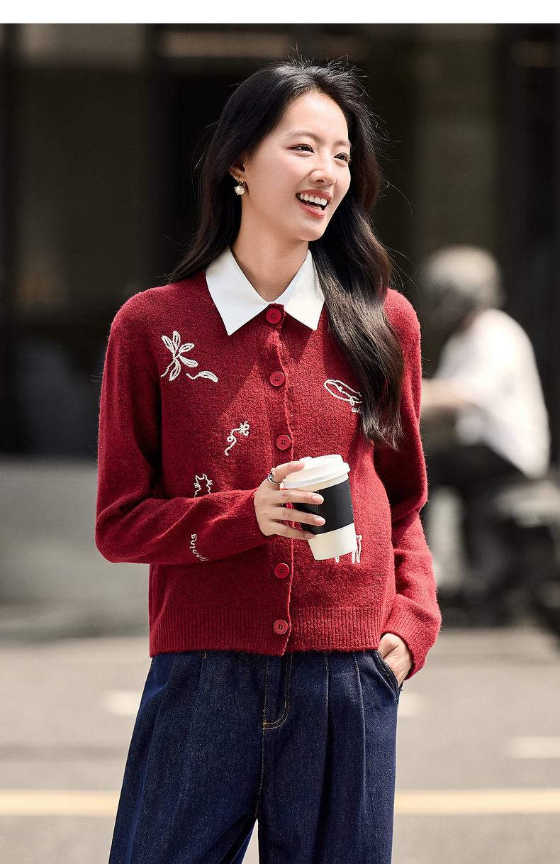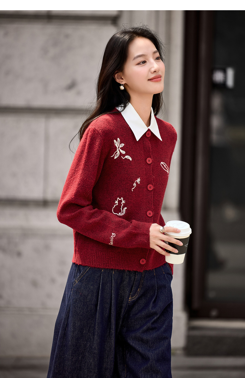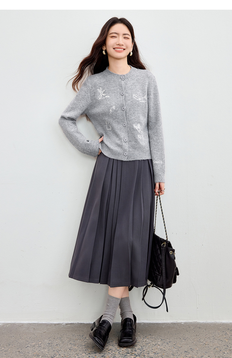 【内购】【福宝灵兽】通勤聚会圆领单排扣刺绣图案含绵羊毛超弹厚开衫毛衣-W54EB3810