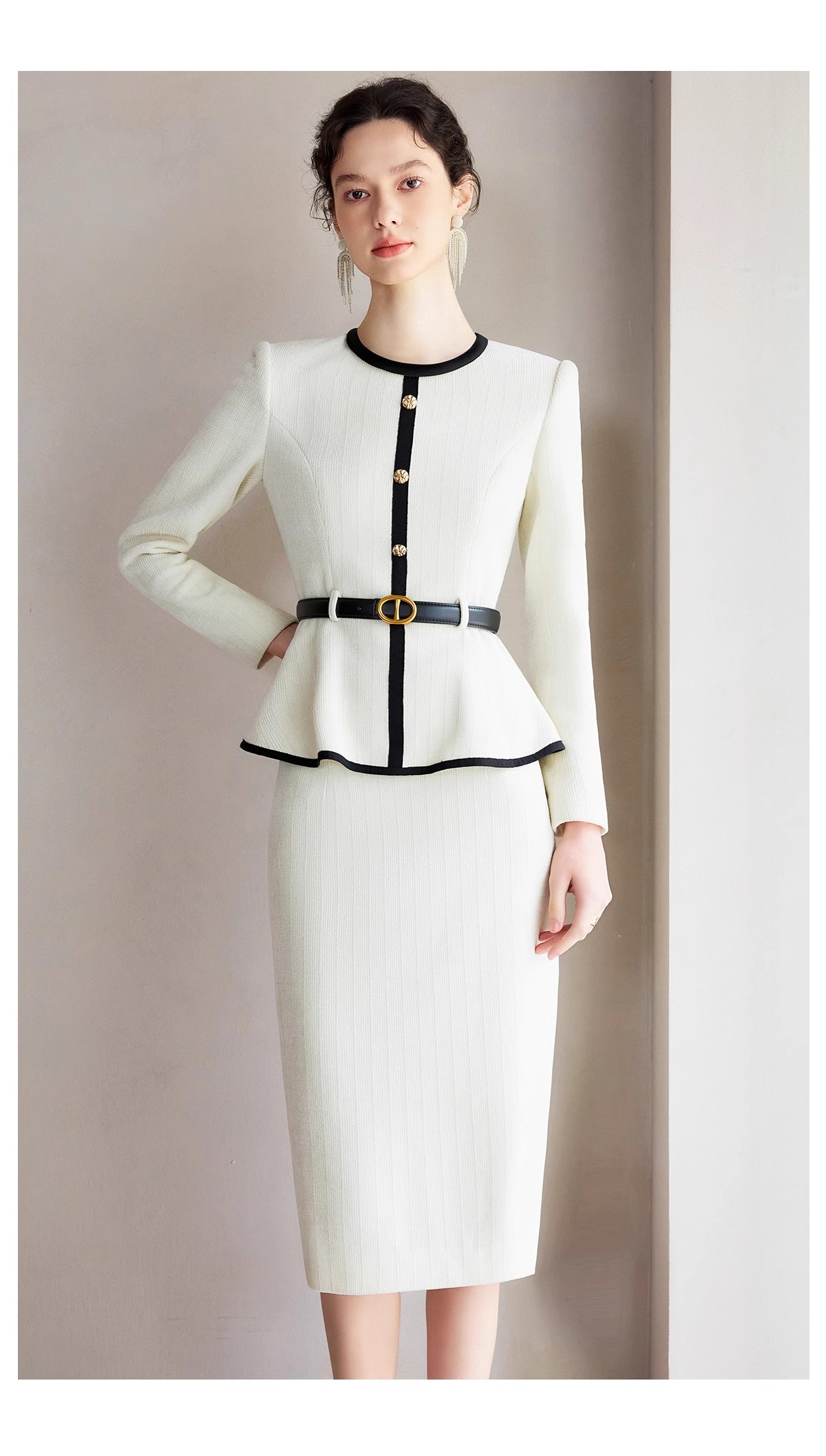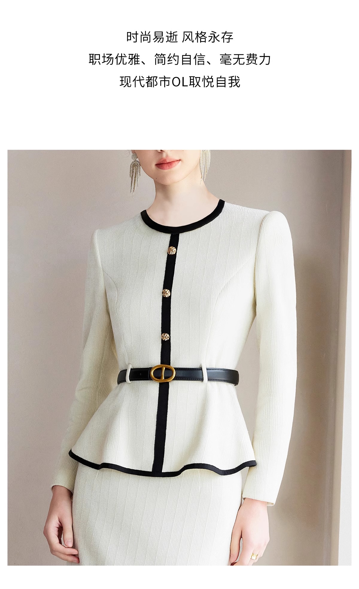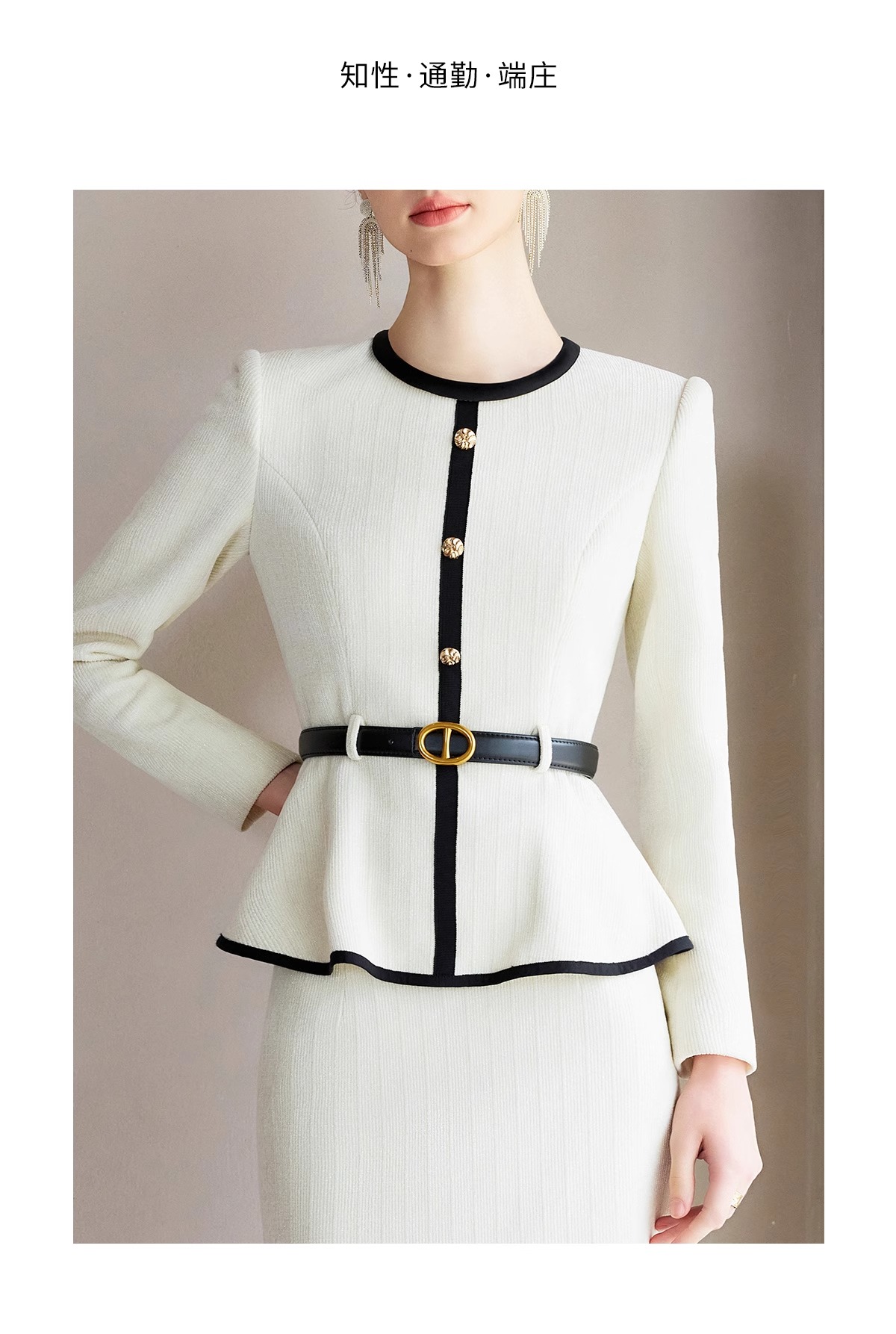 IWY/春季米白色长袖两件套女士职业装套装主持接拼小香风千金风西装裙CS2218