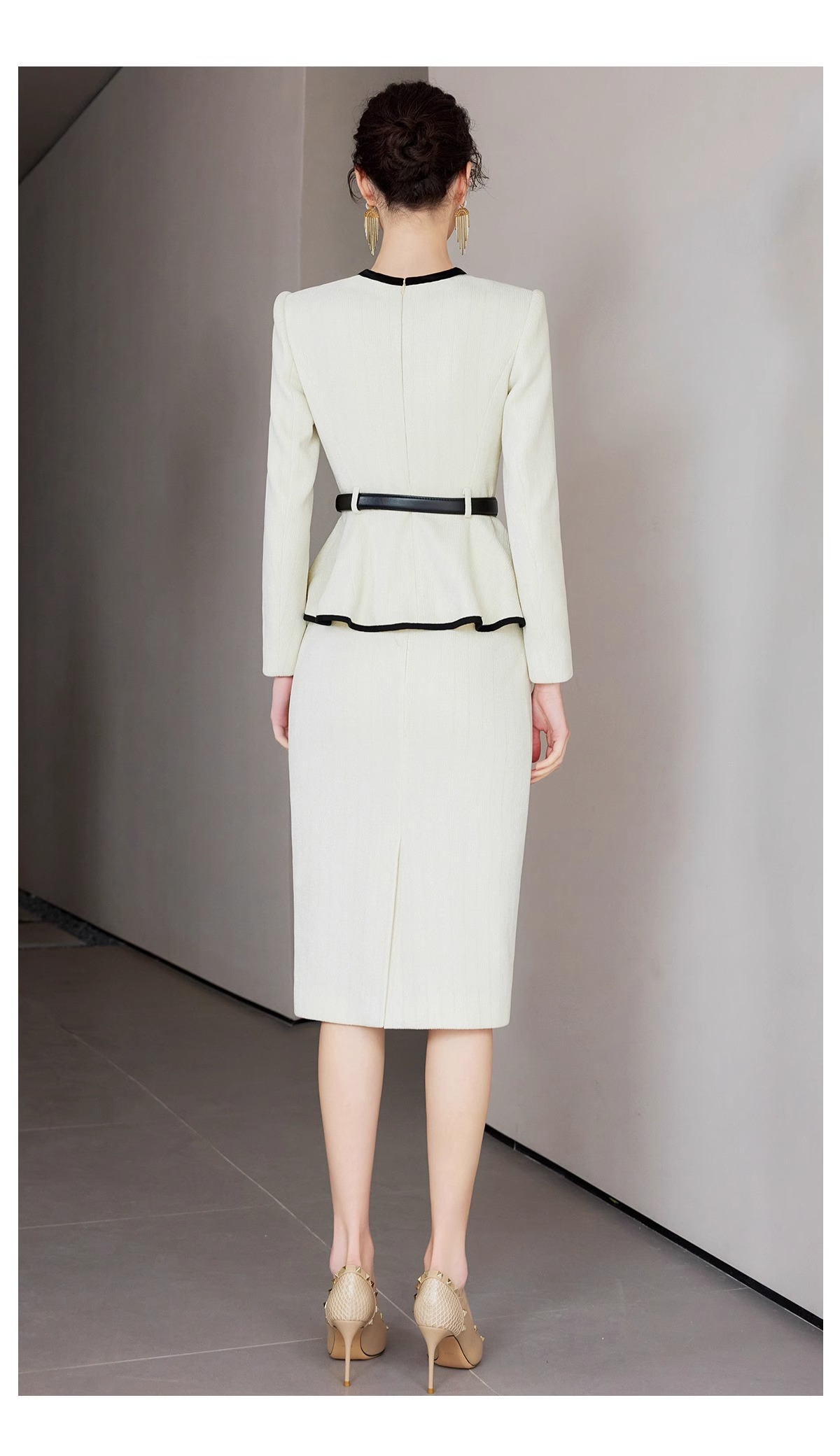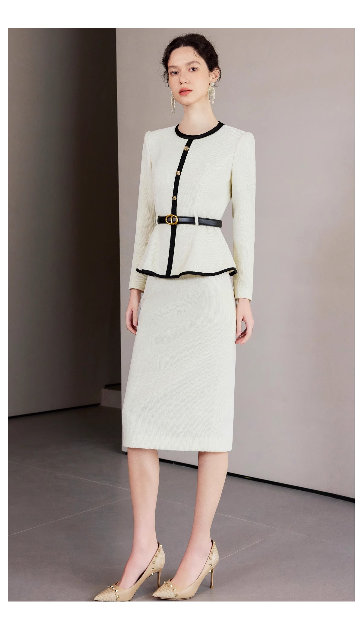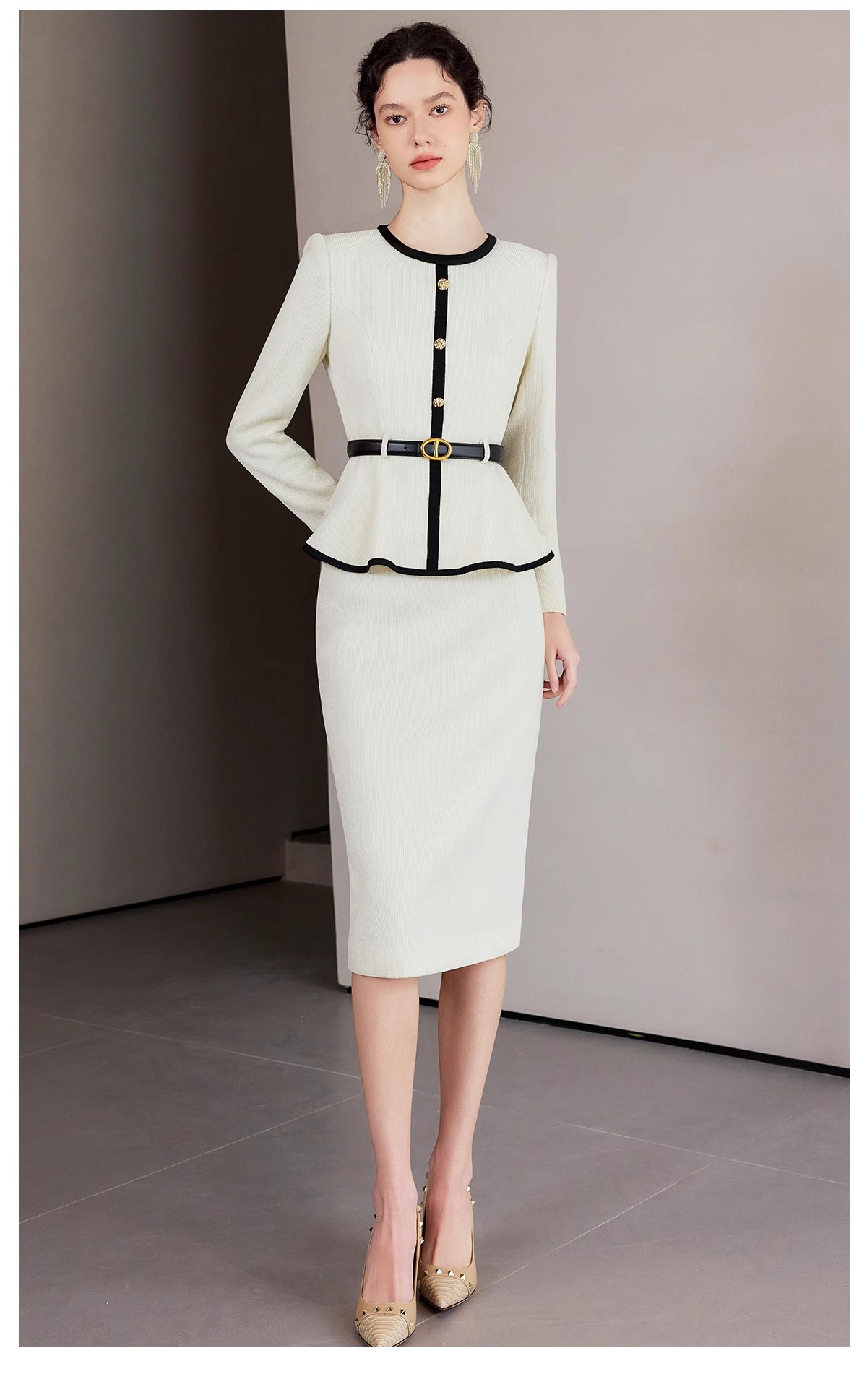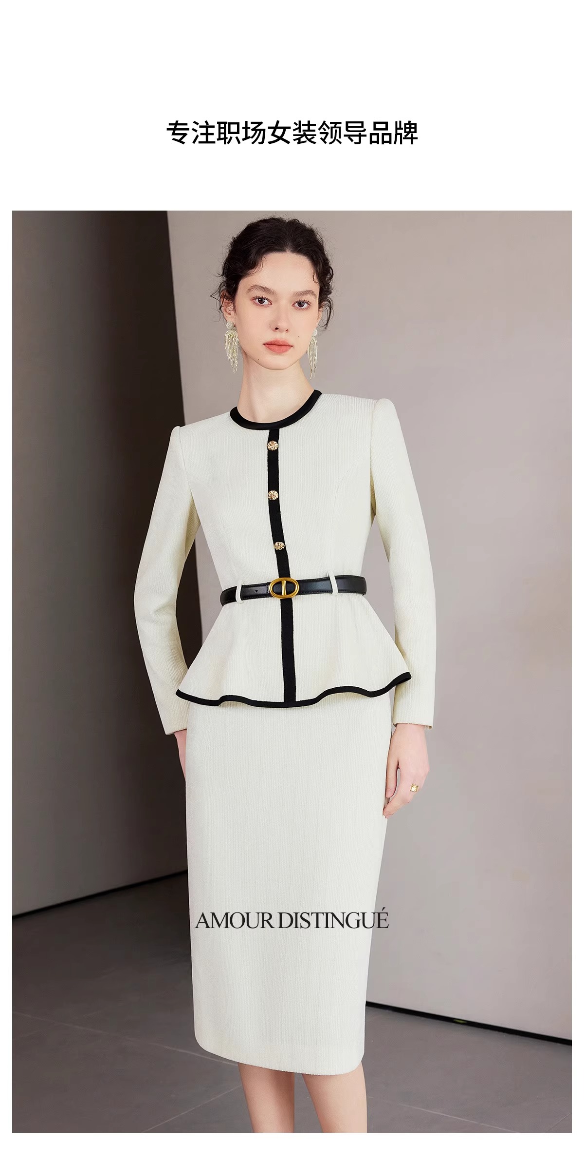 IWY/春季米白色长袖两件套女士职业装套装主持接拼小香风千金风西装裙CS2218