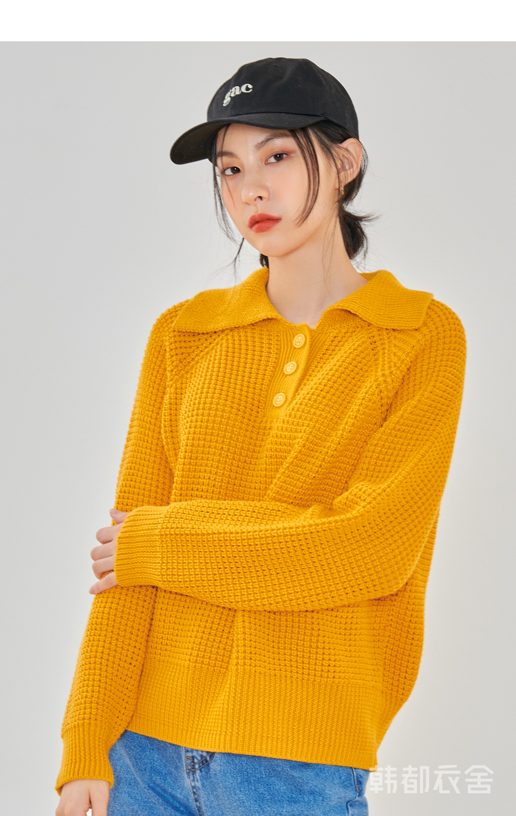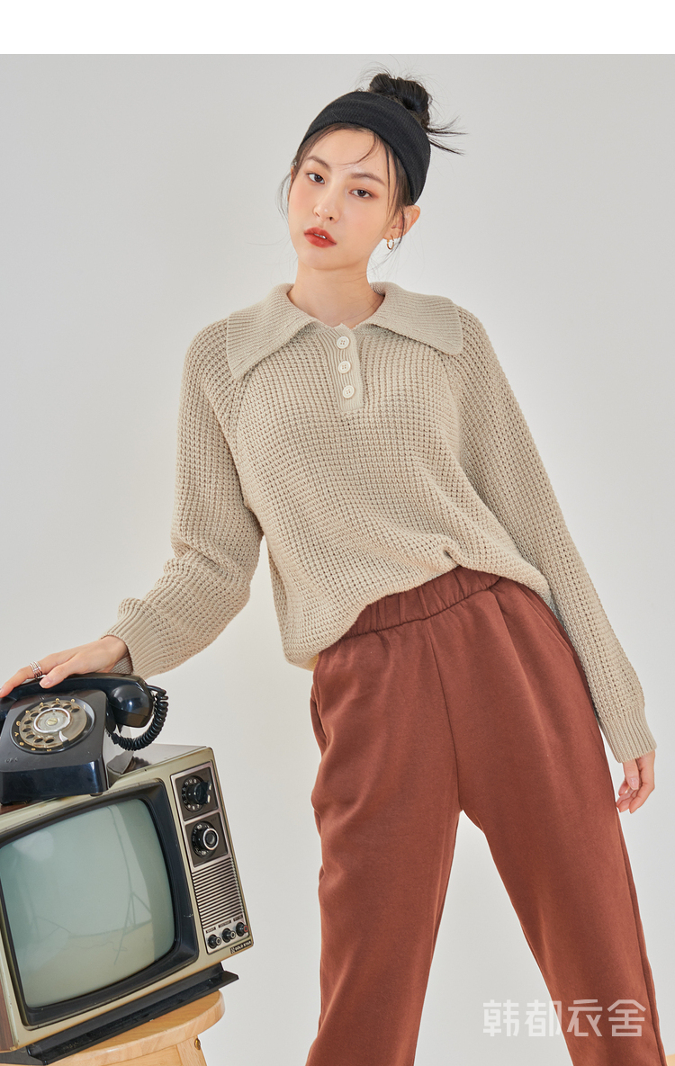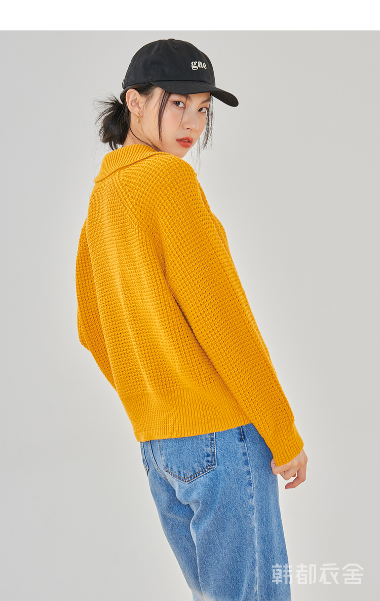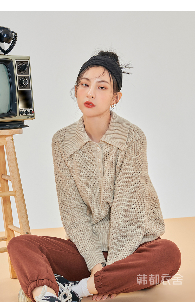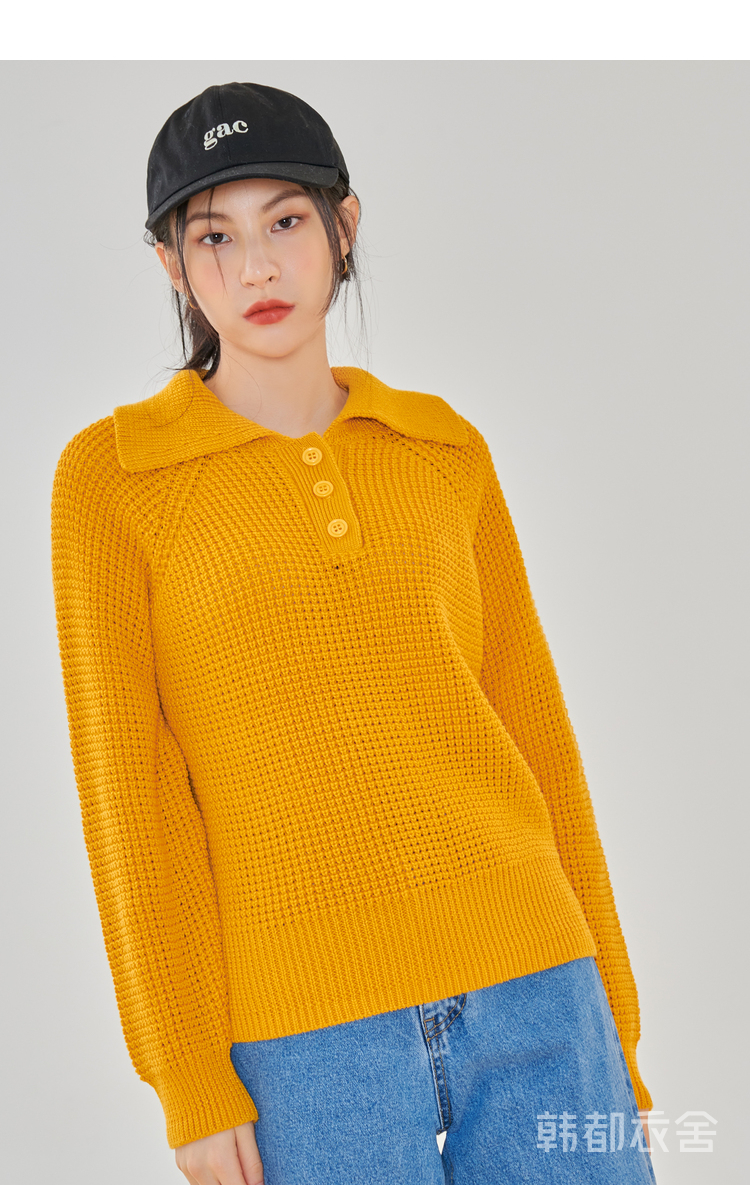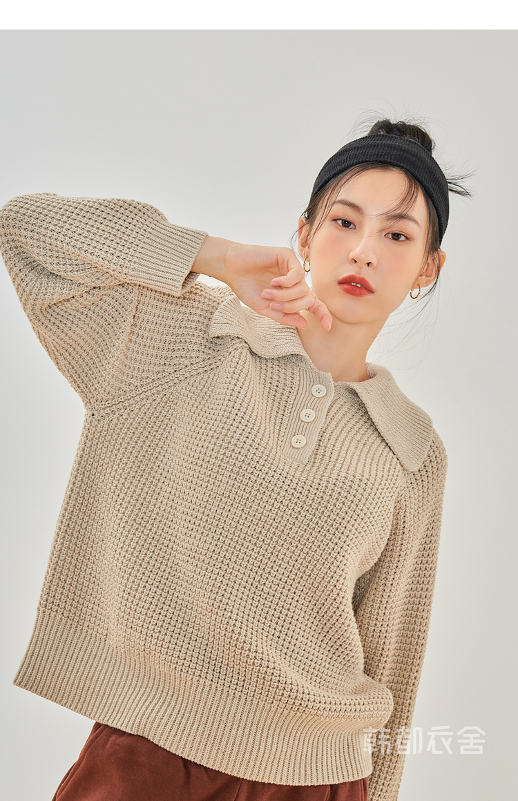 韩都衣舍2021春季新款宽松显瘦复古POLO领长袖毛衣女CQ9769僥