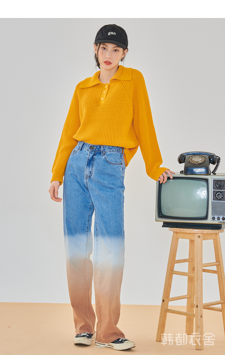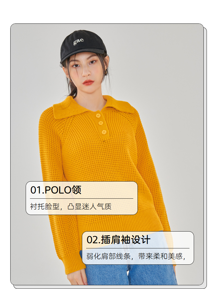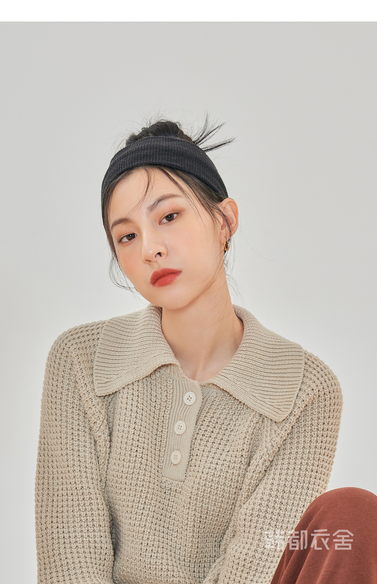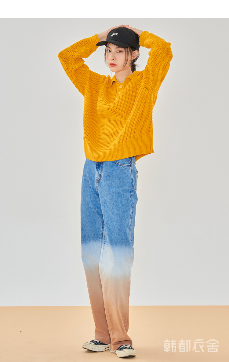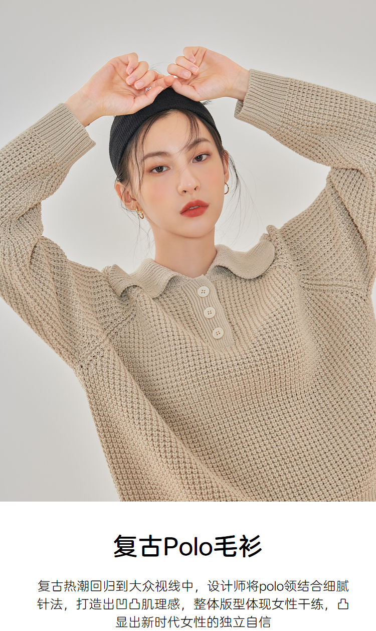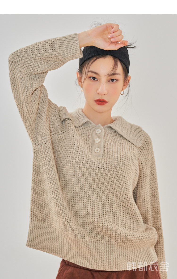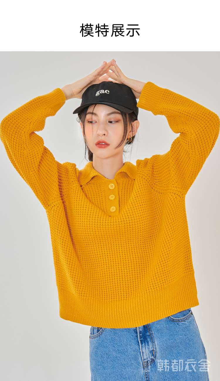 韩都衣舍2021春季新款宽松显瘦复古POLO领长袖毛衣女CQ9769僥