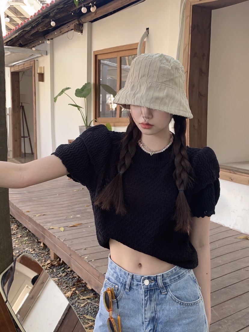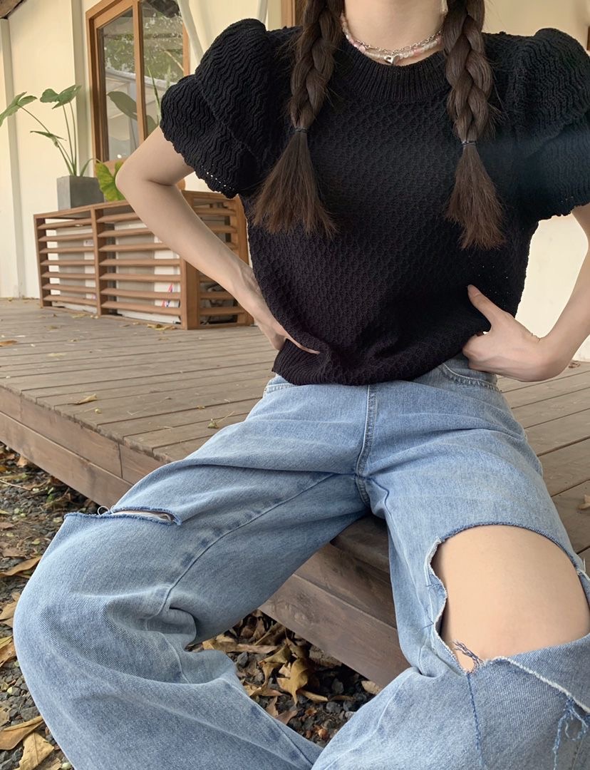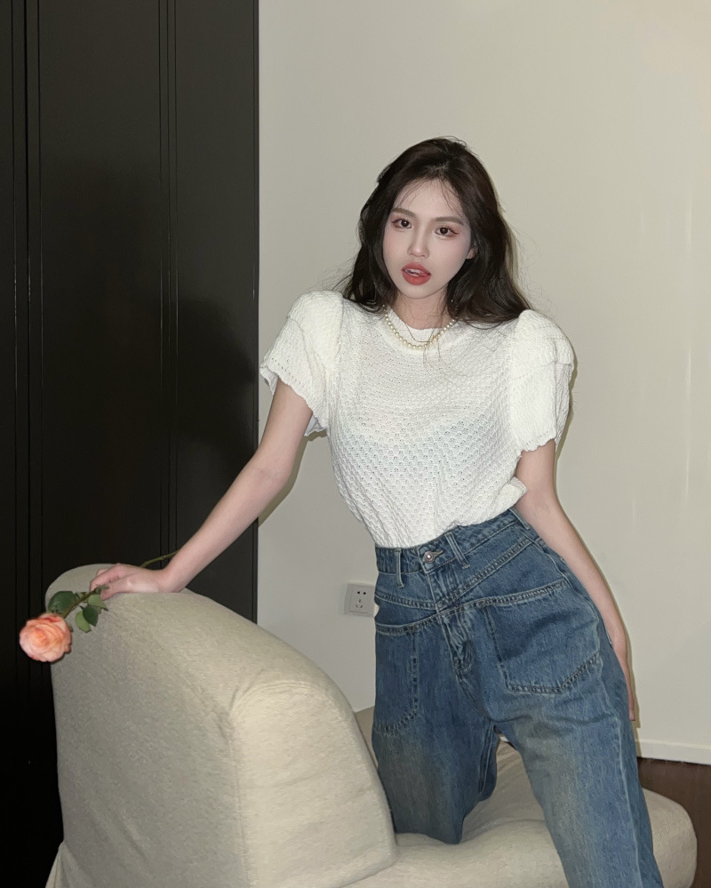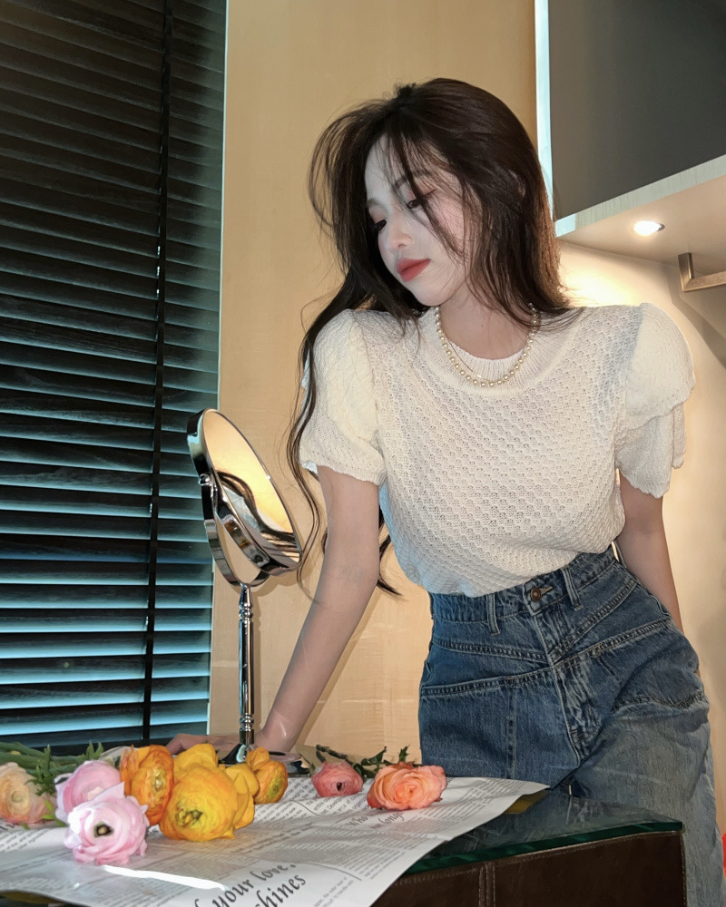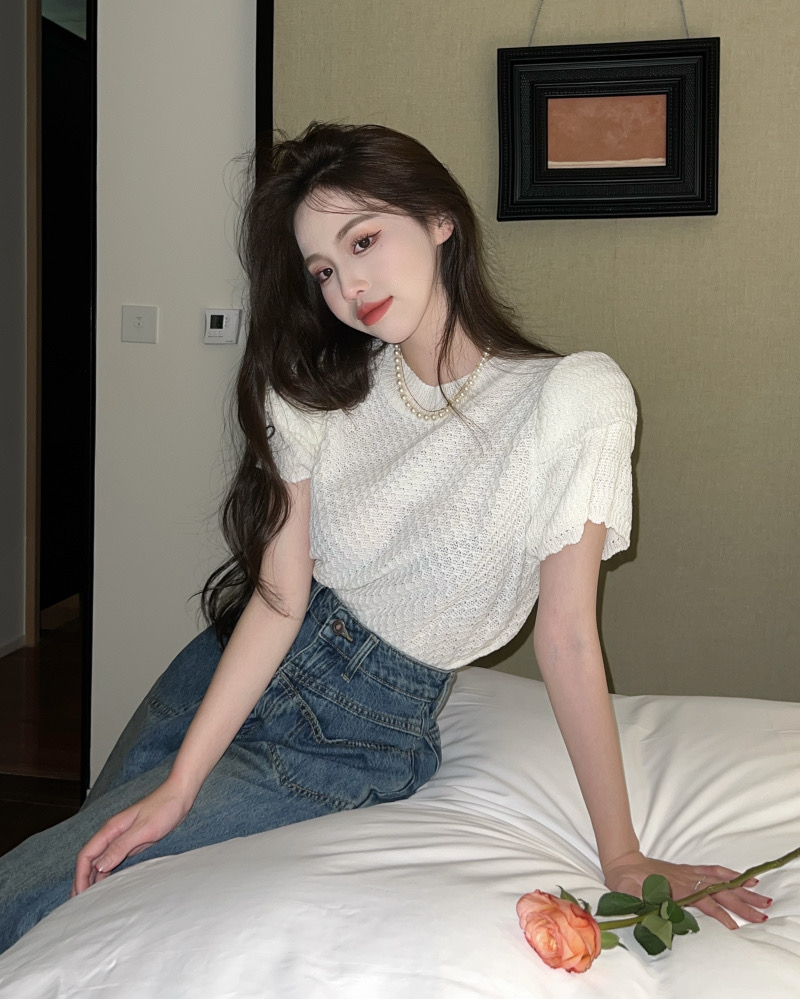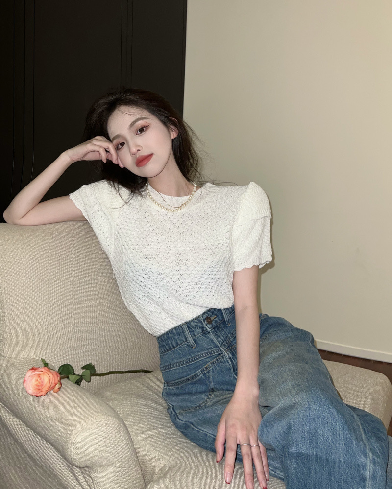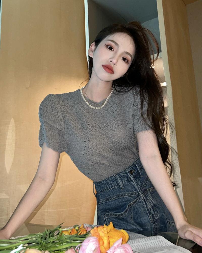 【品名】啄木鸟百搭镂空泡泡袖上衣