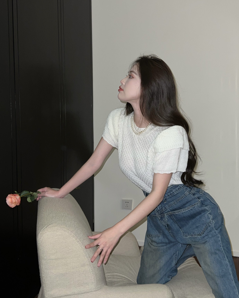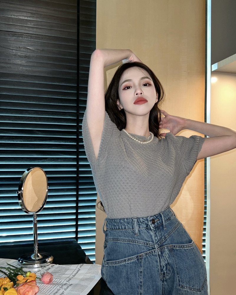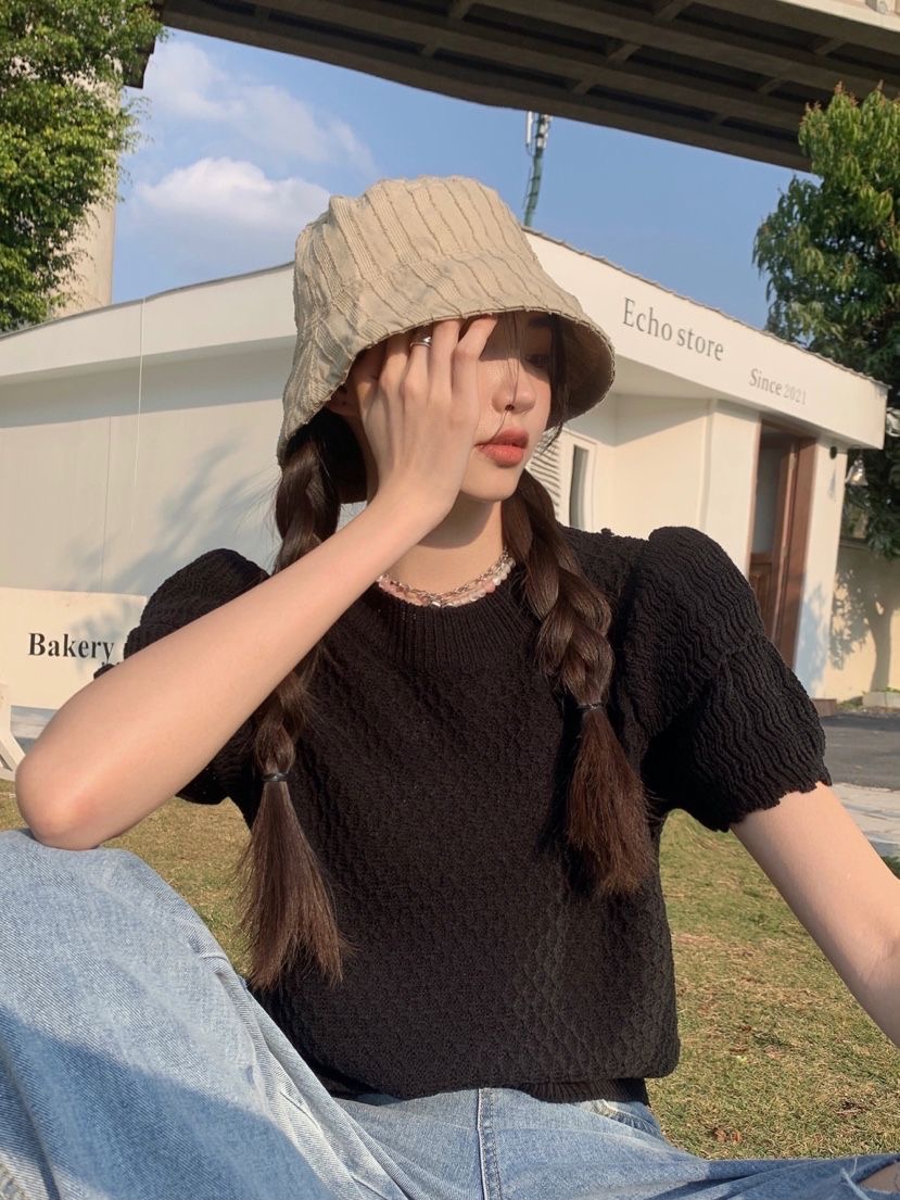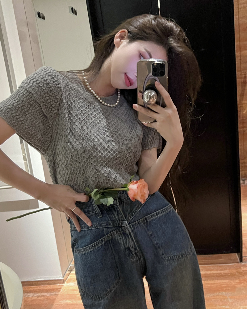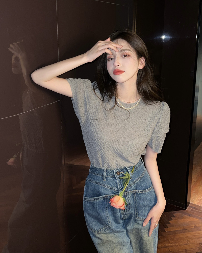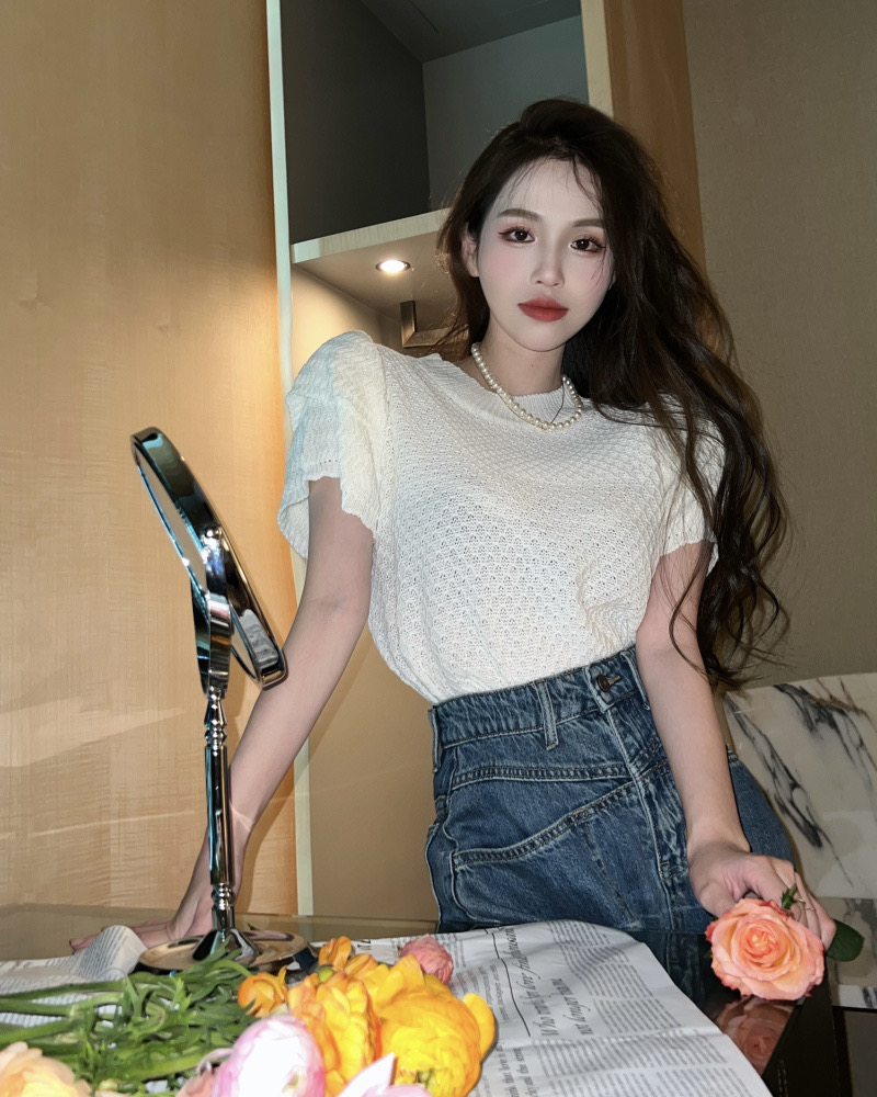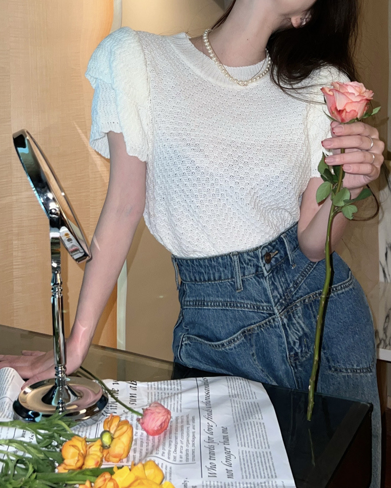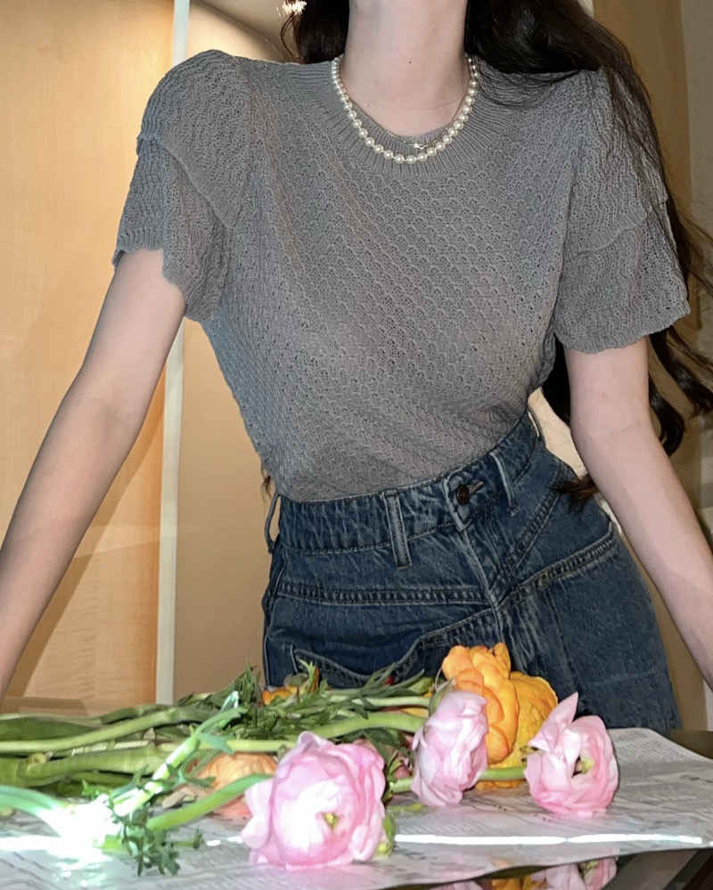 【品名】啄木鸟百搭镂空泡泡袖上衣