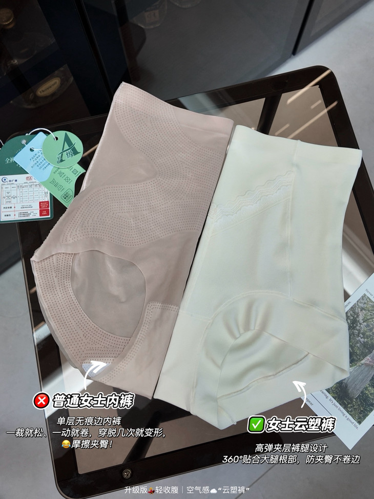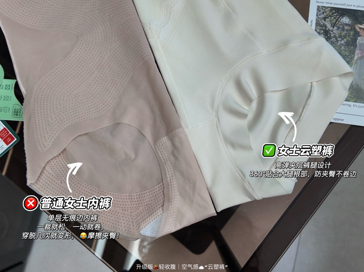 🎬实验室数据⬇️对比:足够「稳」② ✅高弹夹层裤腿设计:360°贴合大腿根部,防夹臀不卷边,剧烈活动后依旧稳固如初! ❌区别单层无痕边内裤:一裁就松、一动就卷,穿脱几次就变形,😂摩擦夹臀尴尬不断!