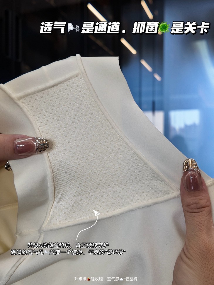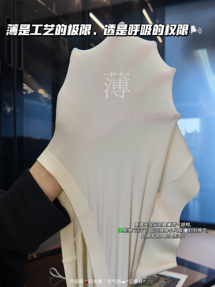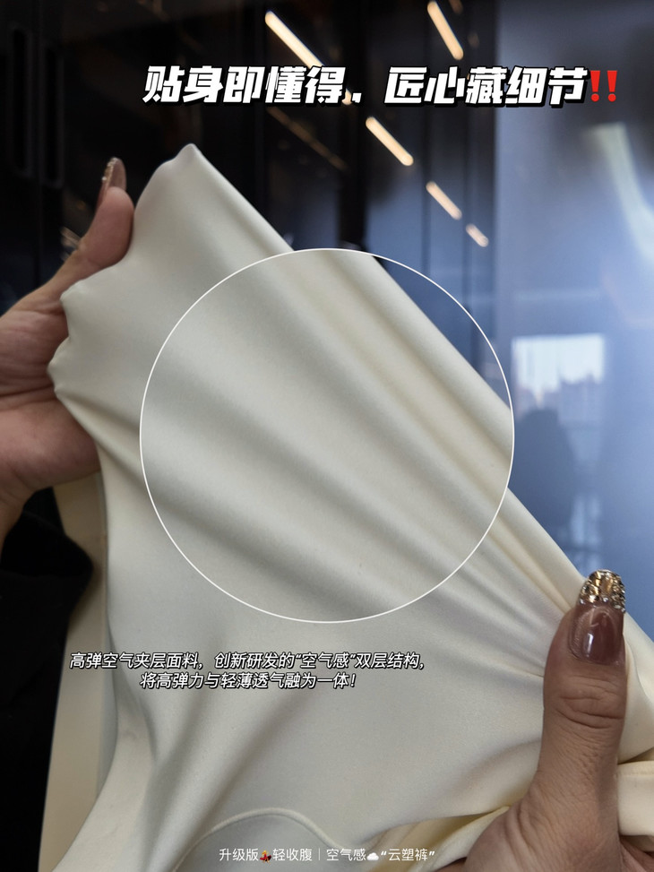 🎬2020高弹“空气夹层”面料2️⃣ 创新研发的“空气感”双层结构,将高弹力与轻薄透气融为一体! ✅面料外层柔滑亲肤,内层微压支撑,形成会呼吸的立体夹层—— 区别于市面上厚重紧绷的收腹裤, ⚠️真正做到“穿着无物,塑形有术”‼️