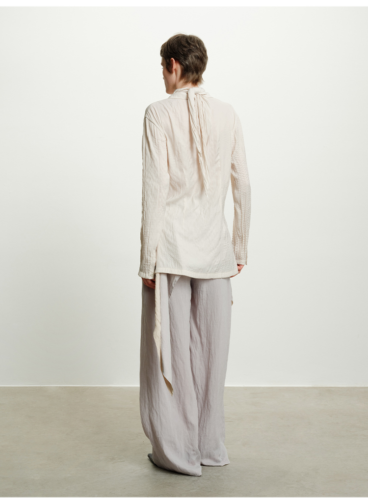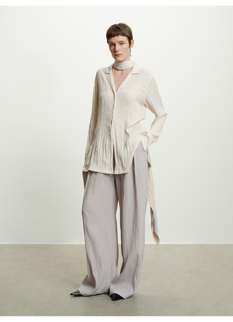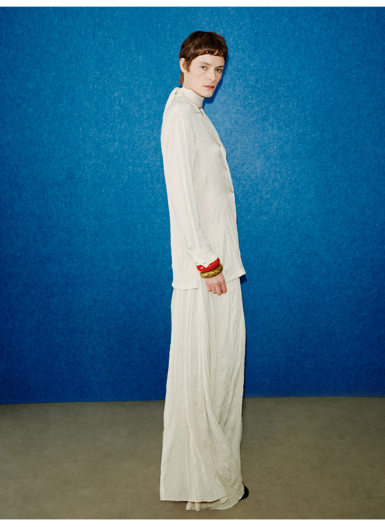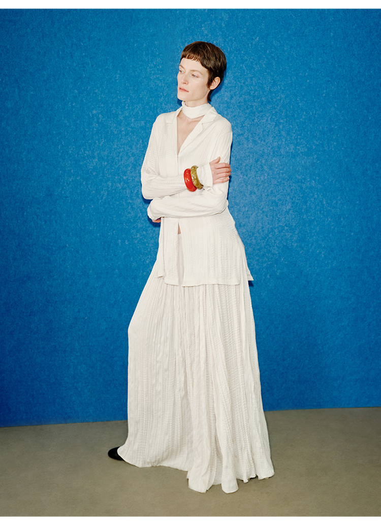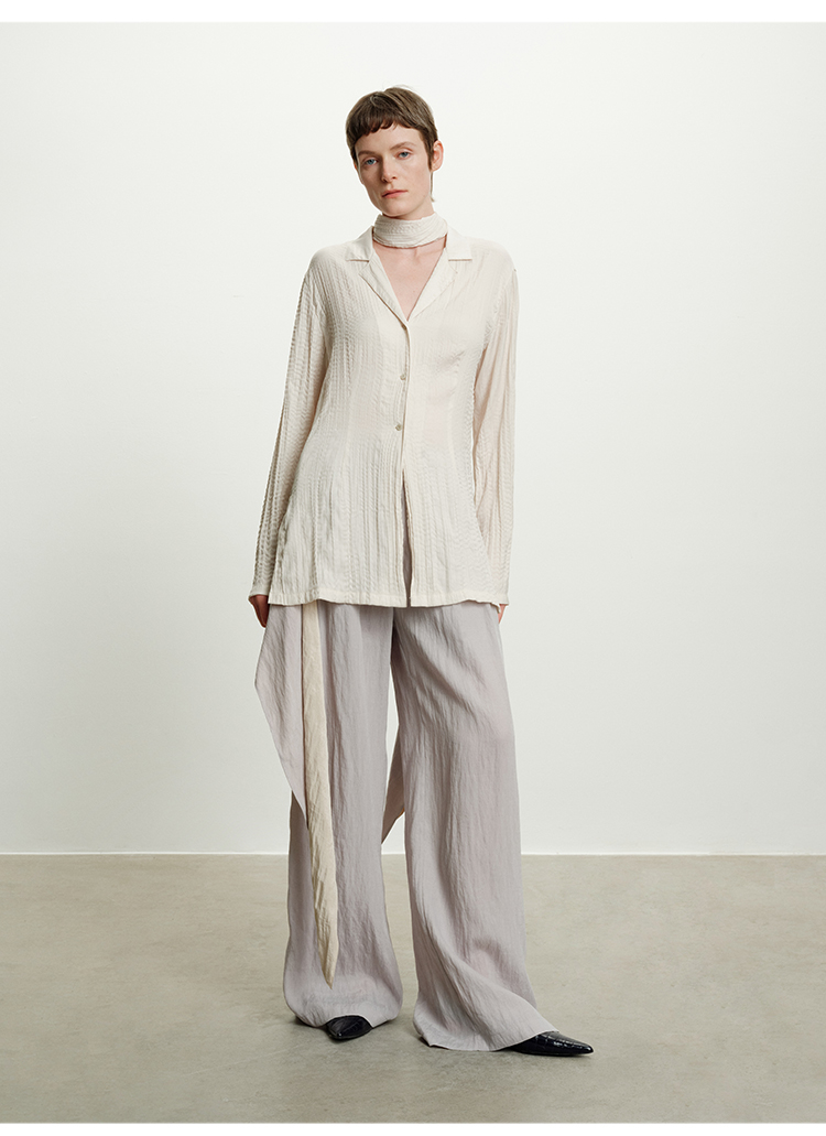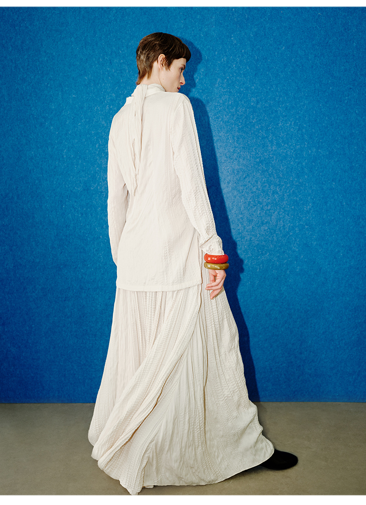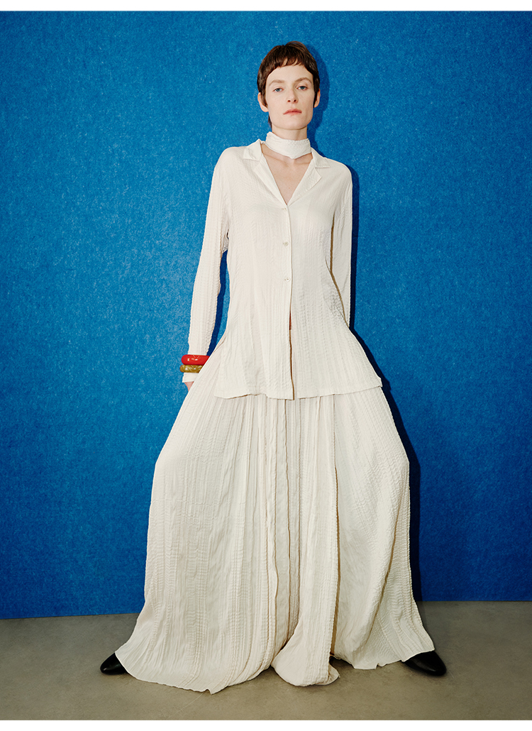 HIDEMI 进口可再生纤维冰川灰压褶纸片人西装领衬衫半裙套装