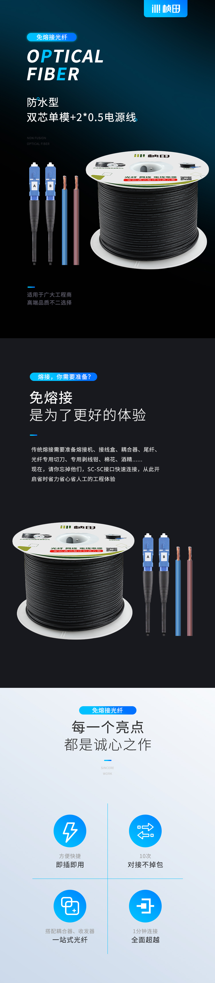 双芯单模+2*0.5电源线复合型防水免熔接光纤光缆跳线 SC-SC 5605/5610/5615/5620/5625/5630