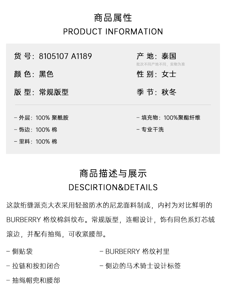 BURBERRY 巴宝莉 女士绗缝尼龙派克棉服 黑色 8105107 A1189