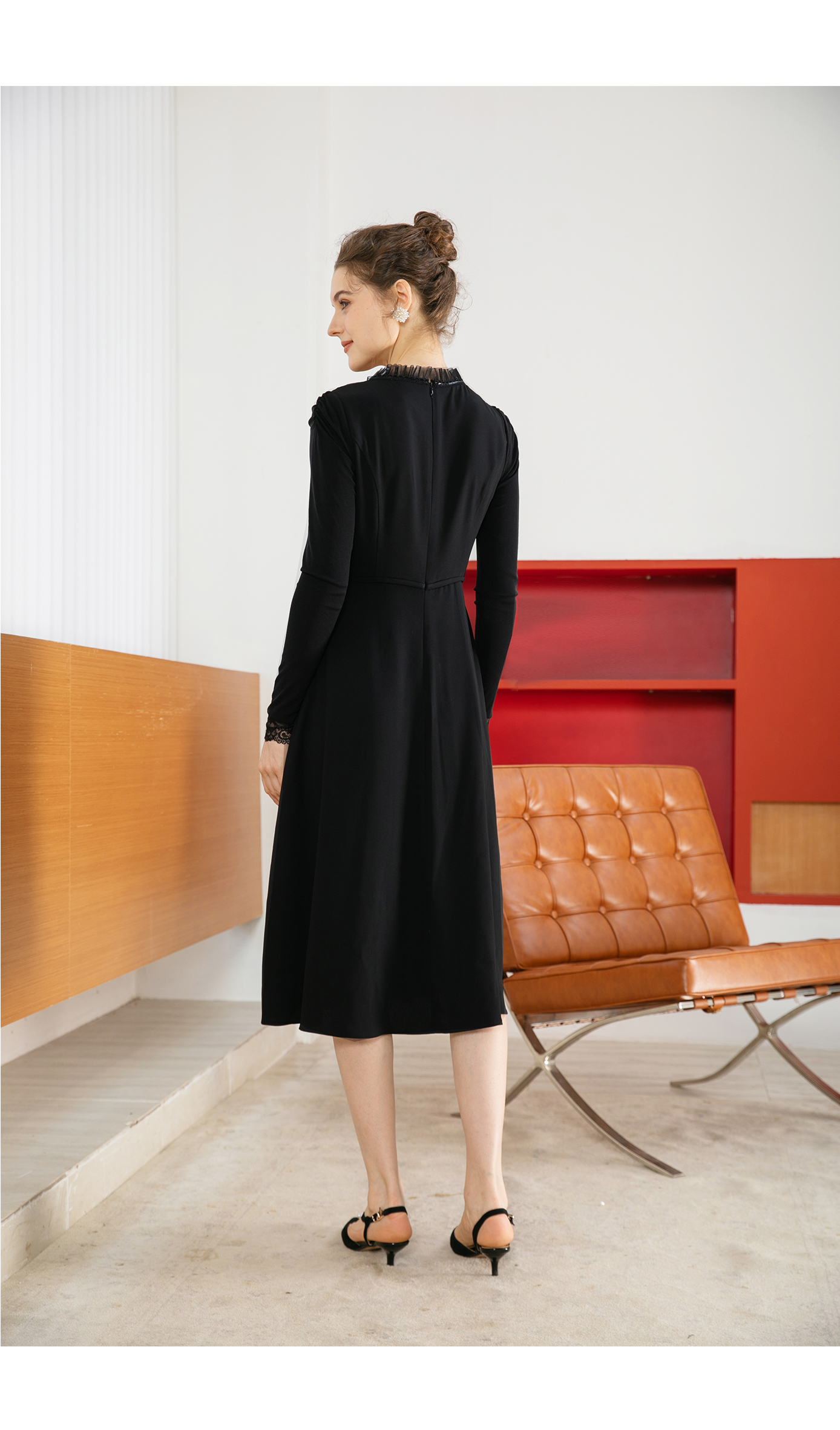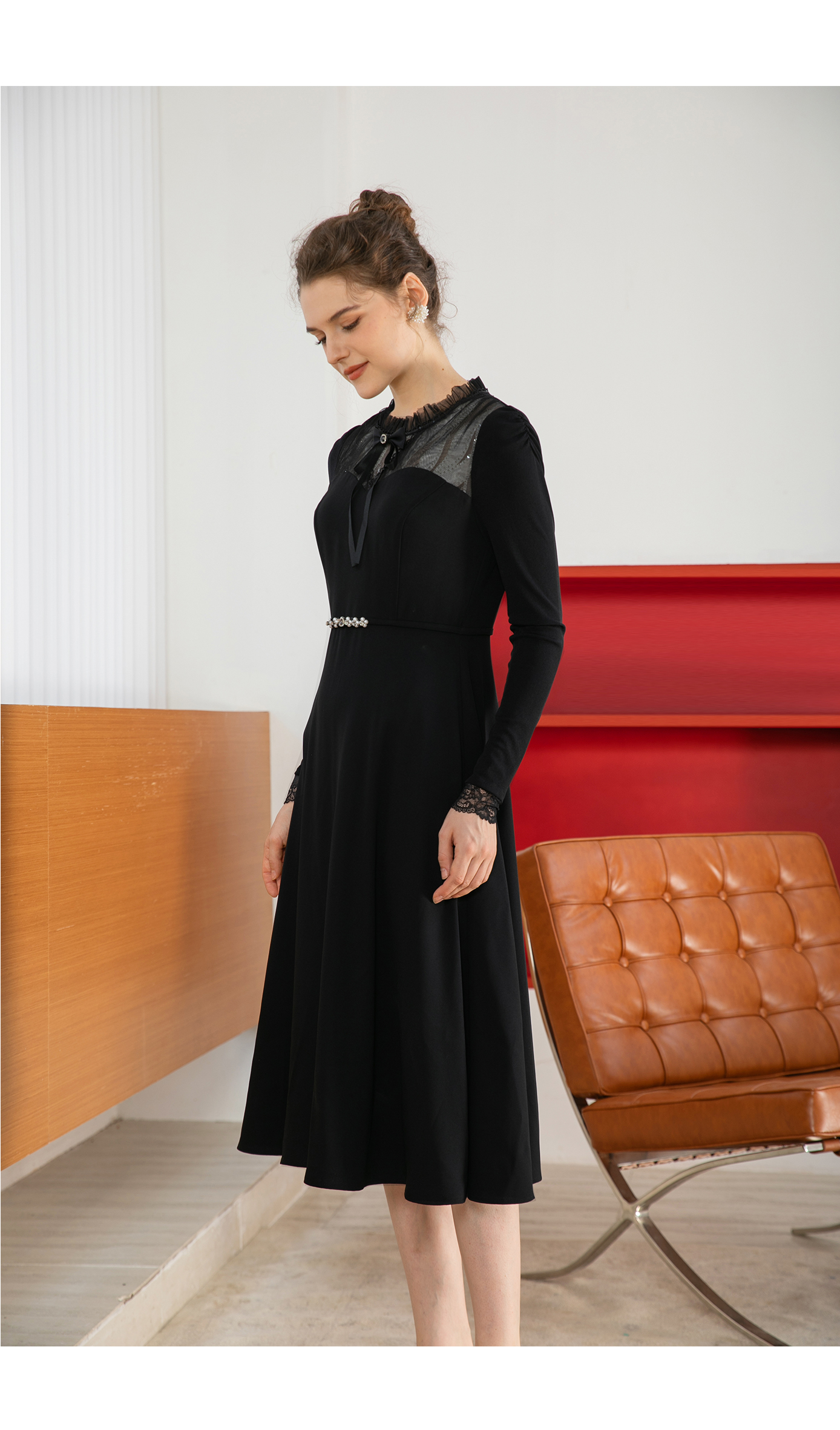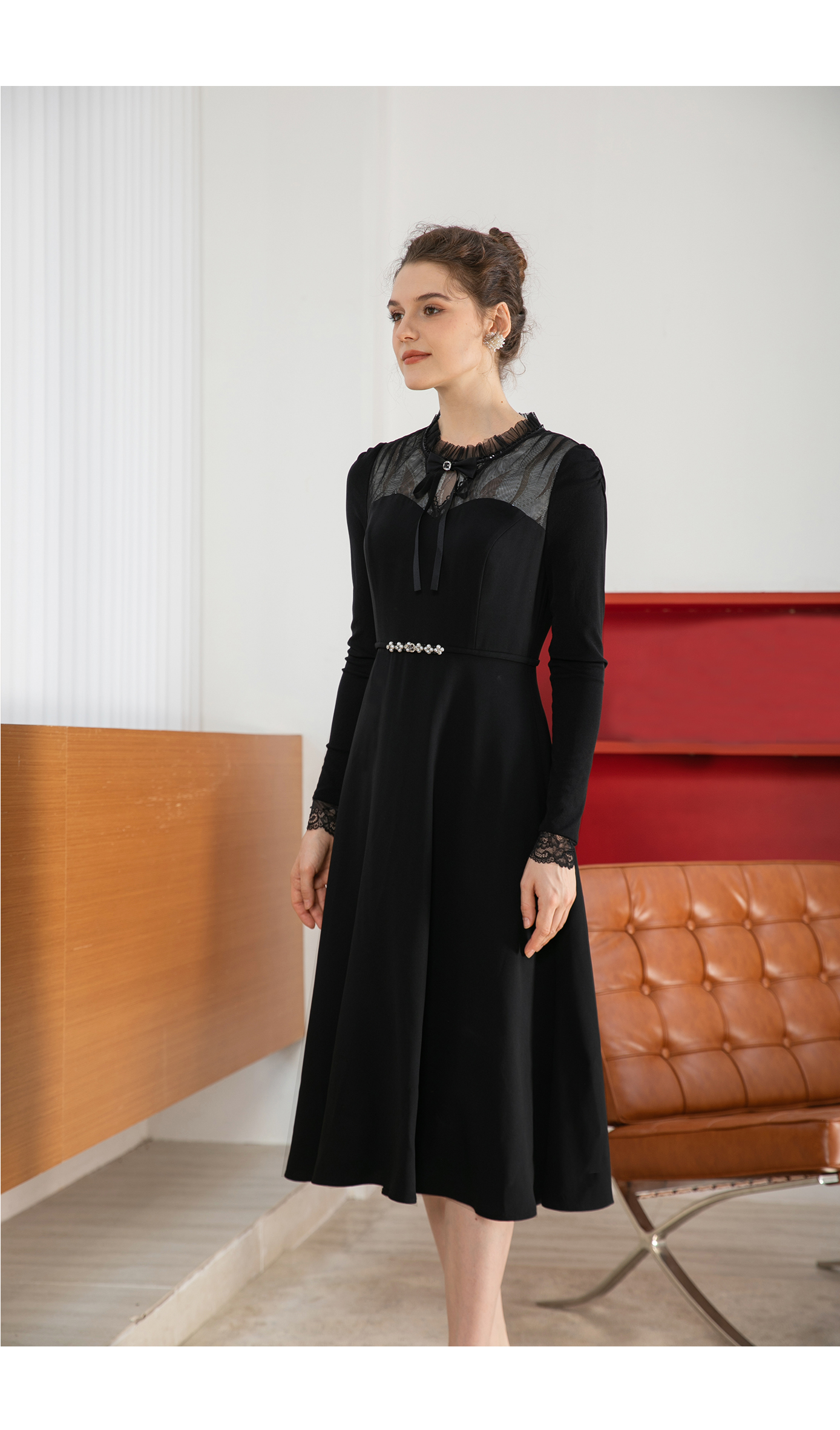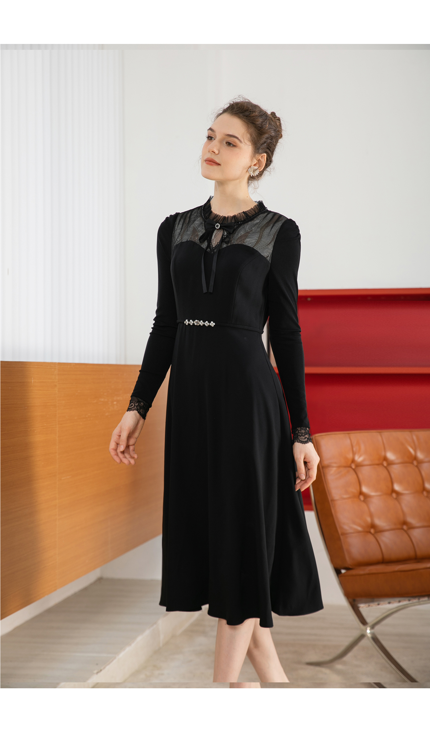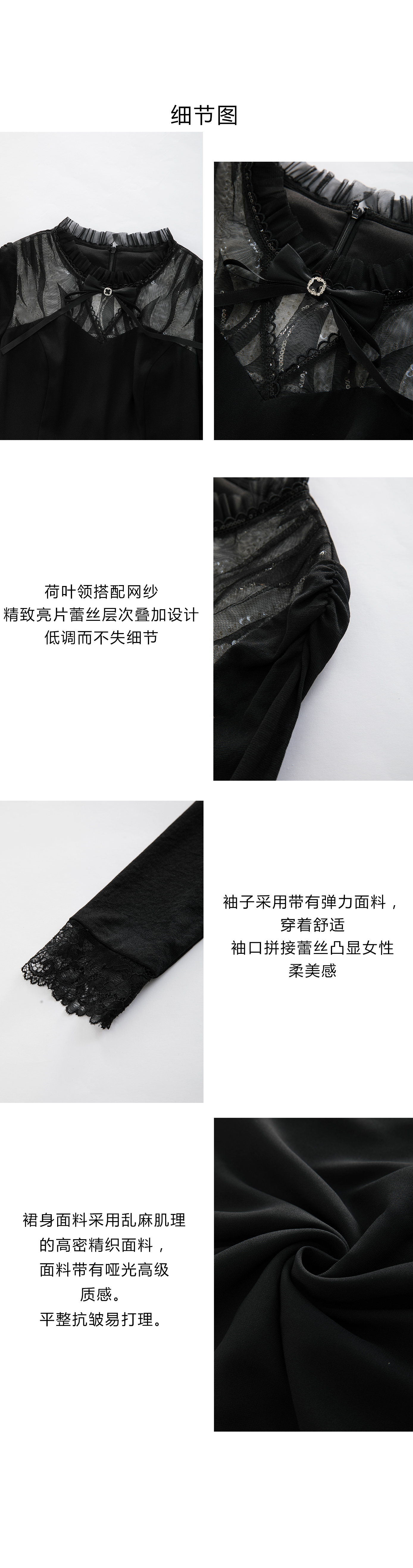司歌蕾丝拼接连衣裙长袖收腰内搭裙子秋A901227x