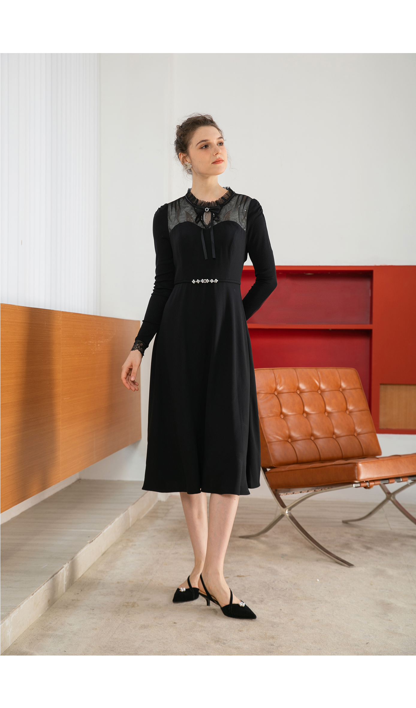 司歌端庄V领气质长袖连衣裙A881229