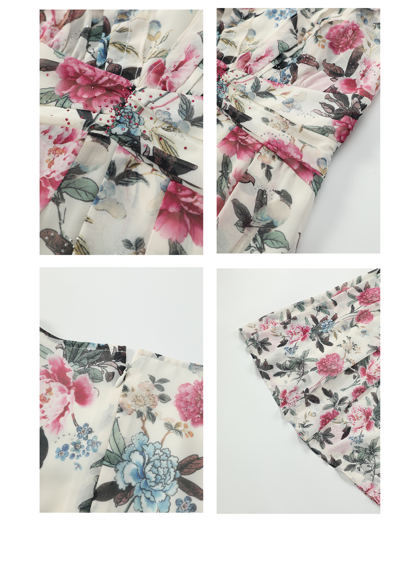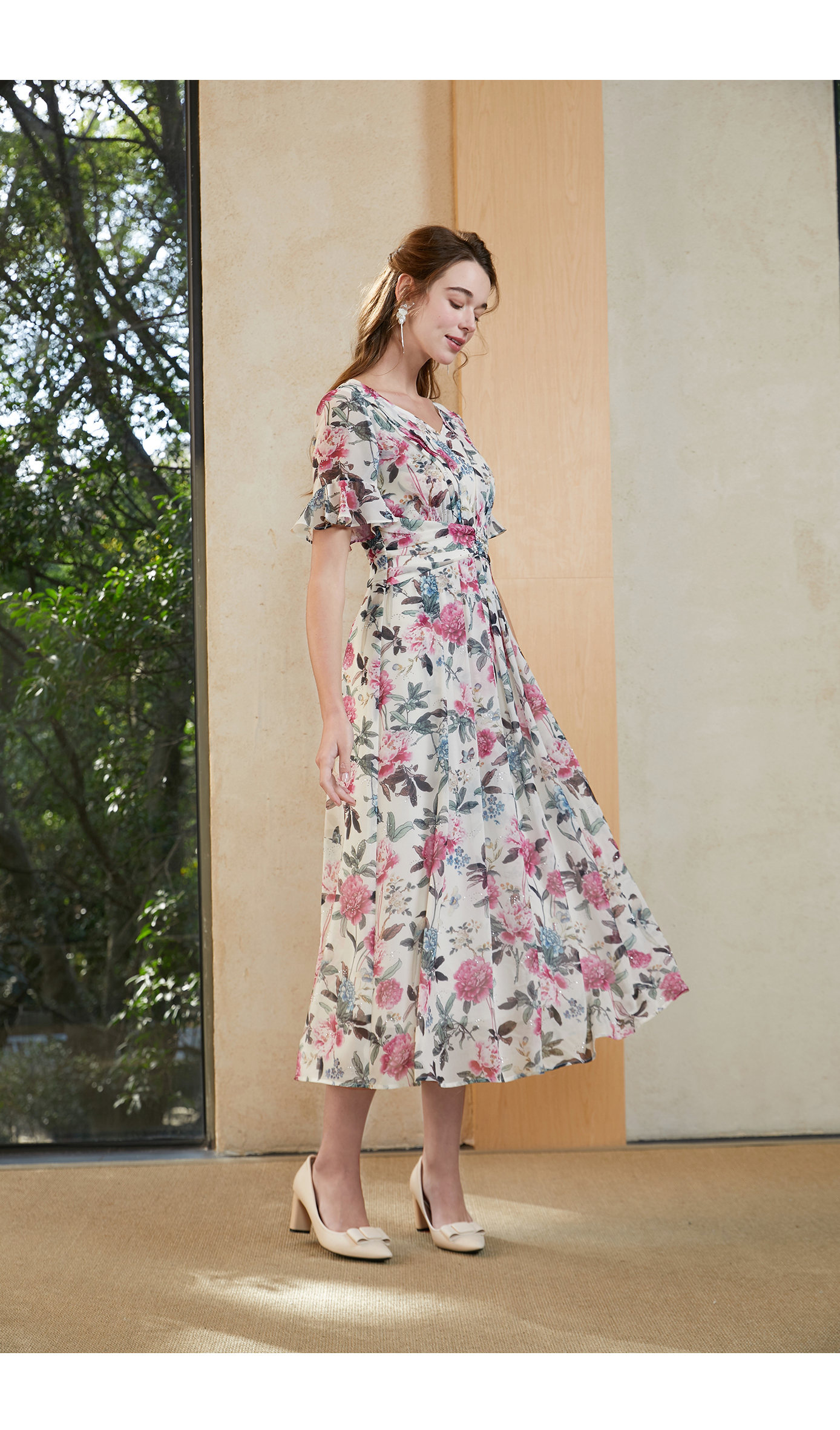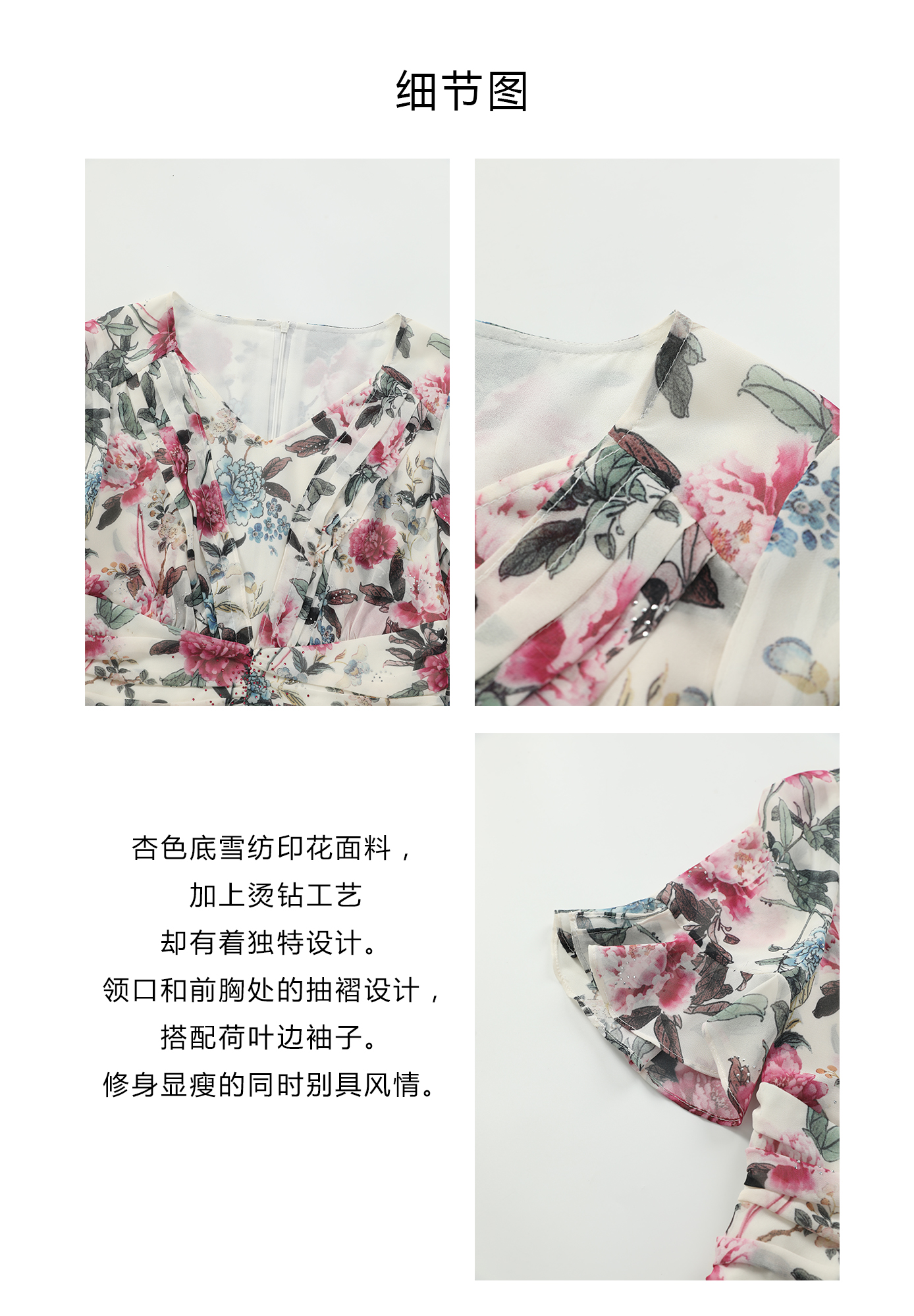 司歌雪纺v领收腰短袖连衣裙复古A911122X